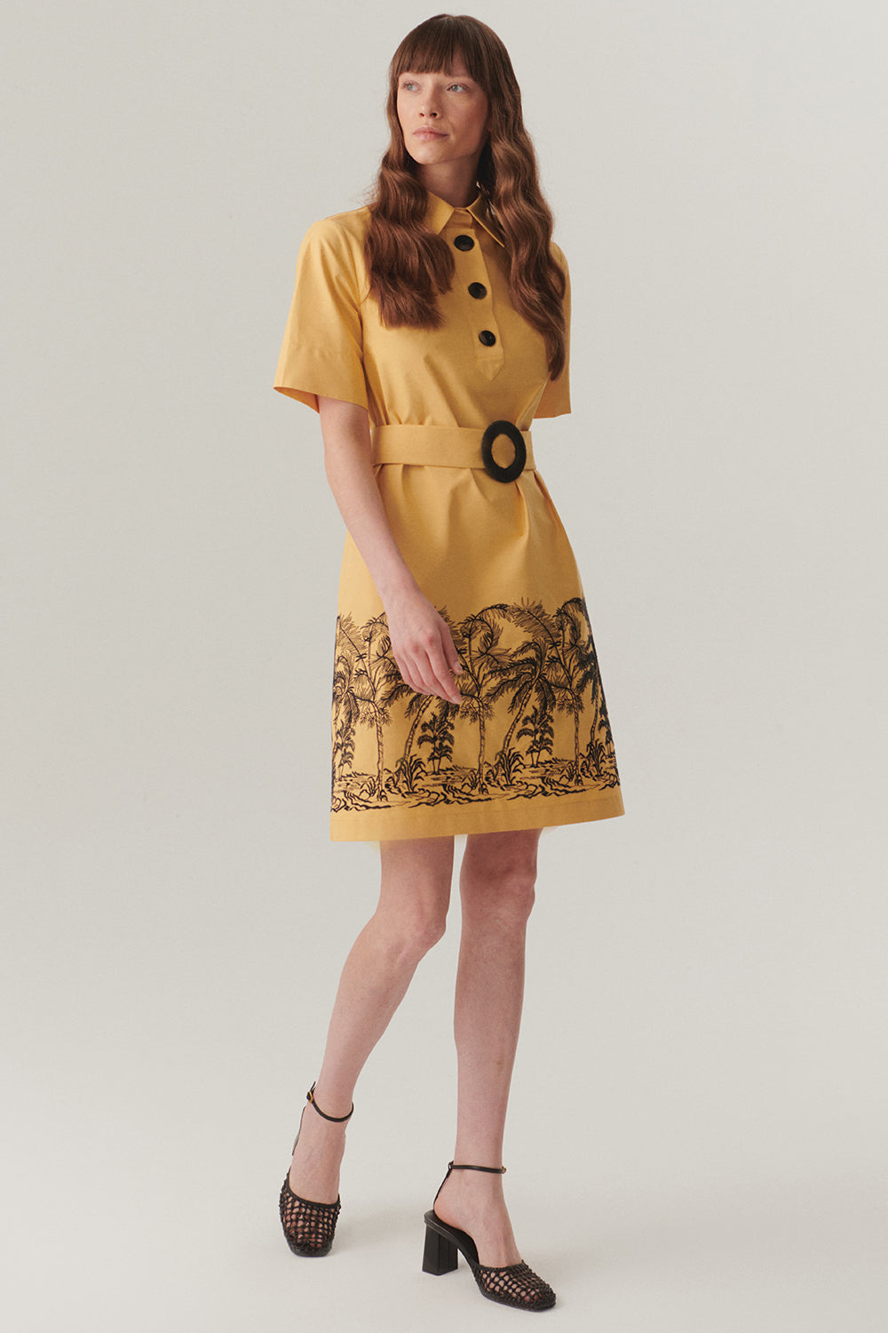 Gömlek Yaka Kemerli Etek Uçları Desenli Pamuklu Diz Üstü Elbise