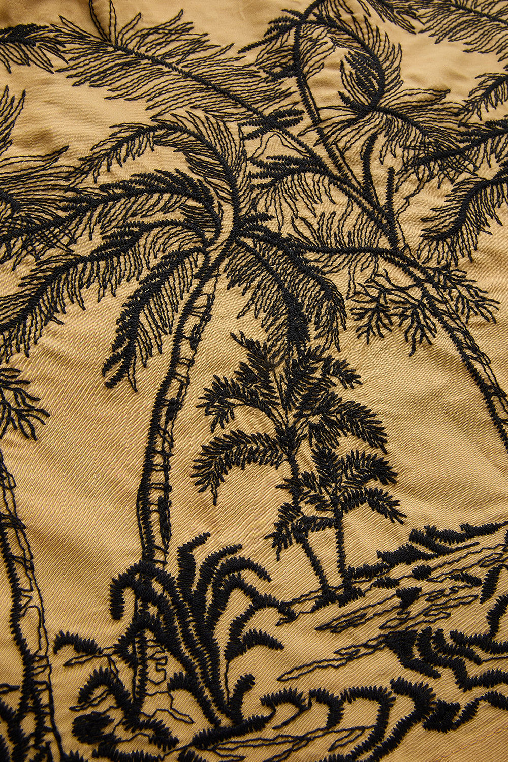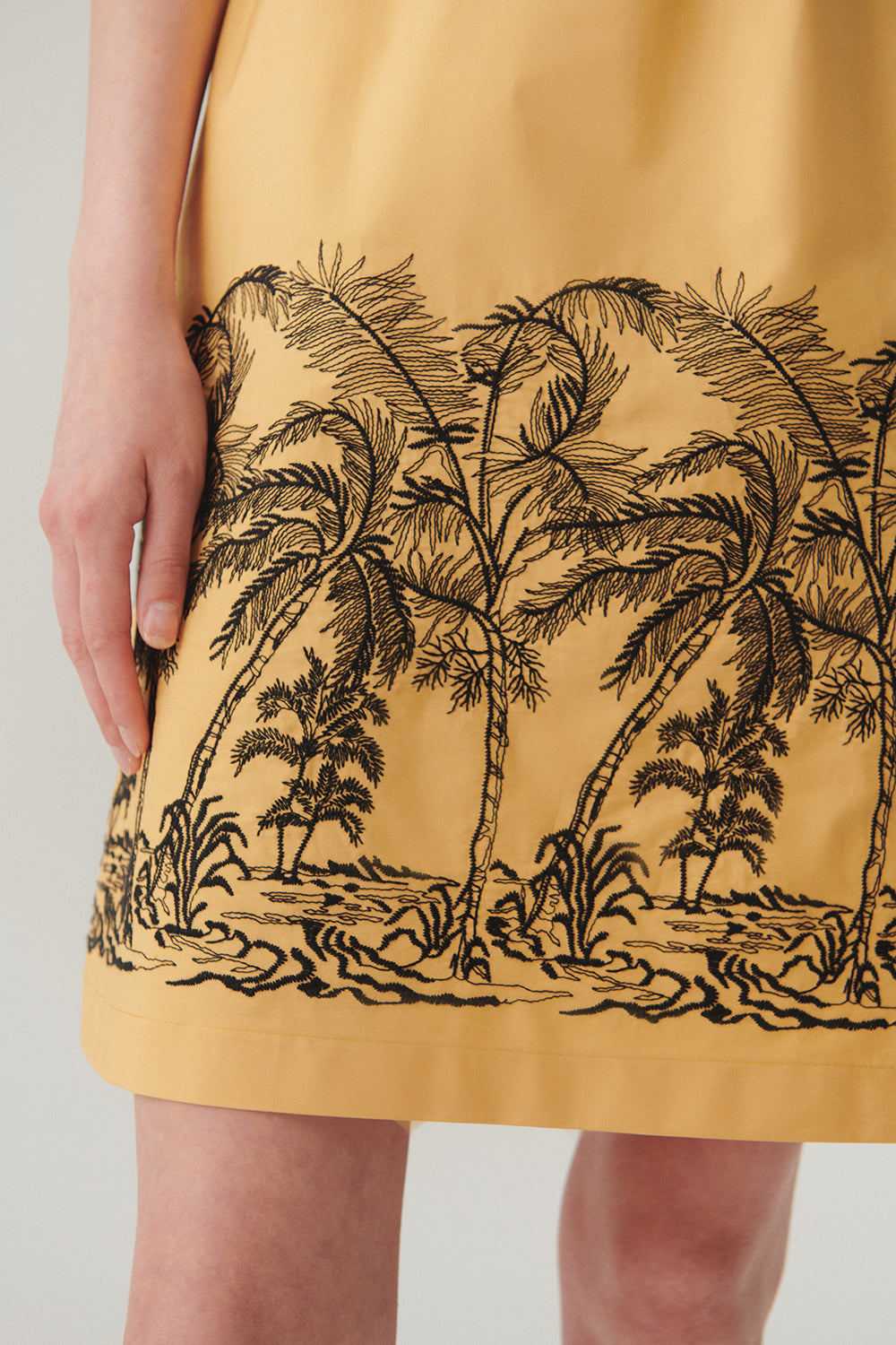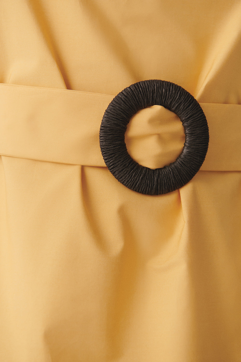 Gömlek yakasıyla klasik şıklığı öne çıkaran bu diz üstü elbise, saf pamuk dokusuyla gün boyu konfor sunuyor. Etek uçlarındaki çarpıcı desenler, tasarıma dinamik bir dokunuş katarken, beldeki kemer detayı siluetinizi zarifçe vurguluyor.