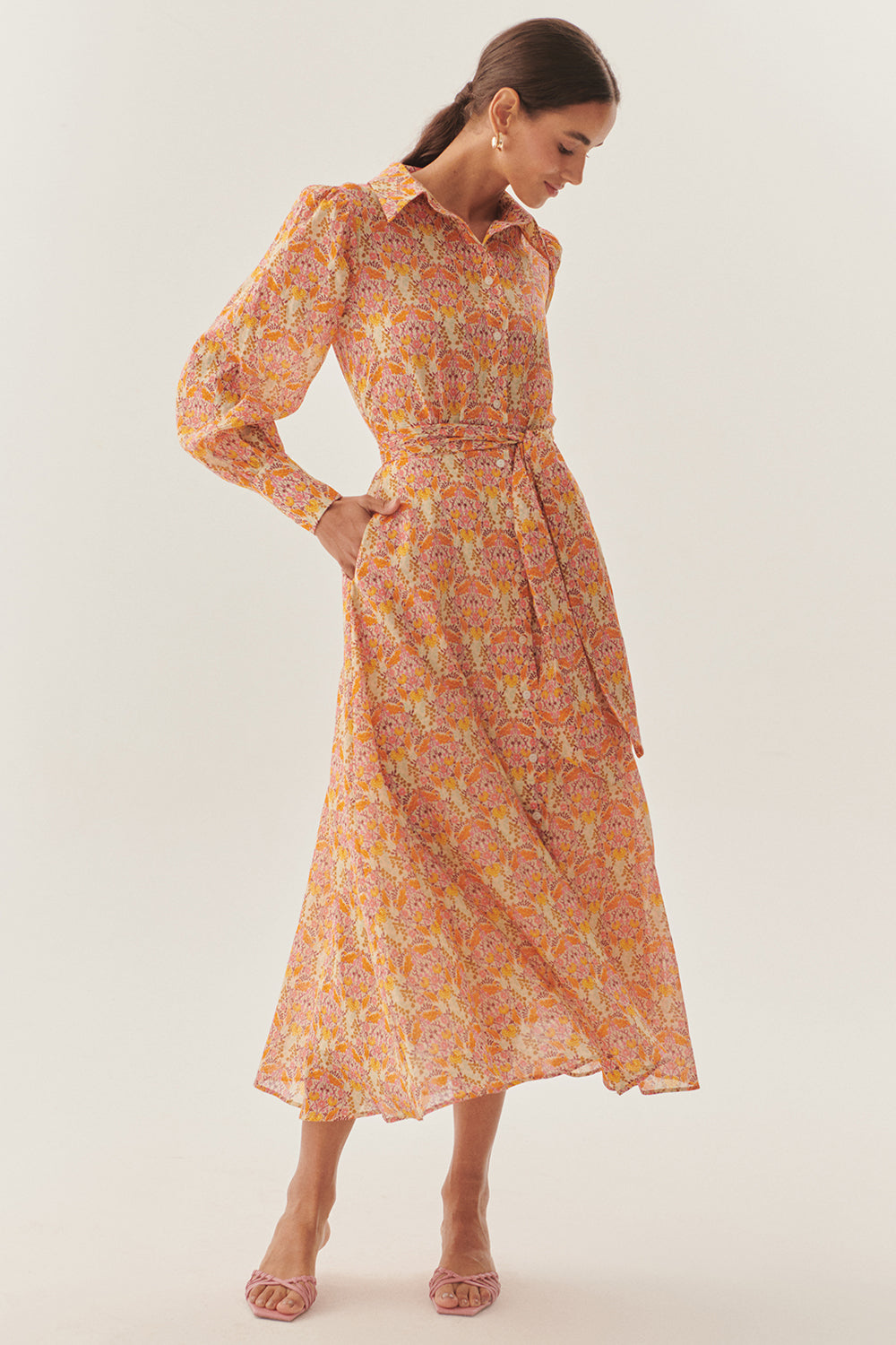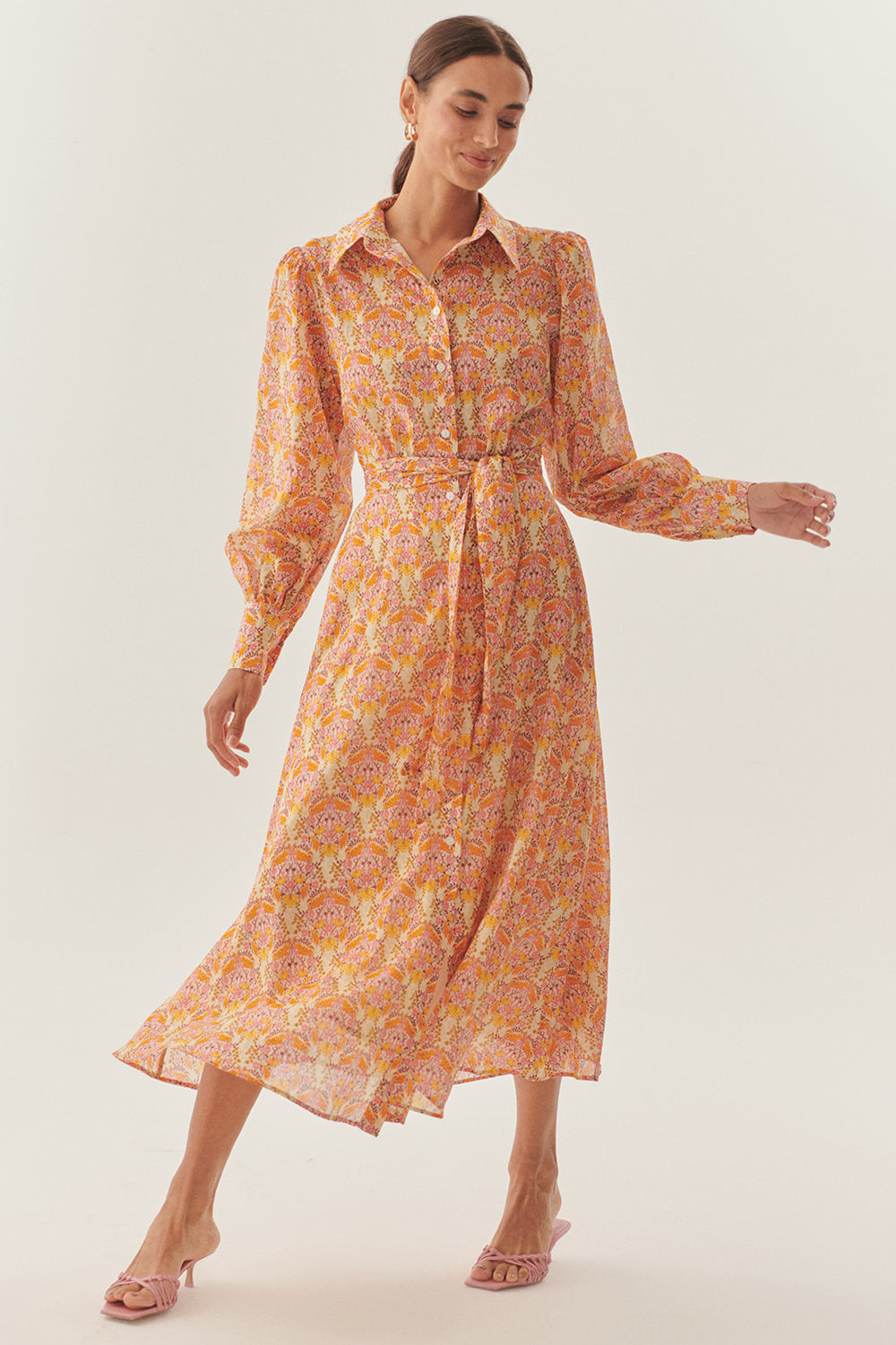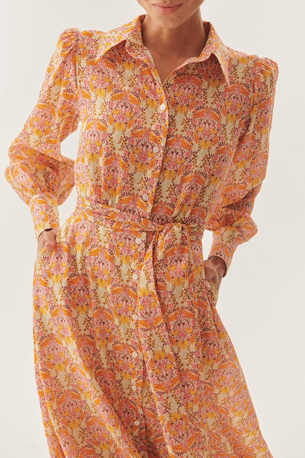 Zarif gömlek yakası ve uzun kollarıyla klasik şıklığı yansıtan bu midi boy elbise, çiçek desenleriyle romantik bir hava yaratıyor. Beldeki kuşak detayı, vücudunuza uyum sağlayarak feminen bir silüet oluşturmanıza yardımcı olur.