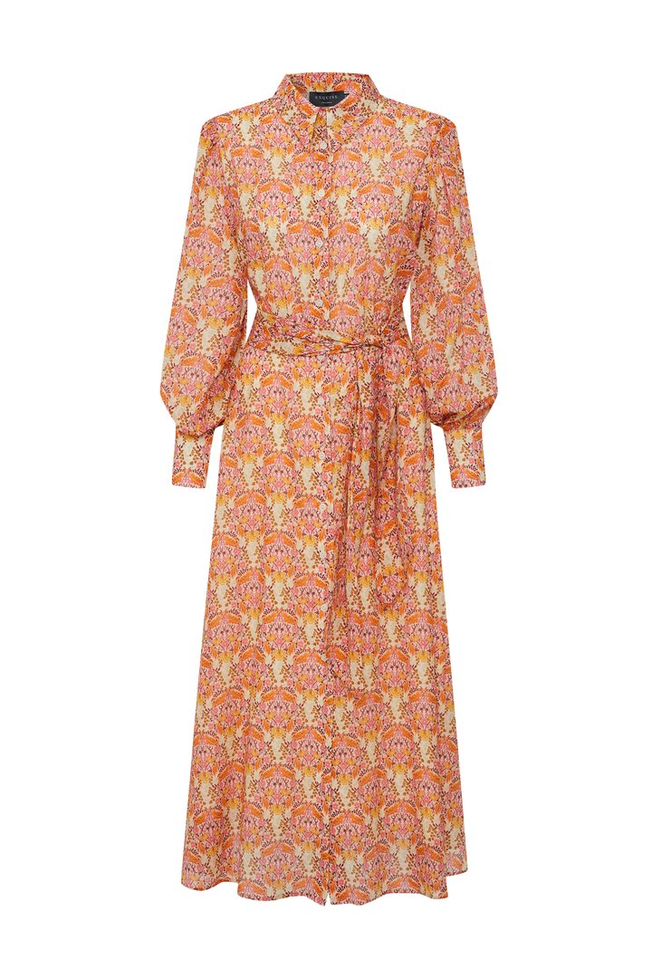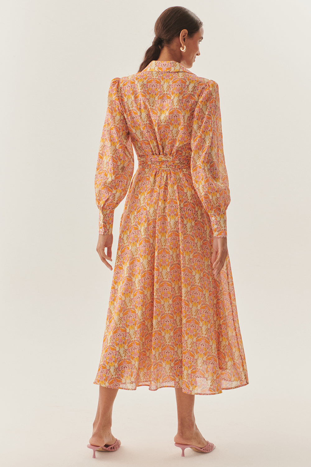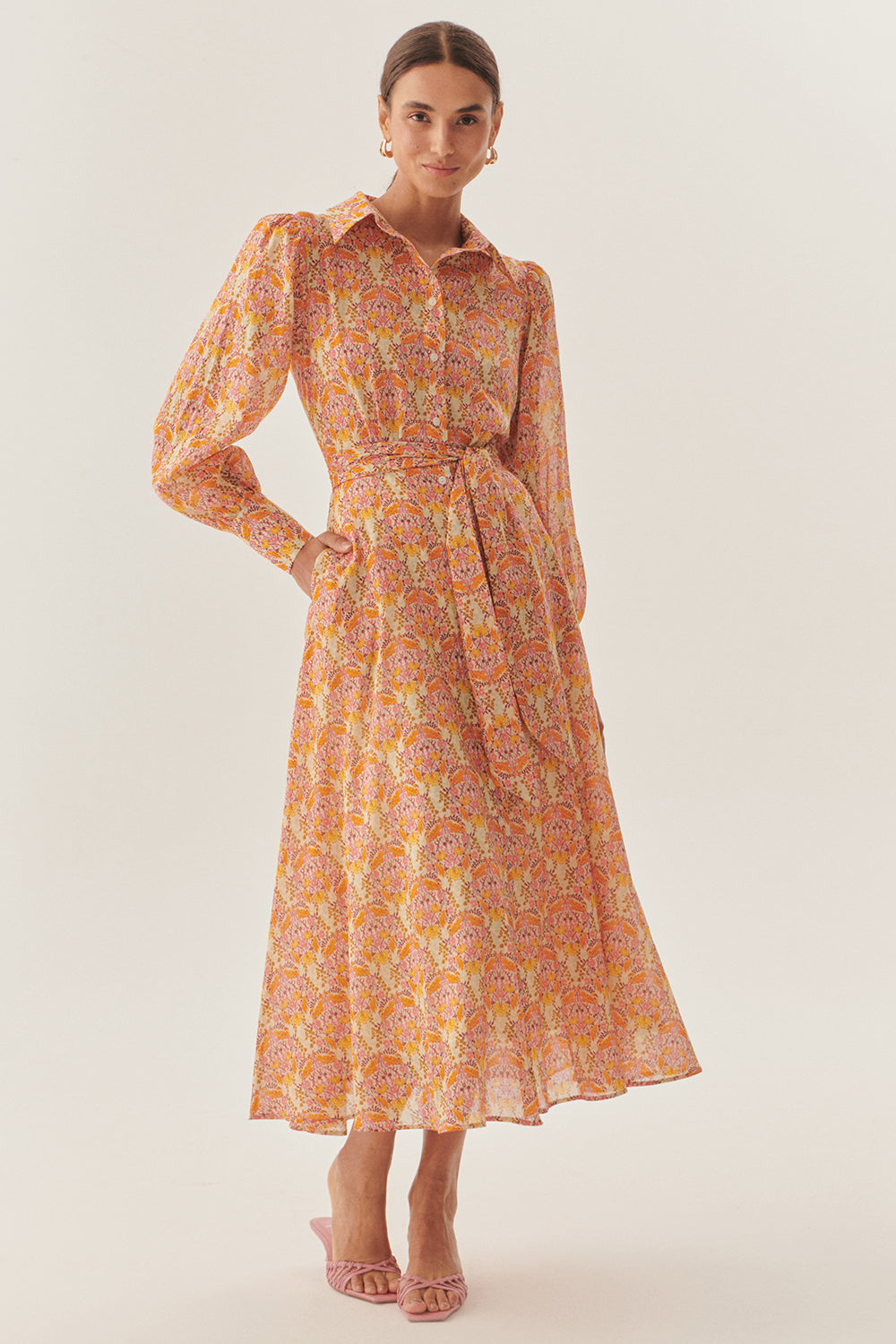 Zarif gömlek yakası ve uzun kollarıyla klasik şıklığı yansıtan bu midi boy elbise, çiçek desenleriyle romantik bir hava yaratıyor. Beldeki kuşak detayı, vücudunuza uyum sağlayarak feminen bir silüet oluşturmanıza yardımcı olur.