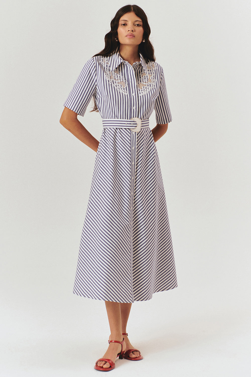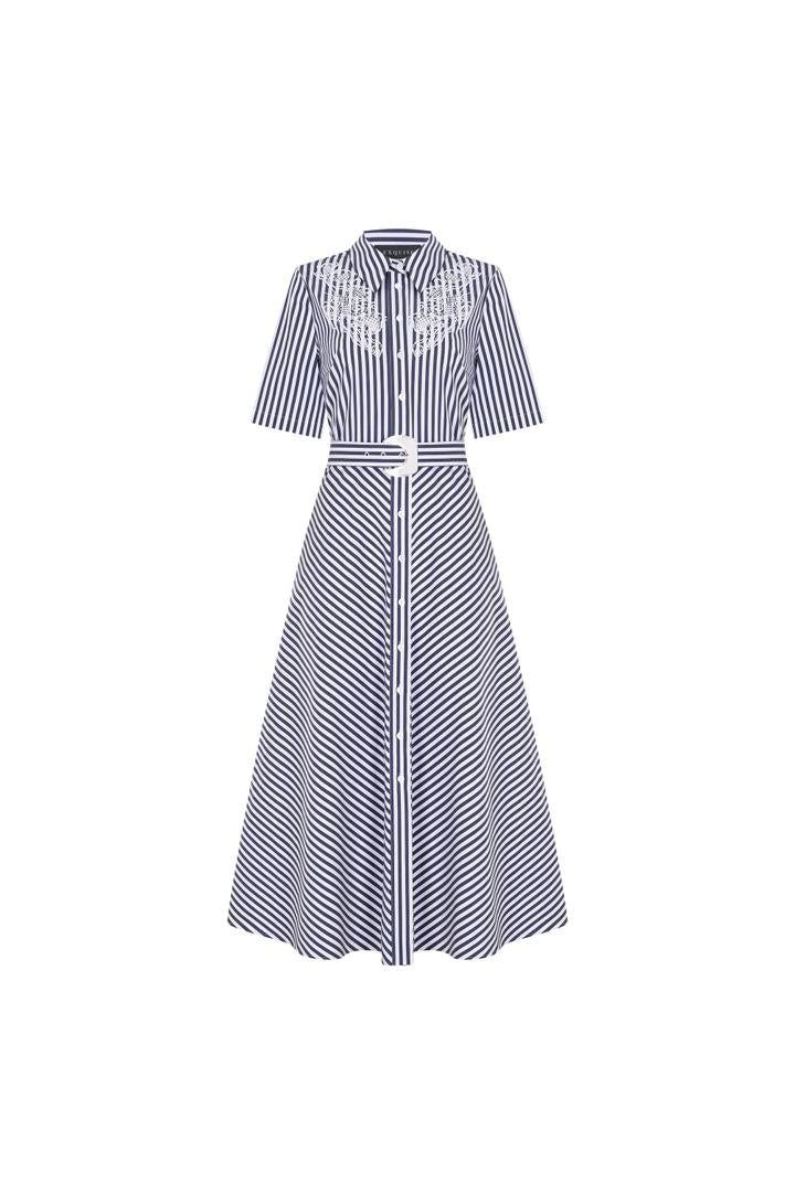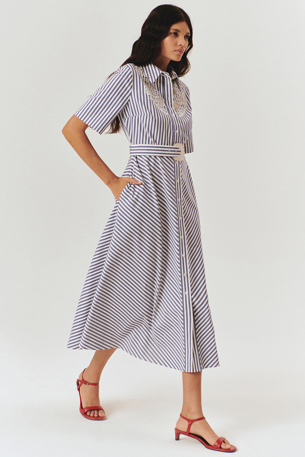 İŞleme Detaylı Kemerli Çizgili A Kesim Gömlek Elbise