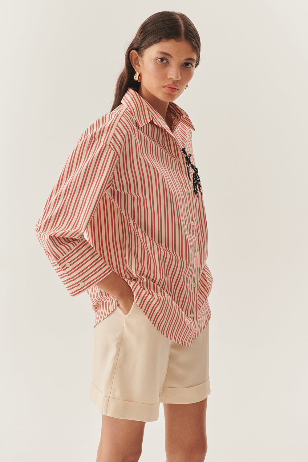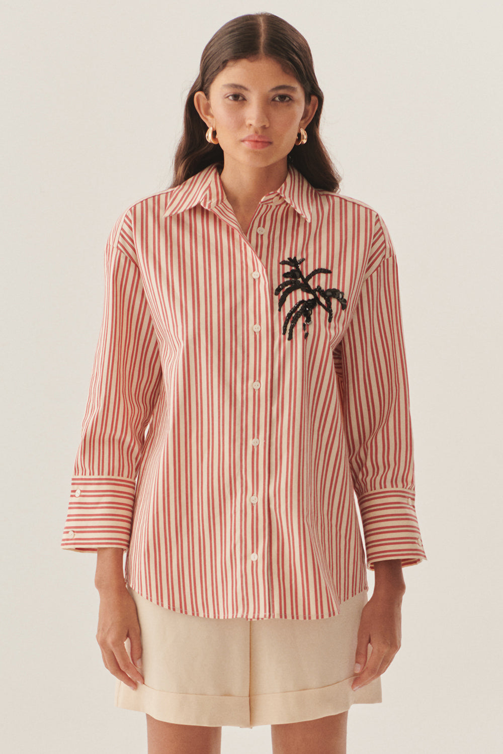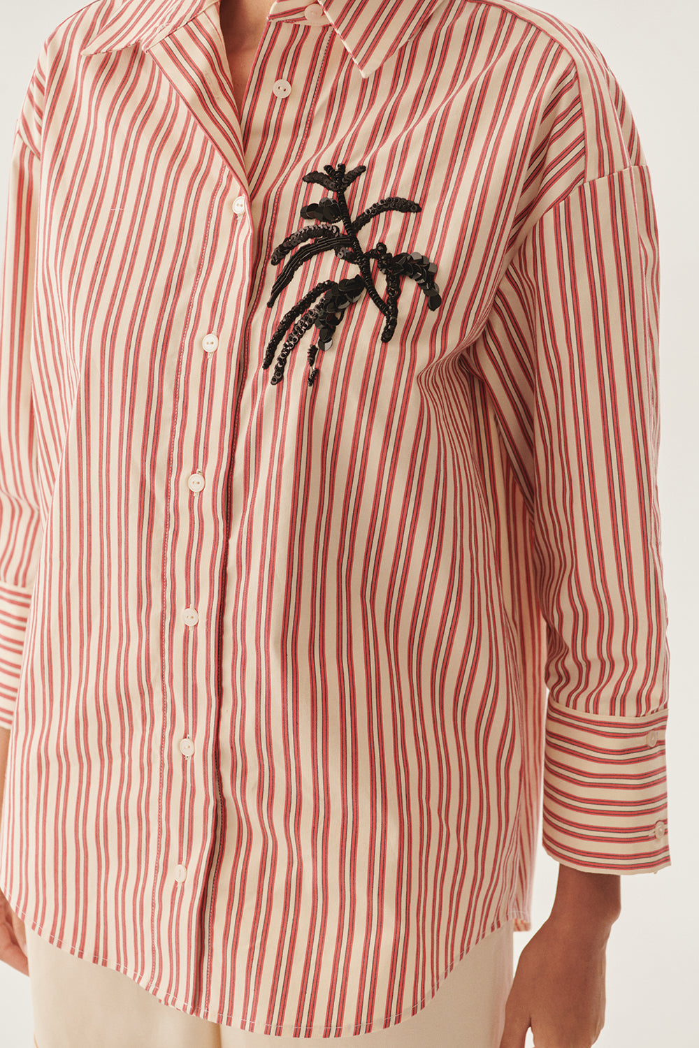 İŞleme Detaylı Kırmızı Çizgili Regular Gömlek