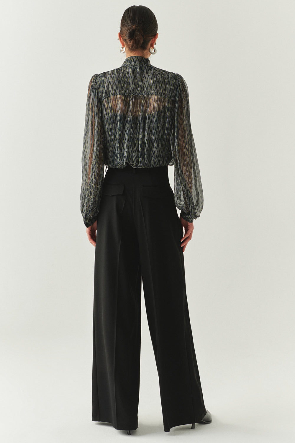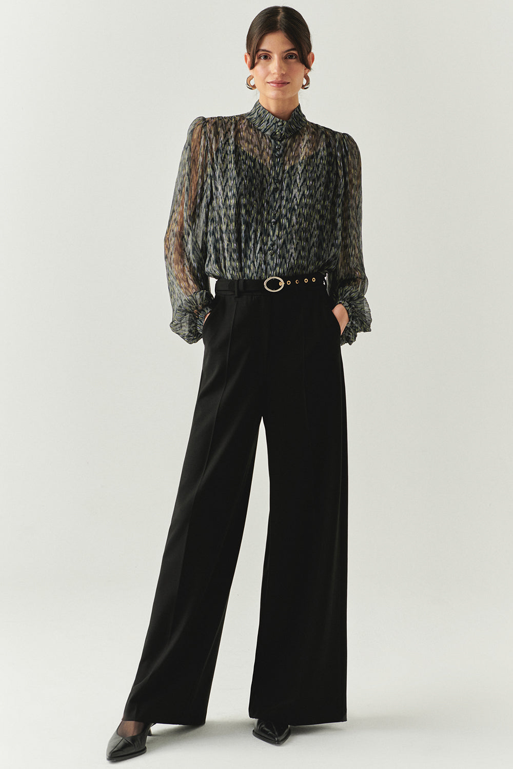 Zarif kemer detayı ve modern tokasıyla dikkat çeken bu geniş paça pantolon, cepli tasarımı sayesinde hem şıklık hem de işlevsellik sunar. Regular fit kesimi, gün boyu konfor sağlarken, akıcı kumaşı hareket özgürlüğünü artırır. Ofis stilinden özel davet kombinlerine kadar pek çok farklı ortamda sofistike bir görünüm elde etmenize yardımcı olur.