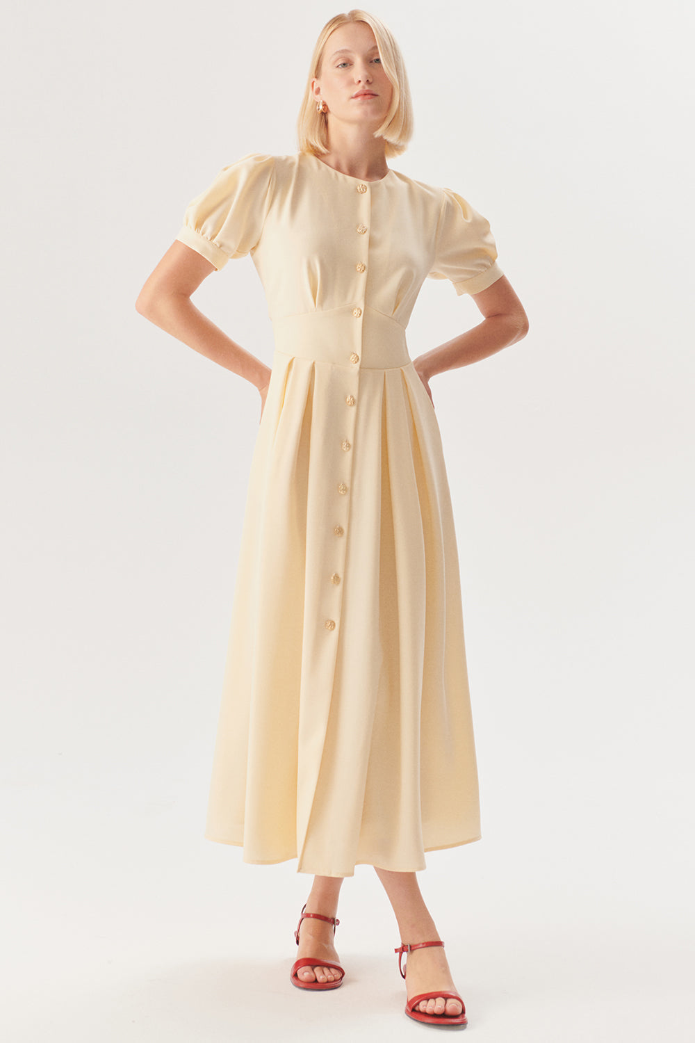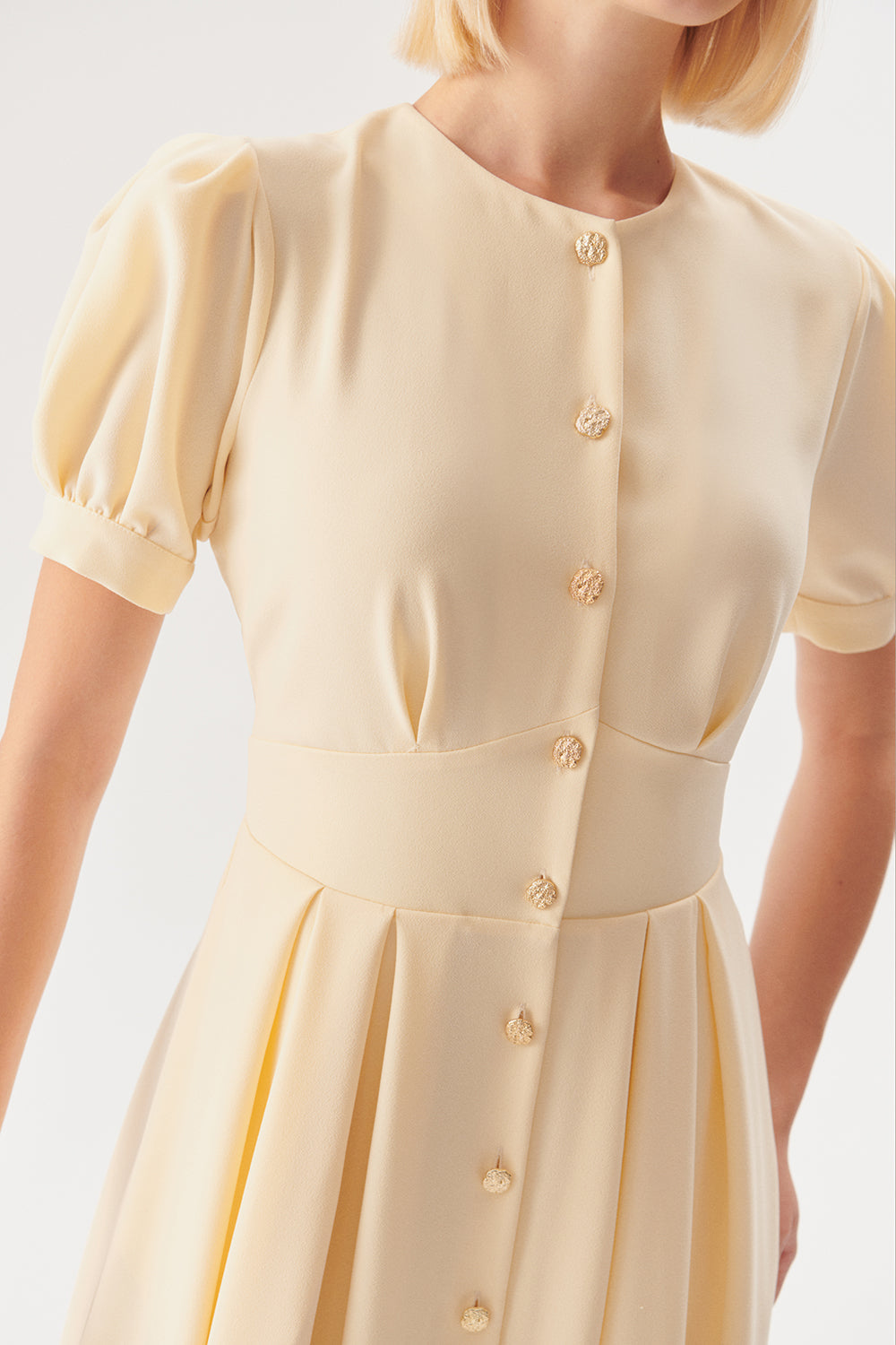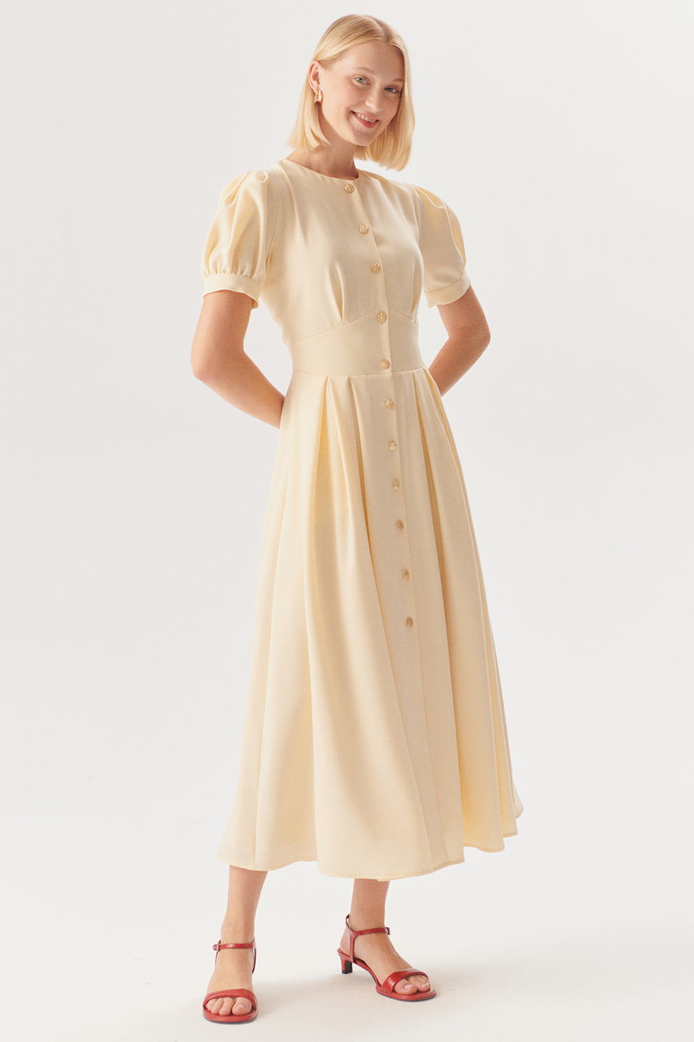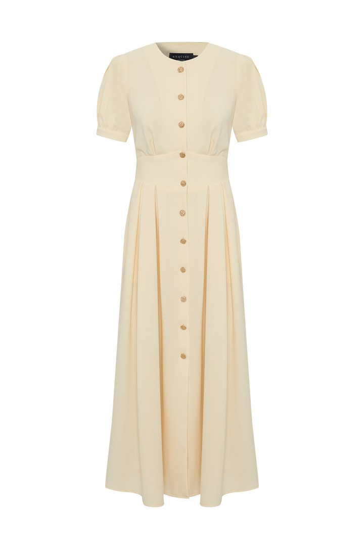 Kısa Kol Önden Düğmeli Bele Oturan Bej Elbise