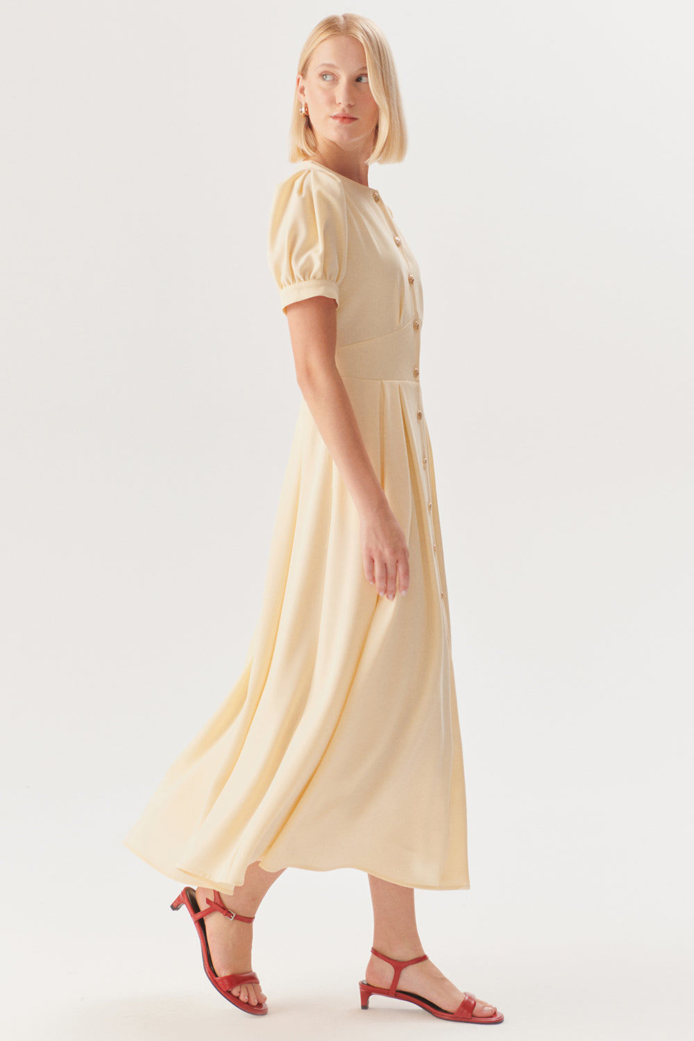 Zamansız bej tonuyla öne çıkan bu kısa kollu elbise, önden düğmeli tasarımı ve bele oturan kesimiyle feminen bir silüet sunuyor. Hafif kumaşı sayesinde gün boyu rahatlık sağlarken, minimal detaylarıyla her tarza kolayca uyum sağlıyor.