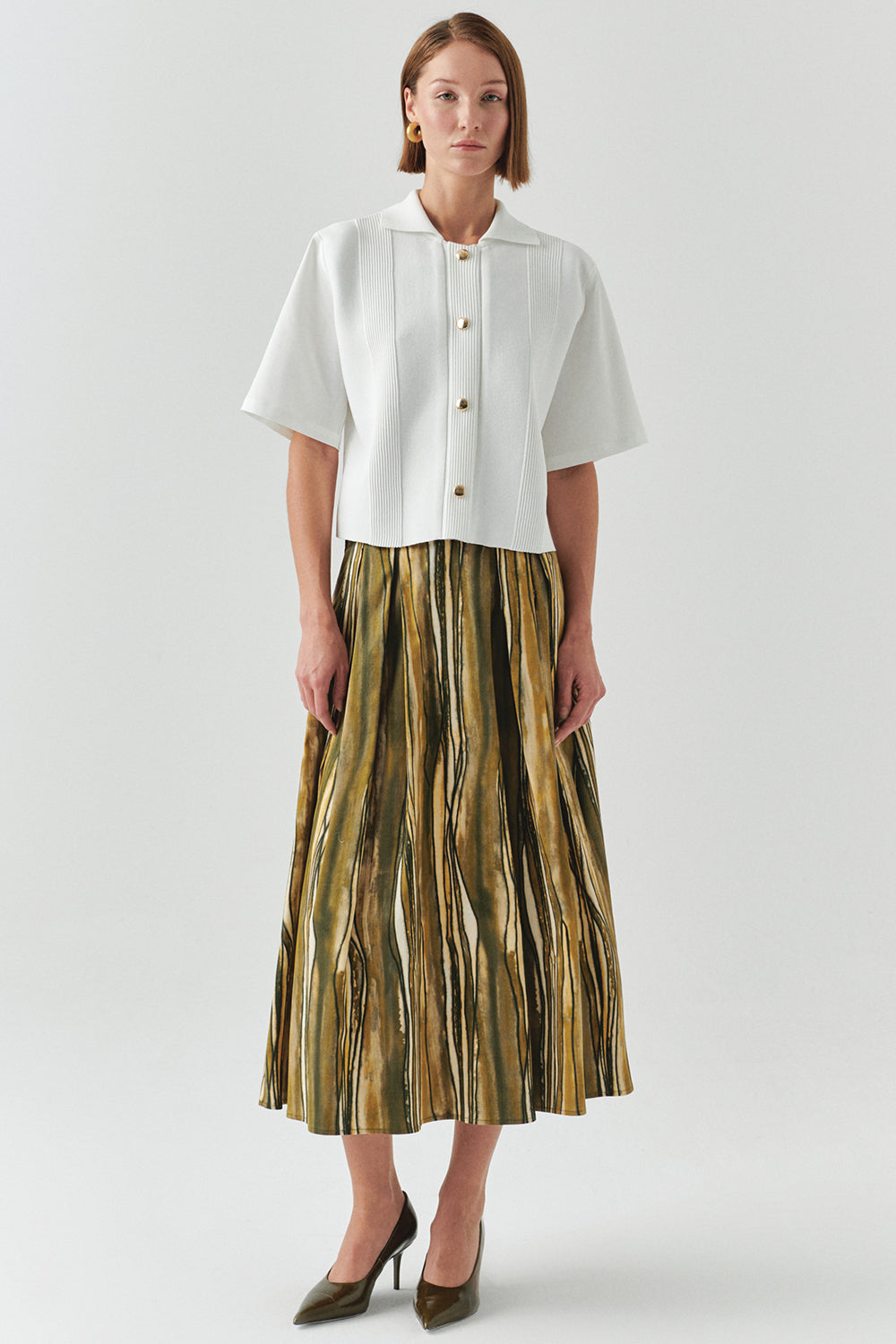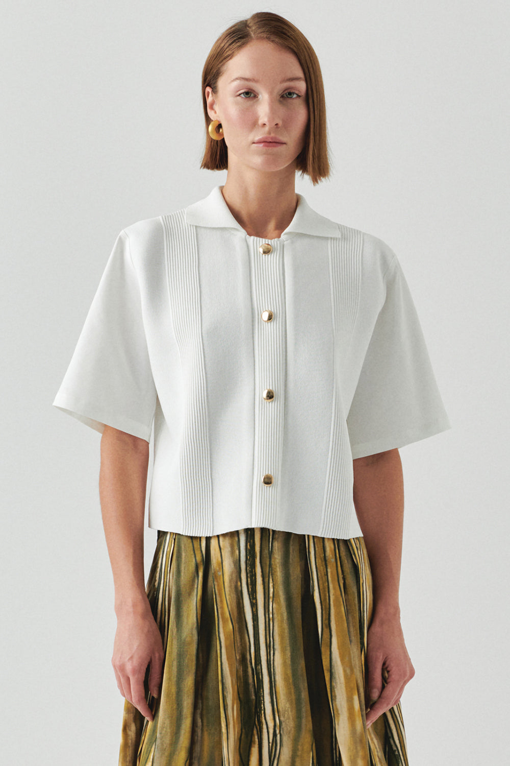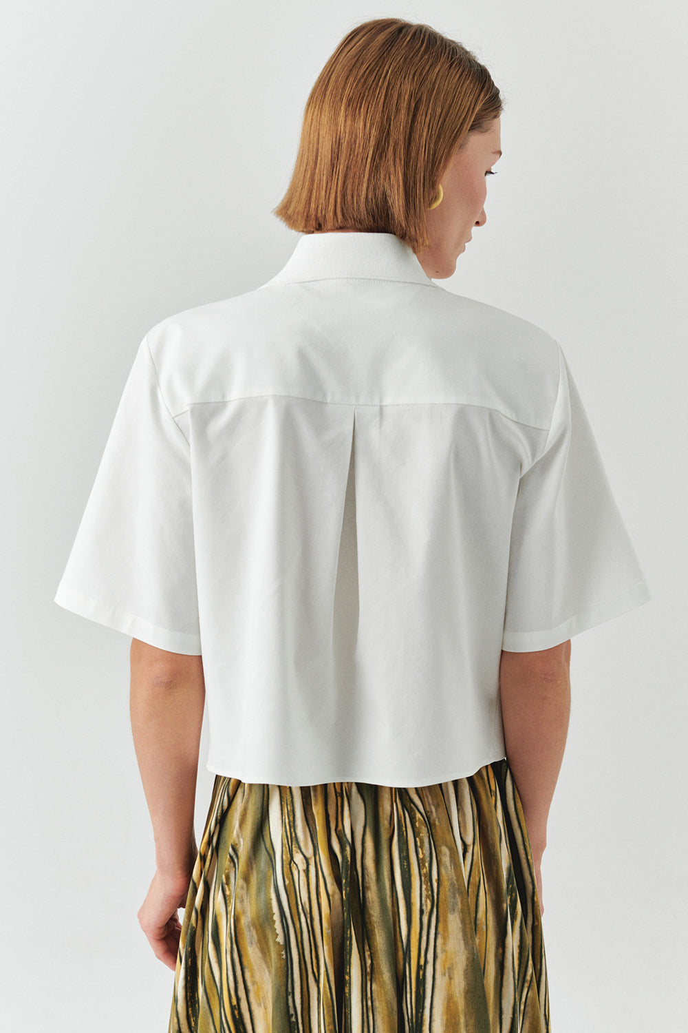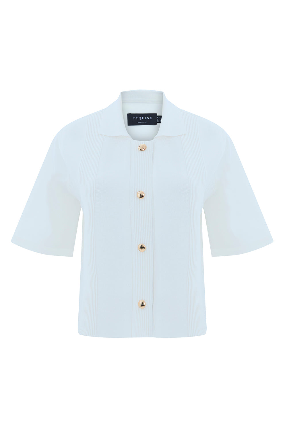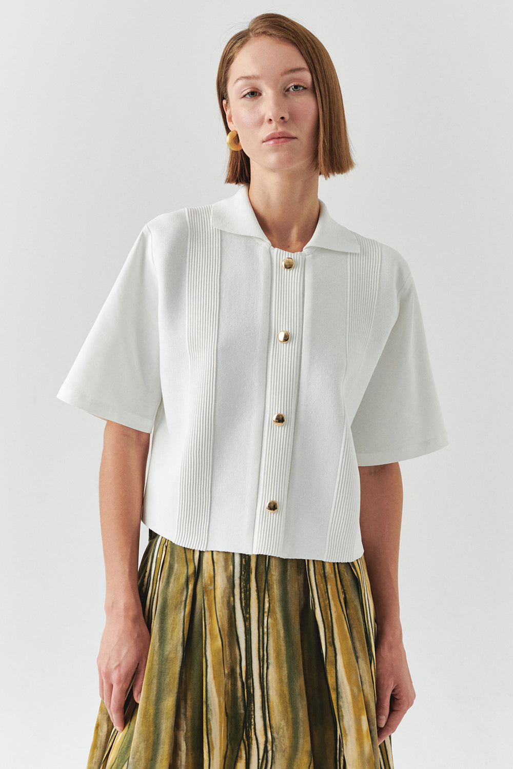 Minimalist tasarımı ve dokuma kumaşın zarif dokusuyla öne çıkan bu kısa kollu gömlek, regular kesimi sayesinde gün boyu rahatlık sunar. Önde yer alan gold düğme detayları, modern sadeliğe şık bir dokunuş katar. Hem etek hem de pantolonlarla kolayca kombinlenebilen bu parça, gardırobunuzun çok yönlü ve zamansız seçeneklerinden biri olacak.