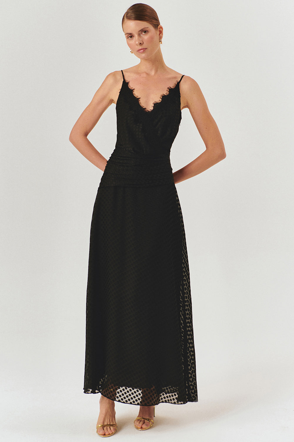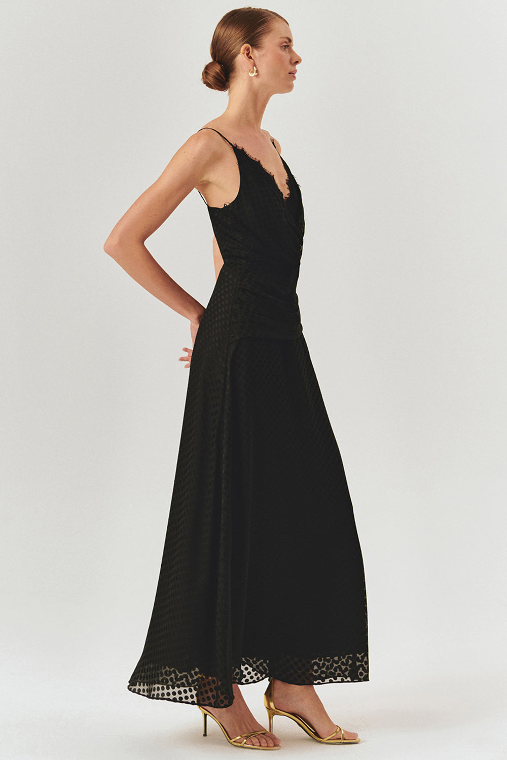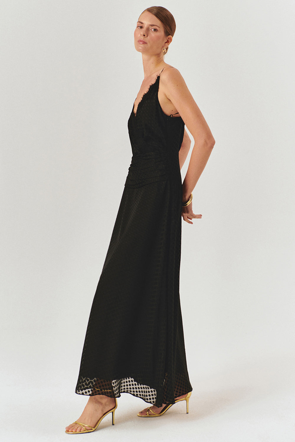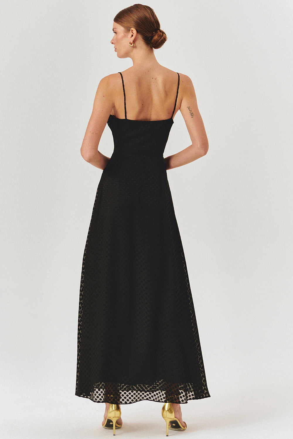 Puantiye Detaylı Bele Oturan Askılı Siyah Maxi Elbise