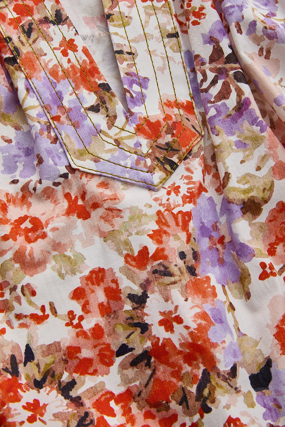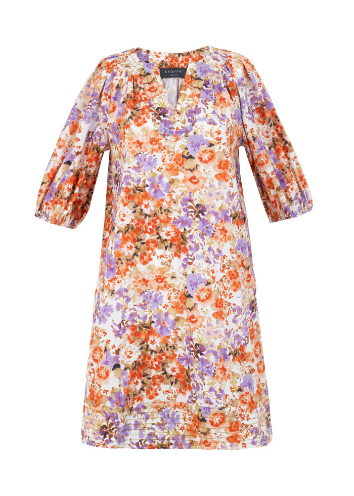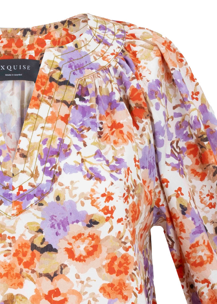 Saf Pamuk V Yaka Çiçek Desenli Rahat Kesim Elbise