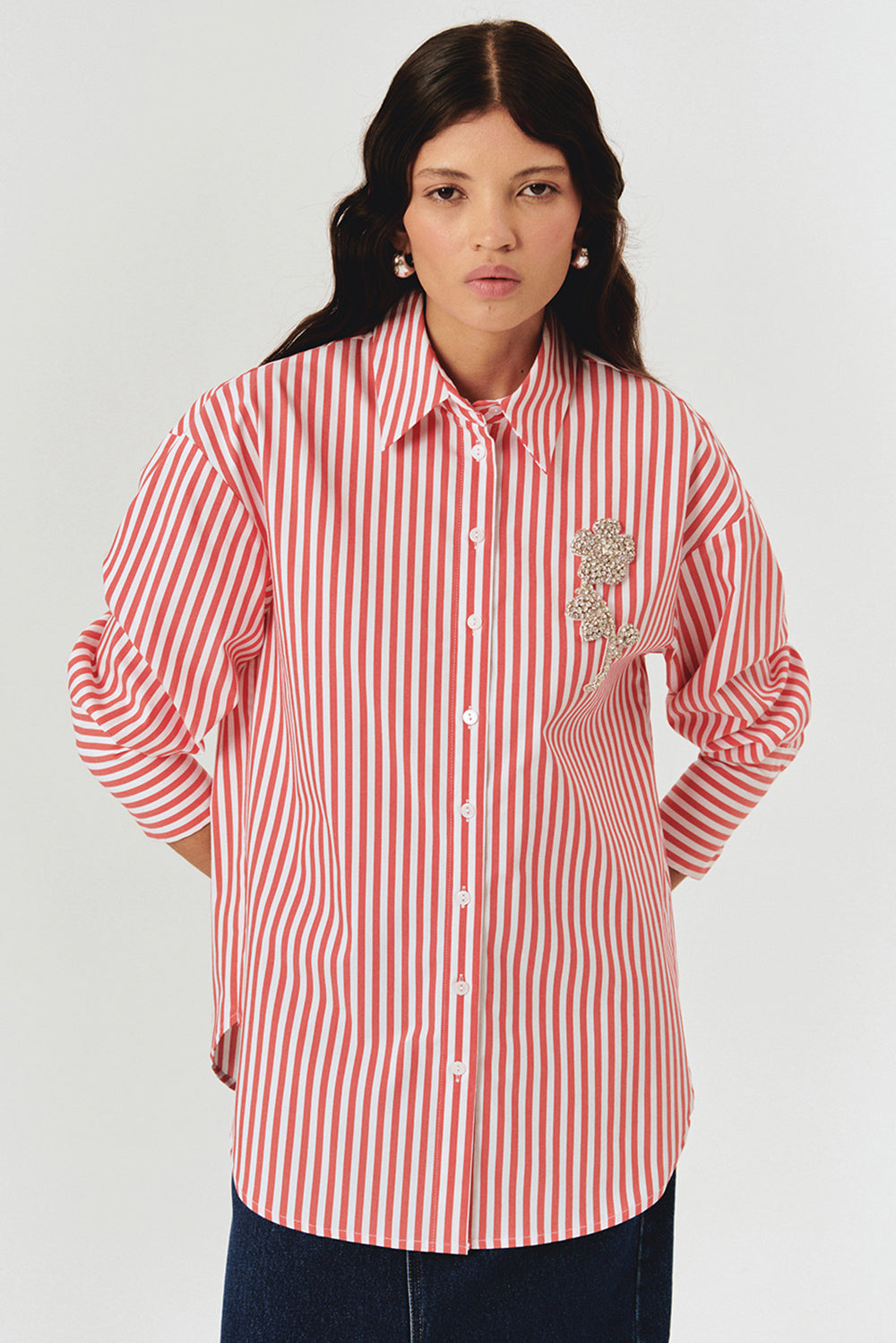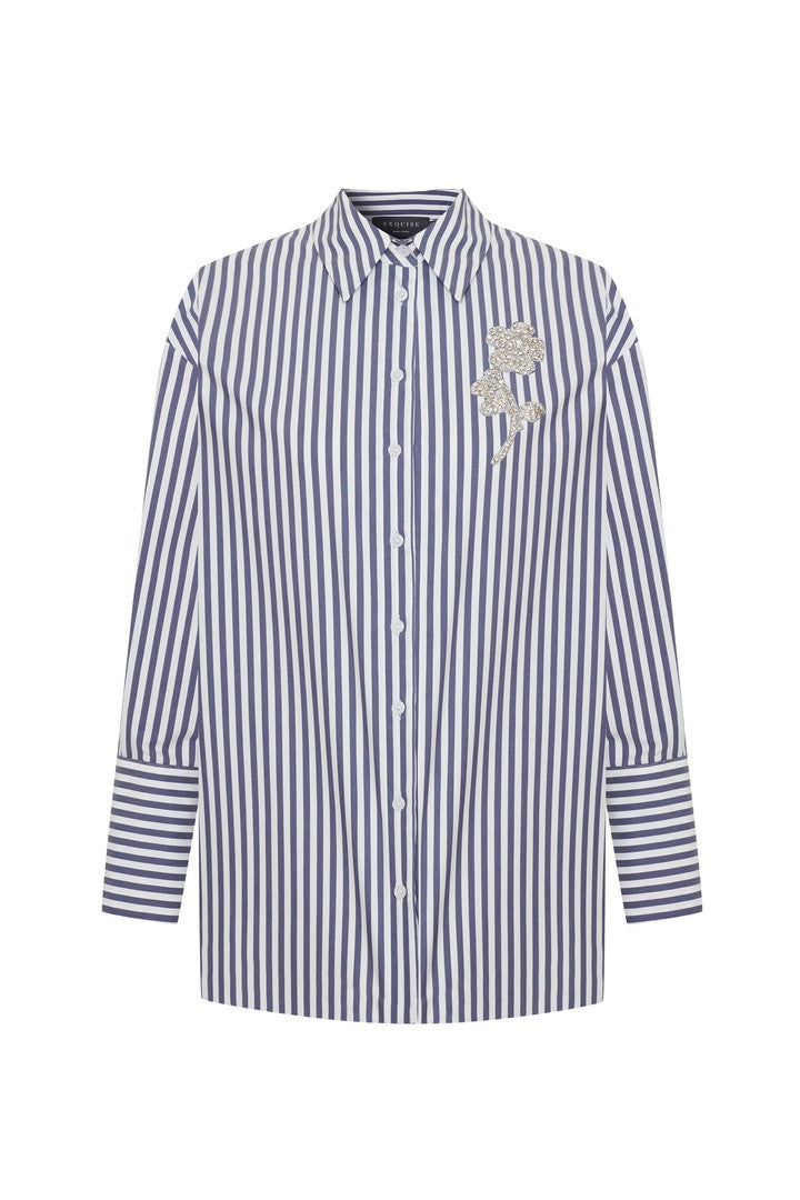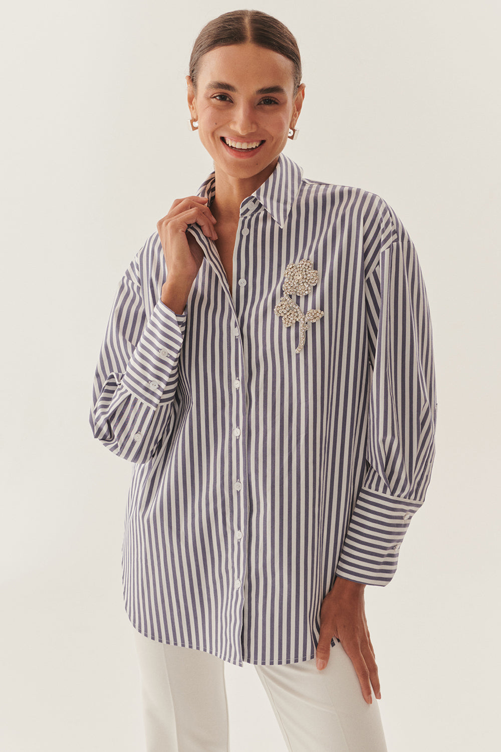 Taş İŞleme Detaylı Lacivert Beyaz Oversize Çizgili Poplin Gömlek