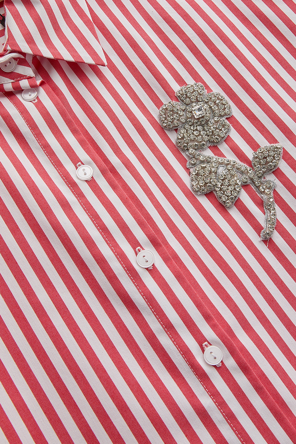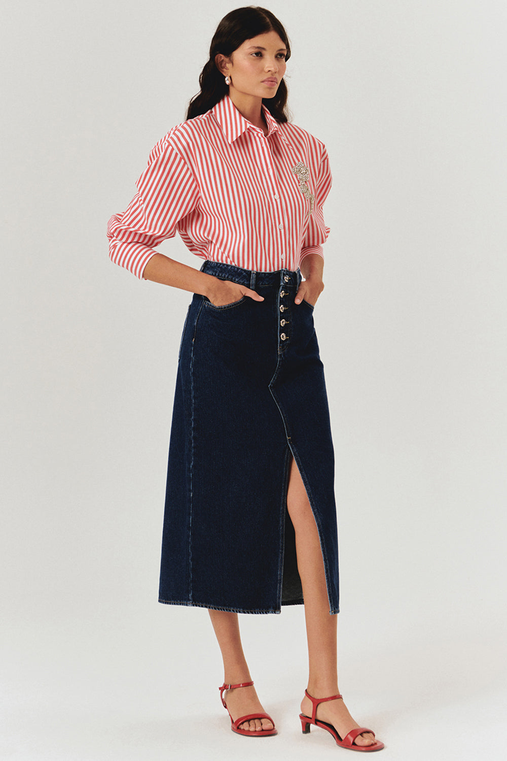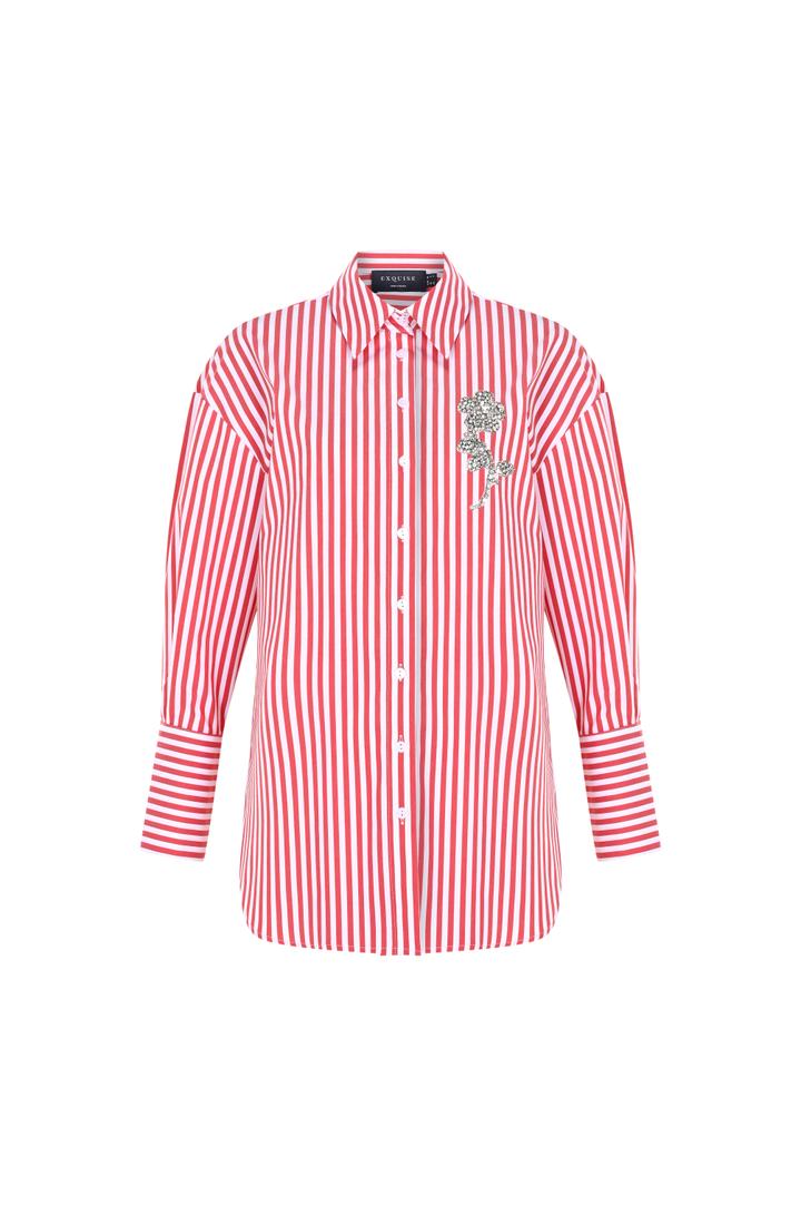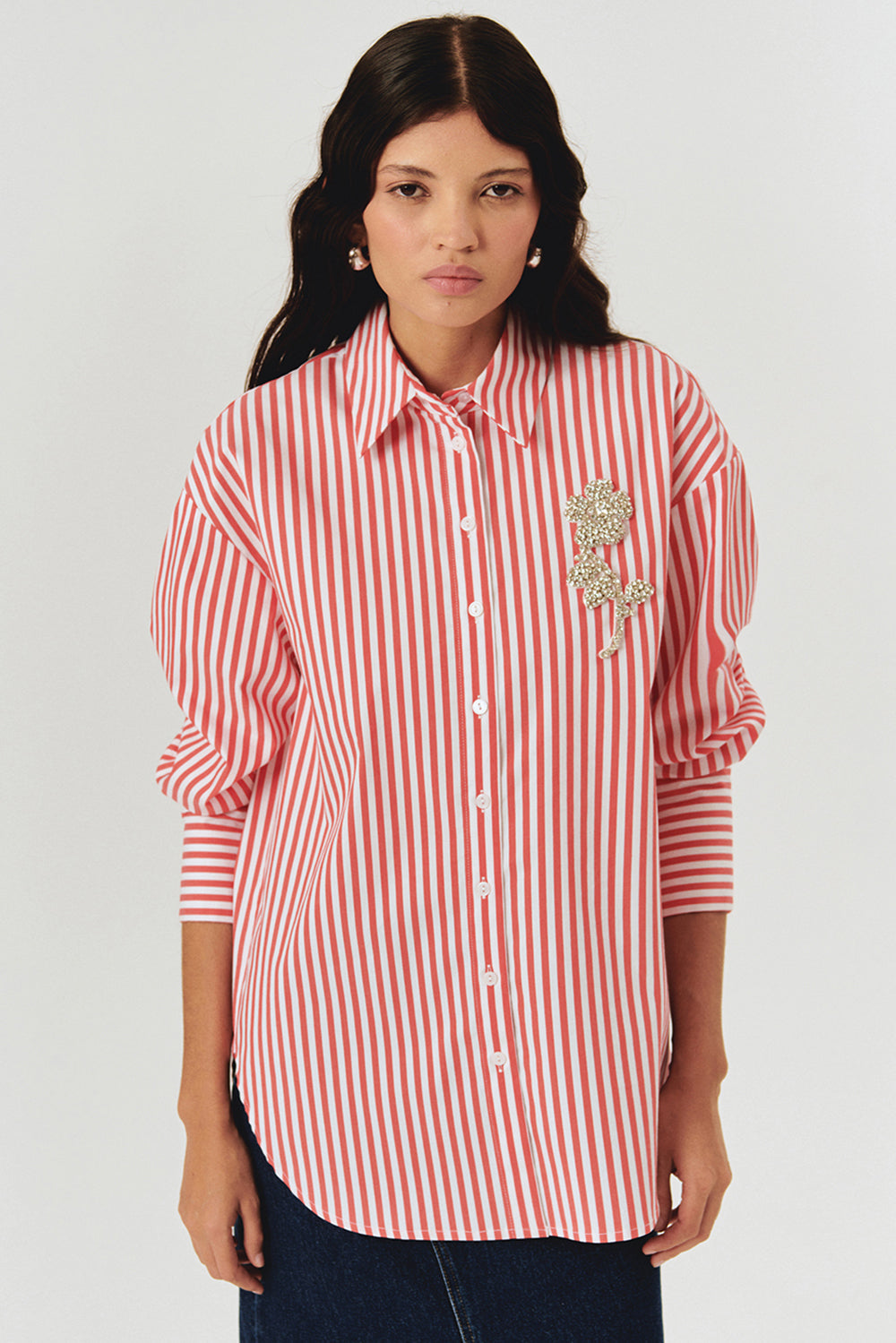 Taş İŞleme Detaylı Lacivert Beyaz Oversize Çizgili Poplin Gömlek