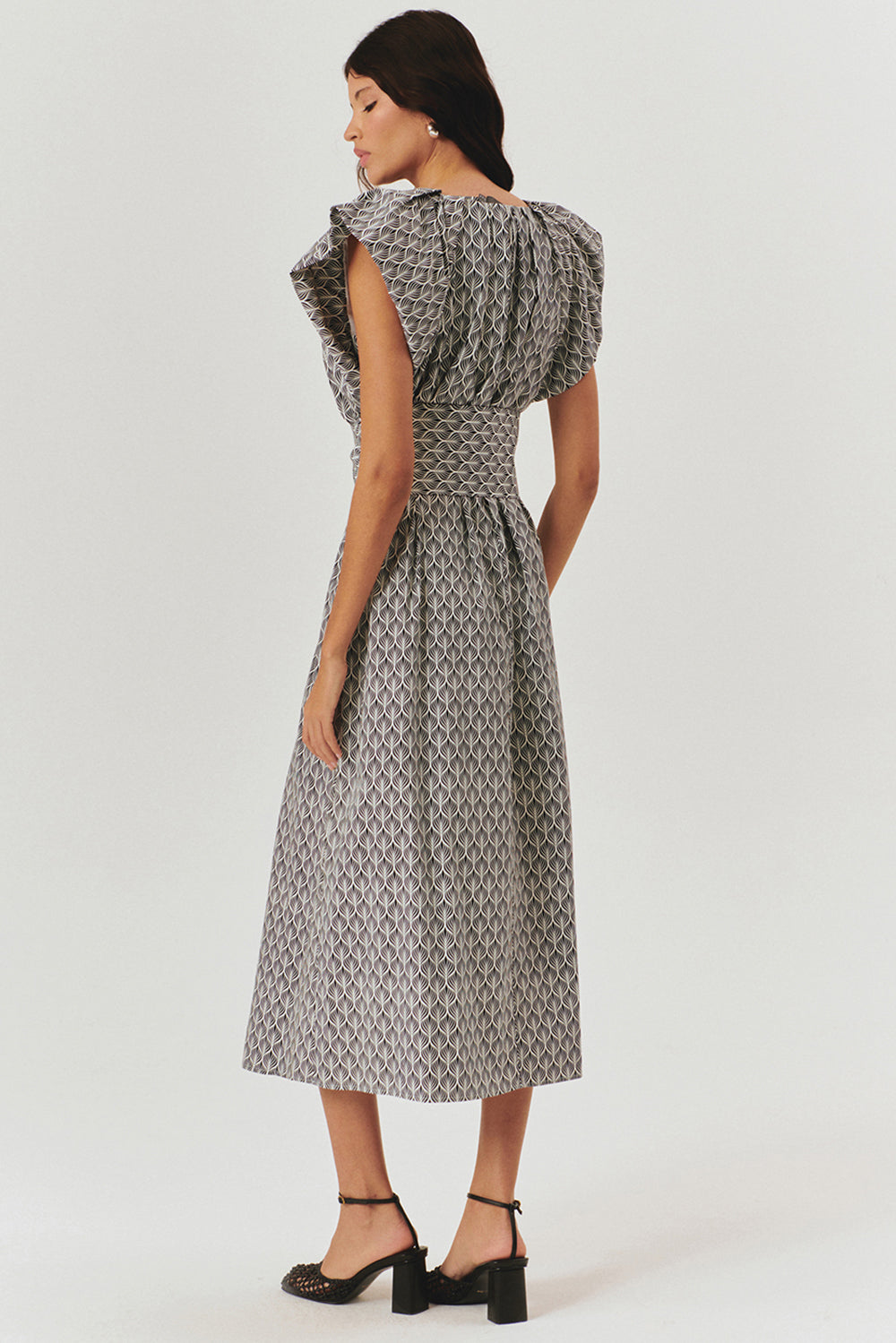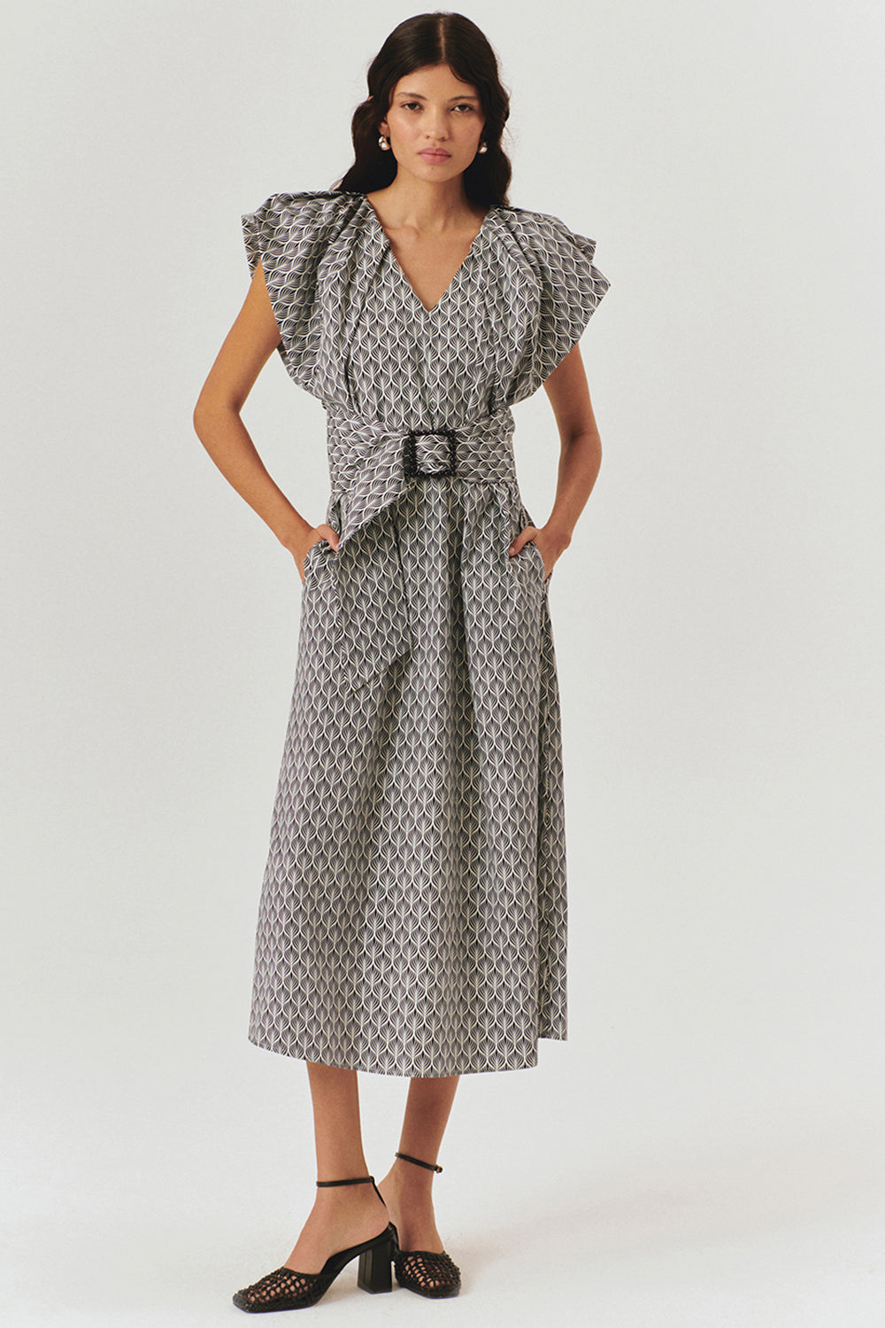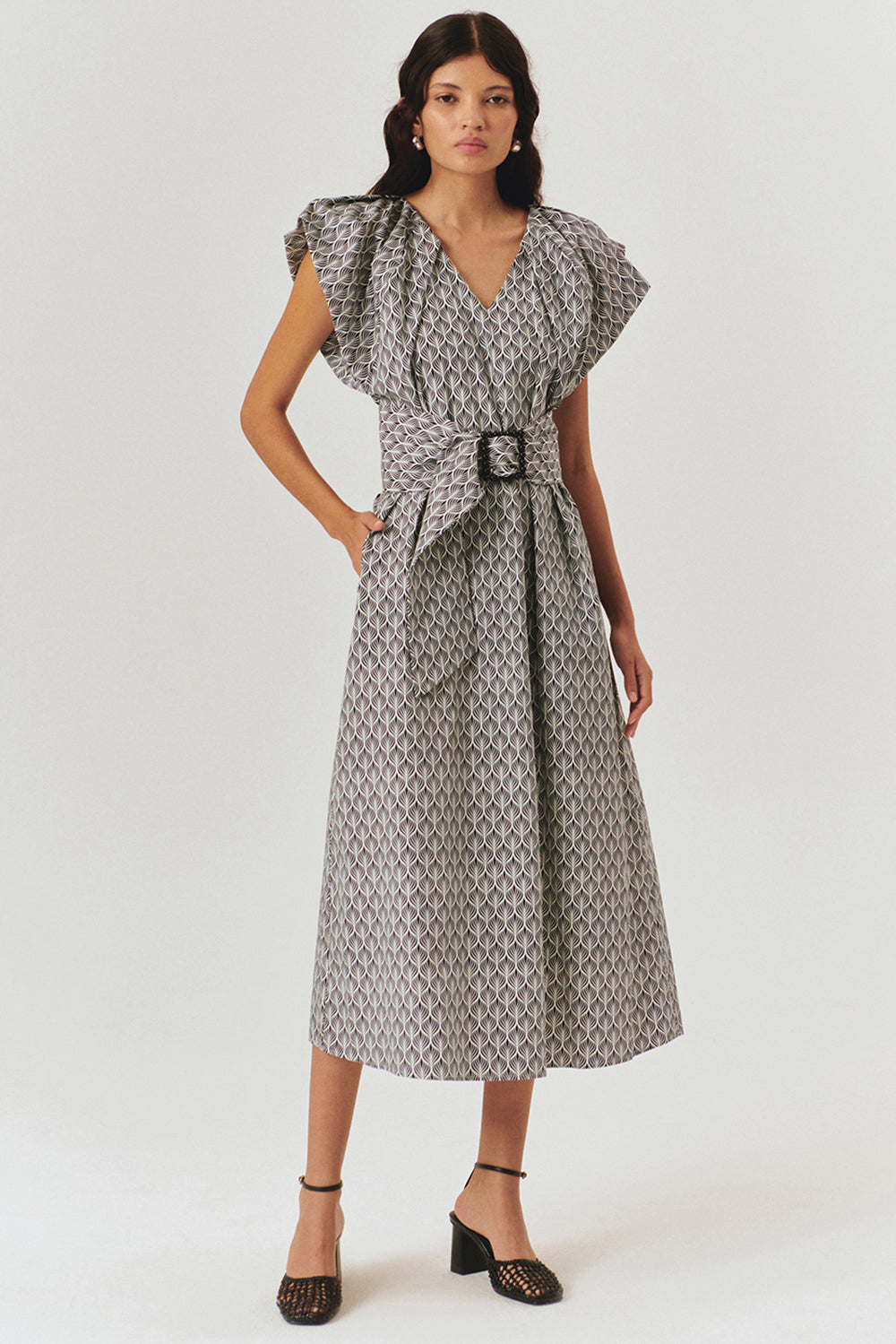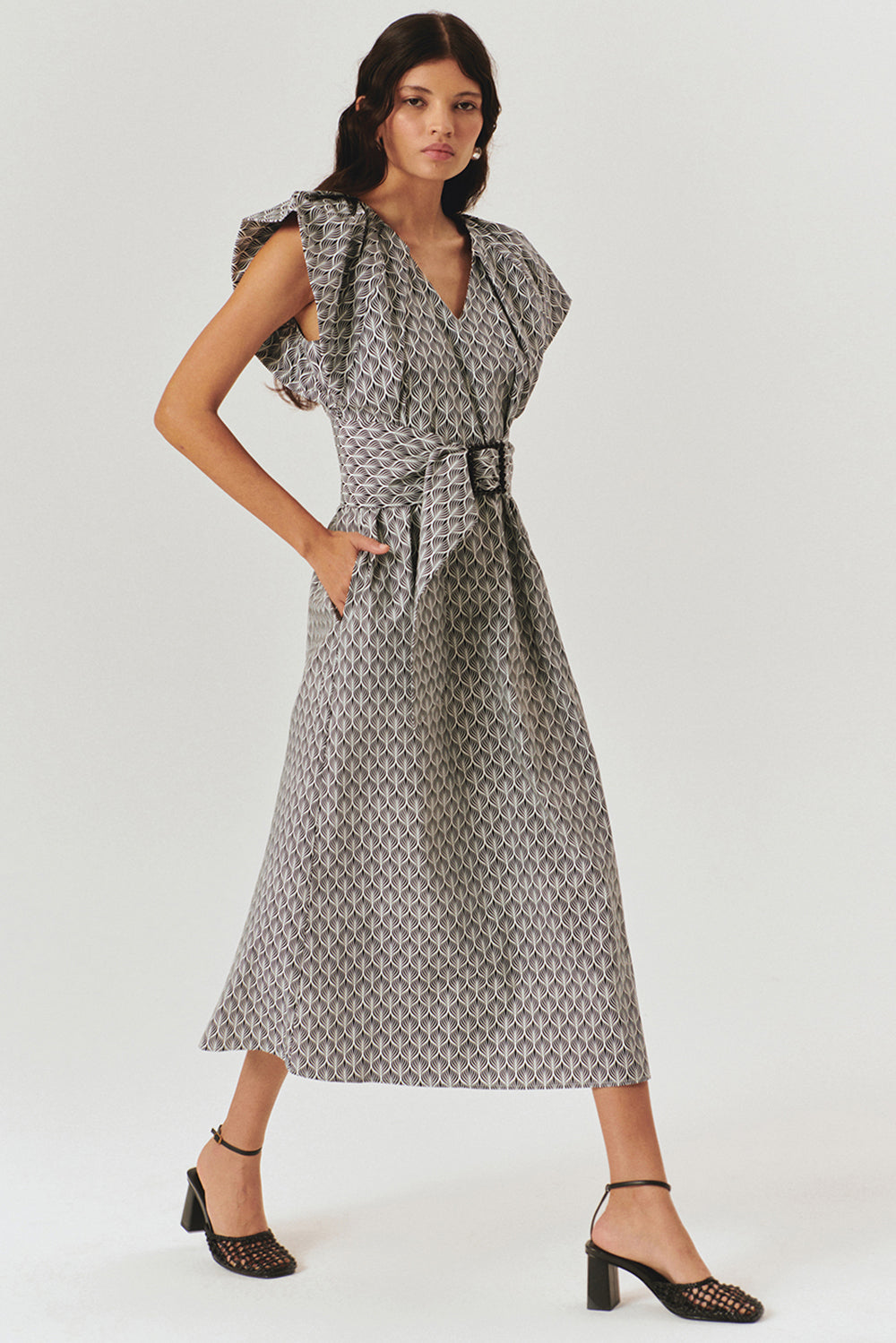 V Yaka Düz Kesim Desenli Midi Boy Elbise