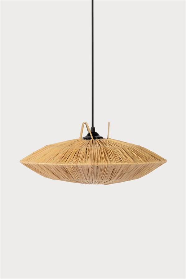 El yapımı doğal rafya malzemesiyle tasarlanmış bu sarkıt avize, yaşam alanlarınıza sıcak ve samimi bir atmosfer katıyor. Doğadan ilham alan organik dokusu sayesinde bohem, rustik ve tropikal dekorasyon stilleriyle mükemmel uyum sağlar. Siyah metal detaylarıyla modern bir kontrast oluşturan bu avize, yemek odası, oturma odası, yatak odası ve kafe gibi mekanlarda estetik bir aydınlatma çözümü sunar.