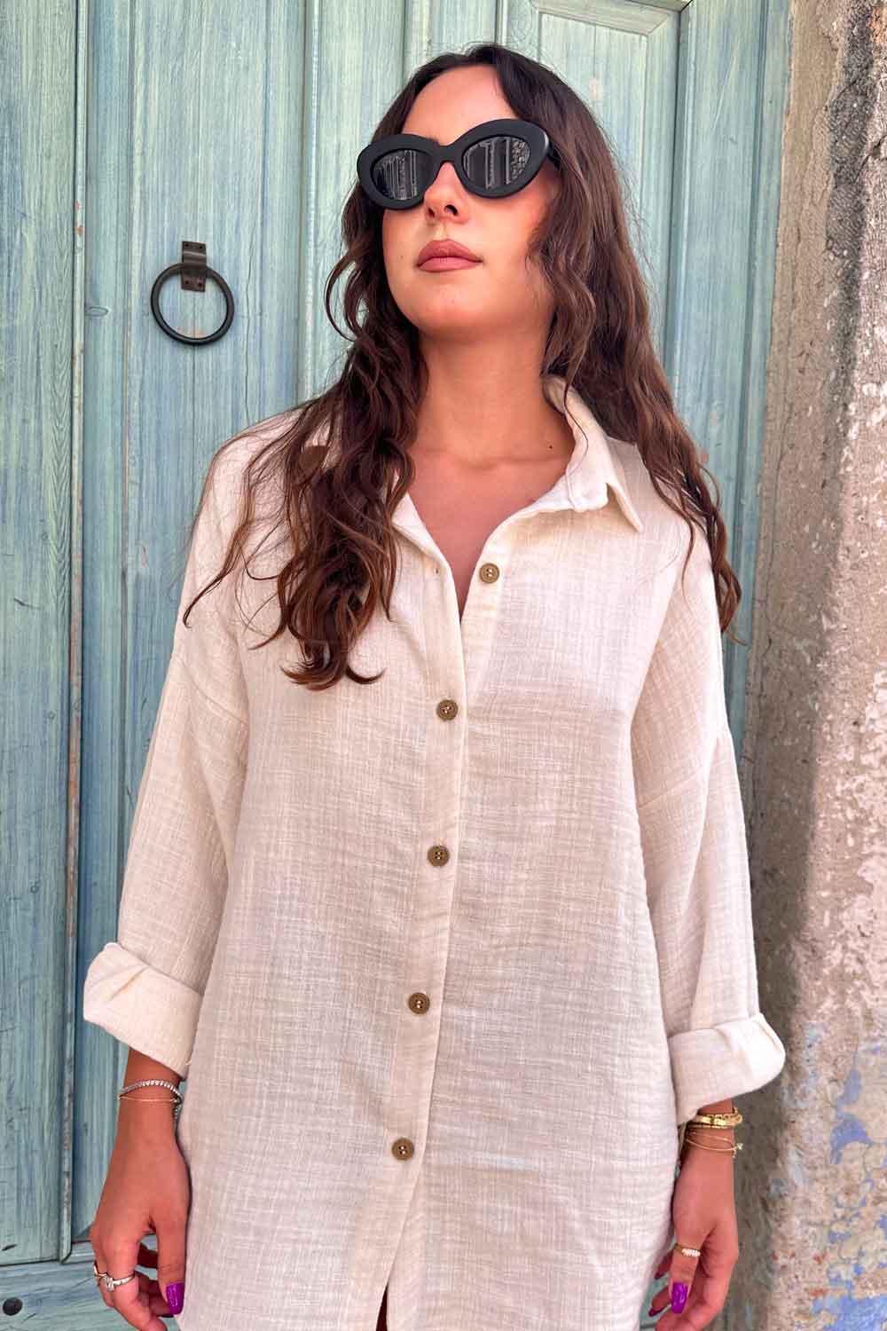 Keten Dokulu Salaş Ekru Gömlek Ceket
