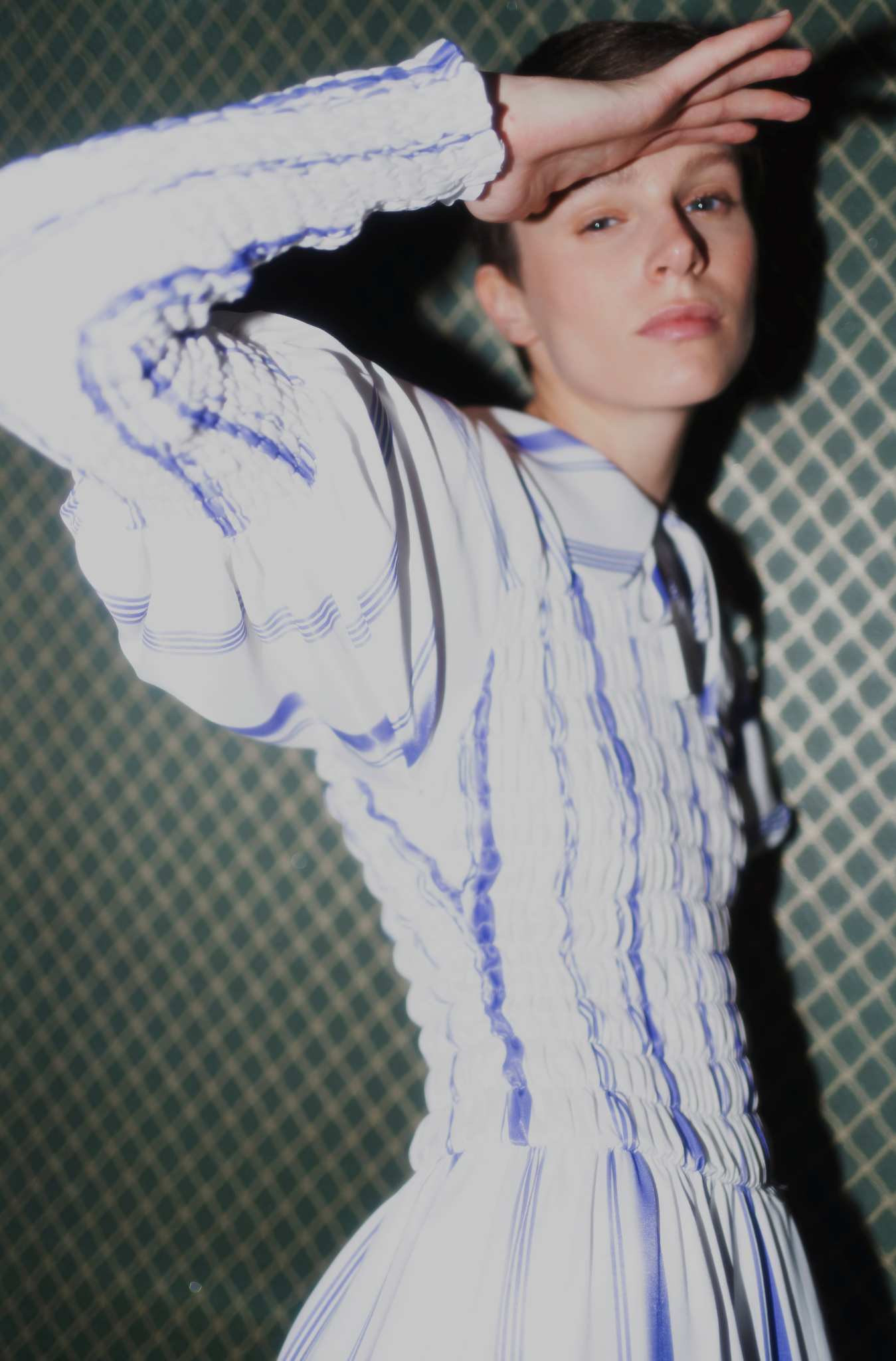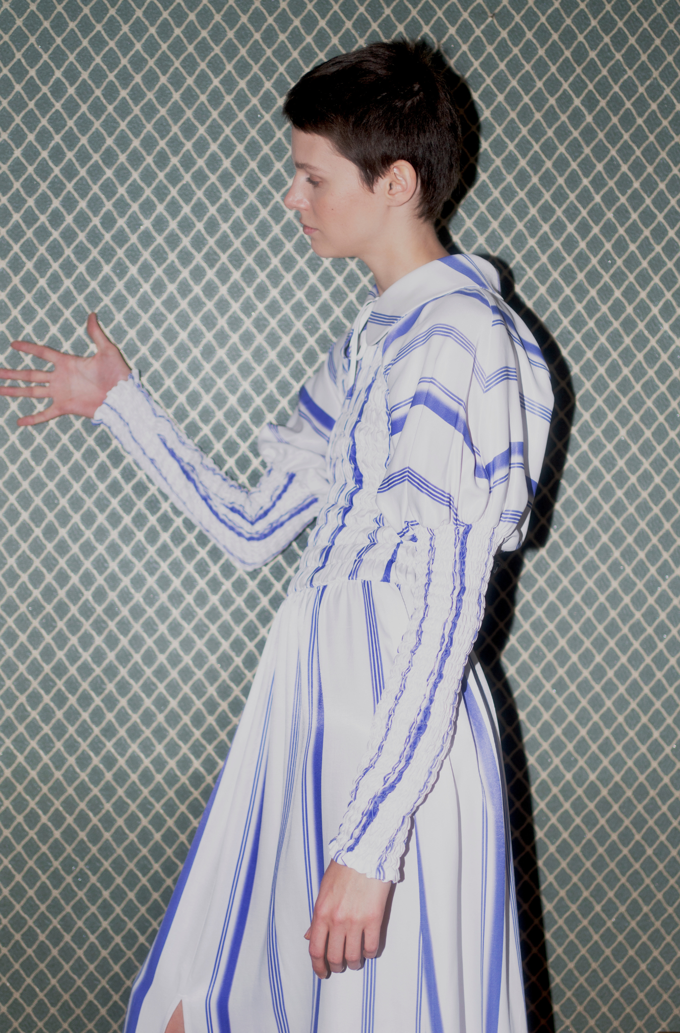 Bu midi elbise, bel hizasında elastik bir gövde detayıyla vücuda tam oturan bir uyum sunar. Göze çarpan balon kollar ve şık bir yakasıyla sofistike bir görünüm kazandırır. Beyaz-mavi çizgili tasarımıyla dikkat çeker.