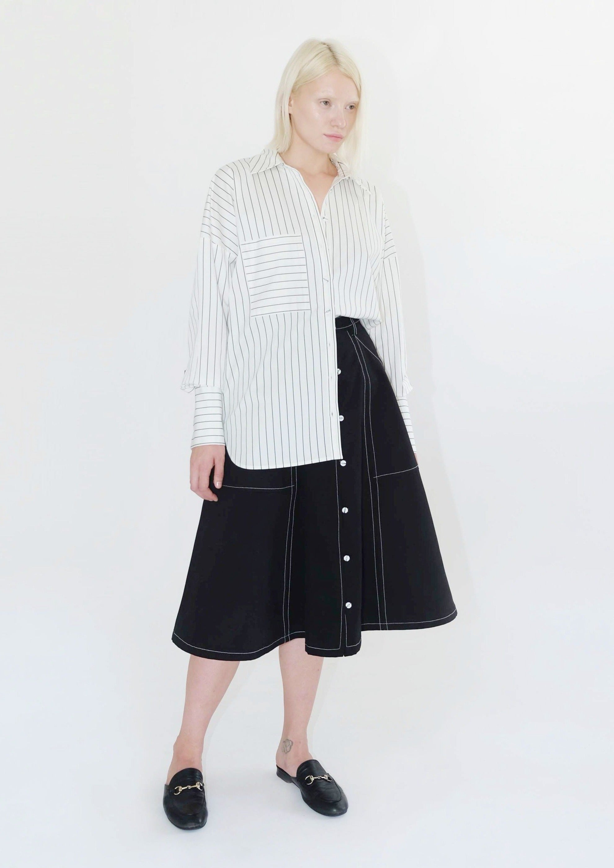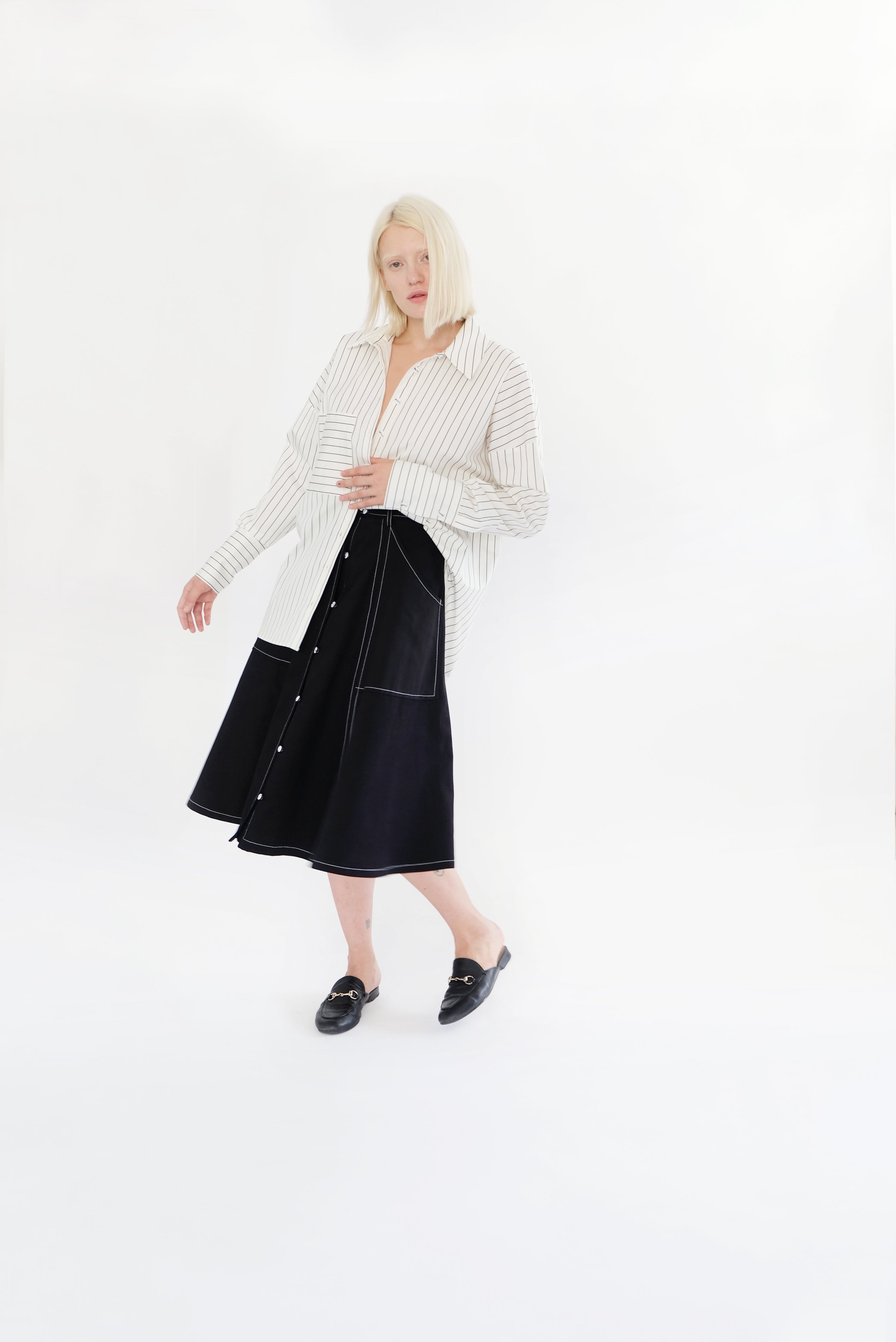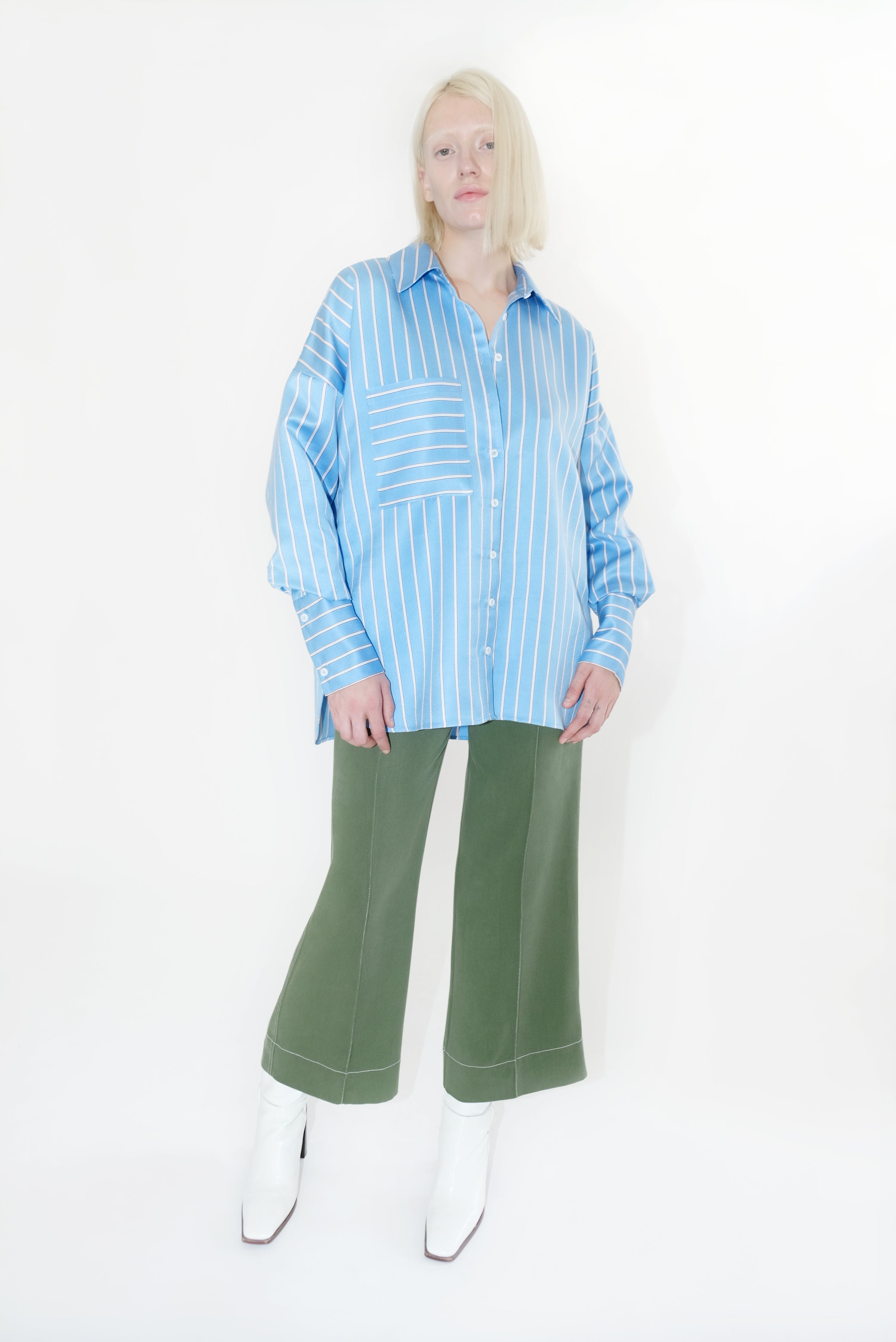 Oversize kesimi ve tek göğüs cebiyle bu pamuk gömlek, ekstra uzun şair manşetleri sayesinde klasik stile modern bir dokunuş katıyor. Rahat formu ve dökümlü duruşuyla hem günlük hem de ofis kombinlerinde zamansız bir parça olarak öne çıkıyor.