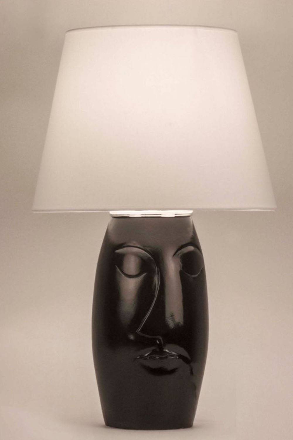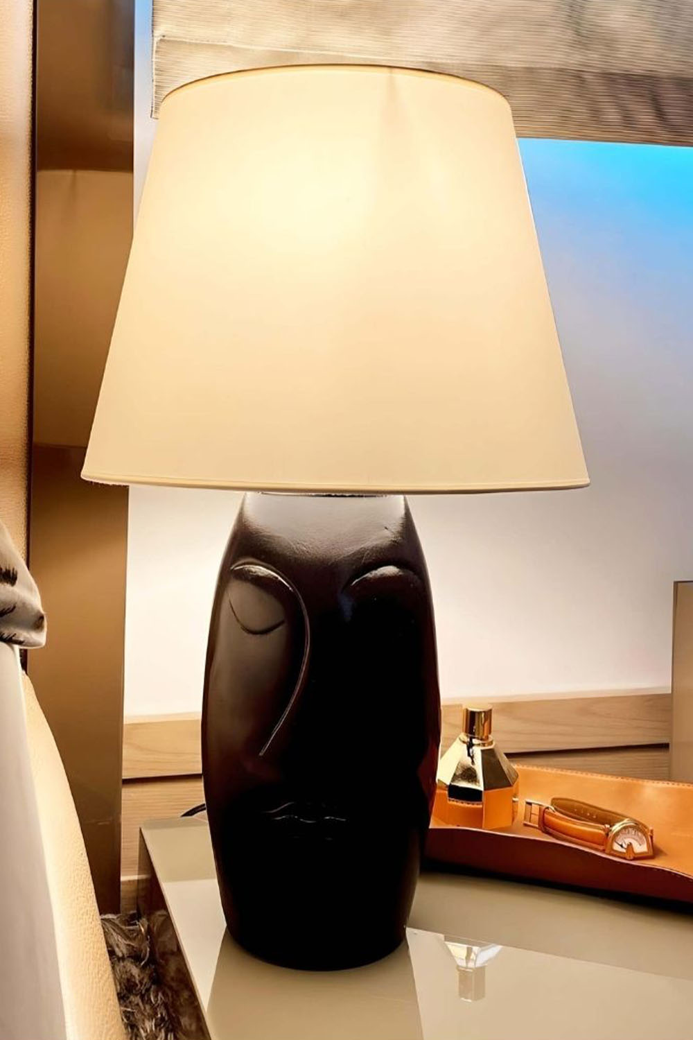 El Yapımı Modern Barcelona Abajur – Siyah Seramik Yüz Formlu, Krem Başlıklı Tasarım