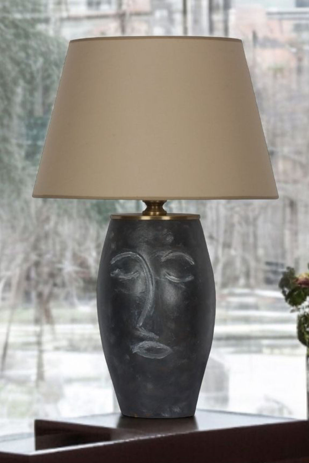 yapımı seramik masa lambası, gövdesindeki yüz figürüyle bulunduğu ortamda