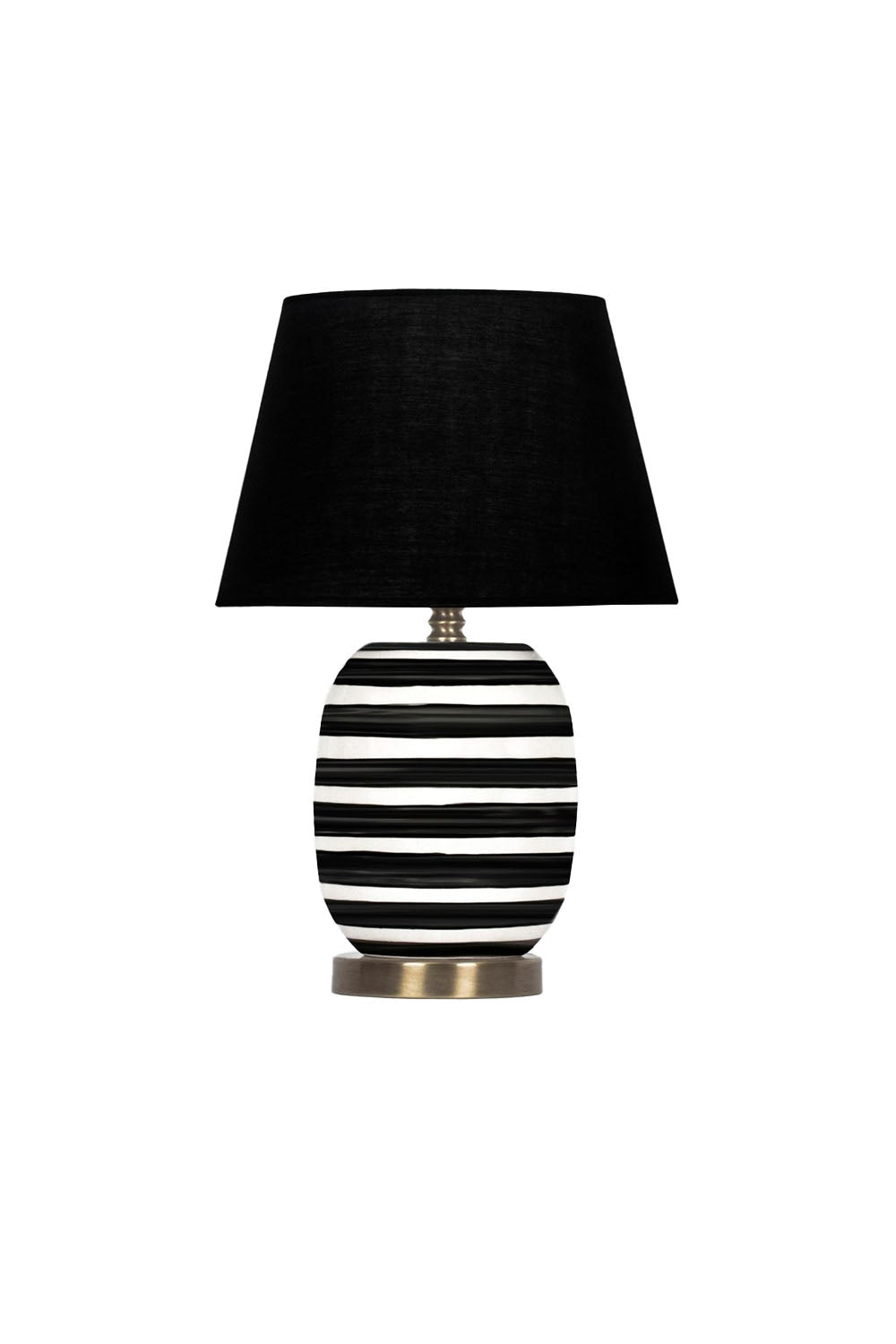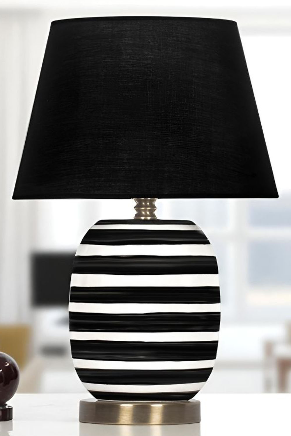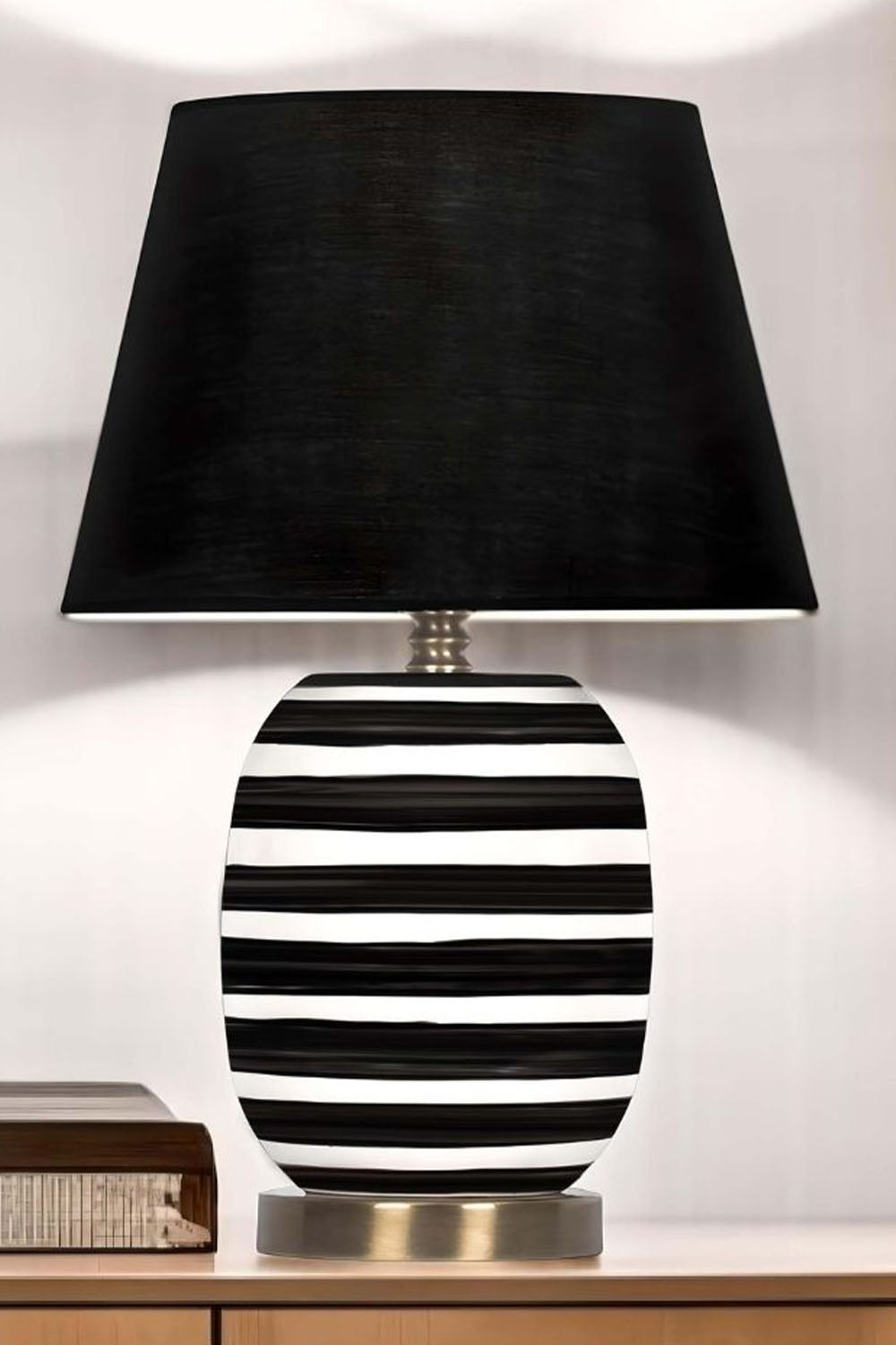Siyah-beyaz çizgili seramik gövdesi, sade siyah kumaş abajuruyla birleşerek hem