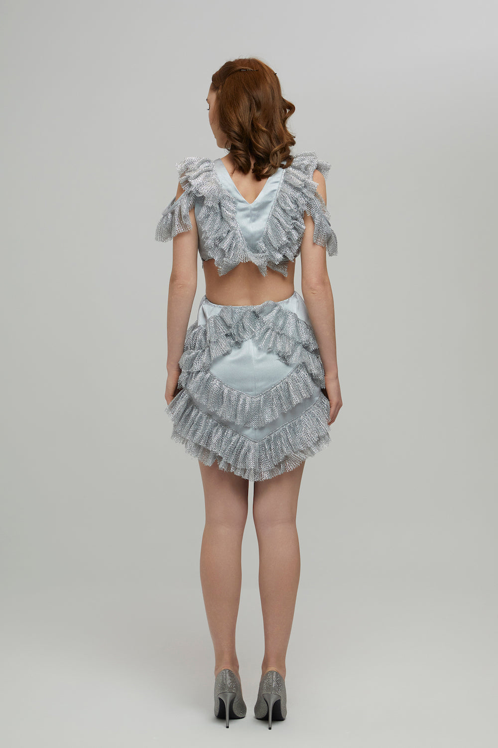 Soft Gri rengiyle modern bir görünüm sergileyen fırfır detaylı mini elbise, her detayında ince işçiliği ve yüksek kaliteyi hissettirir. Elbisenin yanlarında ve arkasında yer alan kesimler ince bir siluet görüntüsü sağlıyor . A Kesim eteğinin belinde ve elbisenin üst tarafında ince gizli lastik olması da elbiseye ayrı konfor sağıyor . Likrasızdır . Yandan gizli fermuarlı ve Astarlıdır .Tüm sezonlarda rahatlıkla giyilebilen yapısıyla gardrobunuzdaki yerini alacak.