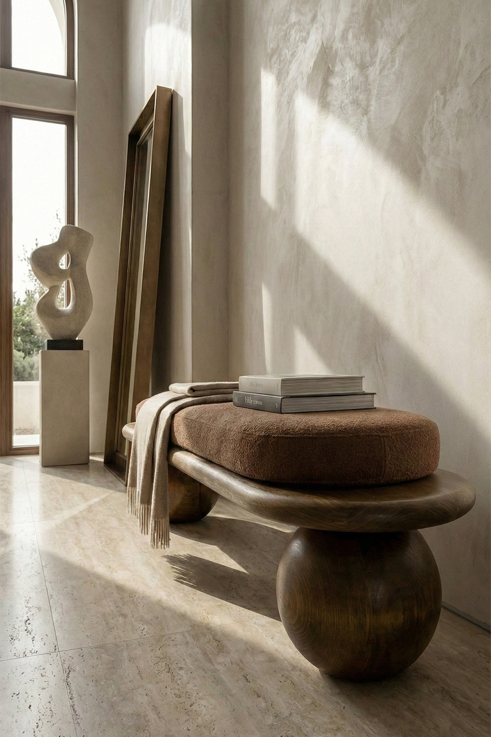 Ceviz renginin derin tonu, ahşabın doğal dokusunu ön plana çıkarırken; küre formundaki ayaklar tasarıma heykelsi bir etki katar. Sert çizgilerden uzak bu form, mekânda görsel bir akış hissi oluşturur ve modern mimariyle doğal malzemeyi aynı noktada buluşturur.