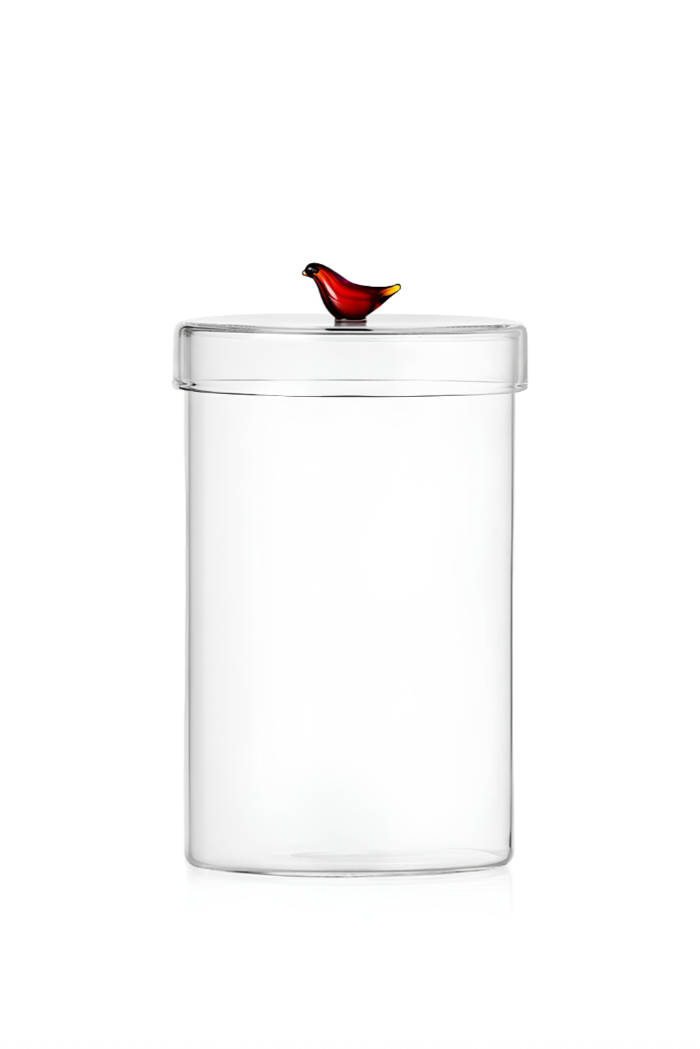 Minimalist formuyla öne çıkan bu el yapımı borosilikat cam saklama kabı, kapağındaki kırmızı kuş figürüyle sade tasarıma şiirsel bir dokunuş katar. Şeffaf yapısı sayesinde içeriği kolayca görünürken, kuş figürü objeye heykelsi bir değer kazandırır. Mutfakta kuru gıda saklamak, banyoda düzenleyici olarak kullanmak veya dekoratif objelerle birlikte sergilemek için işlevsel ve estetik bir seçenektir. Birds koleksiyonunun rafine çizgisini yansıtan bu tasarım, yaşam alanlarına zarafet katmak isteyenler için ideal bir parçadır.