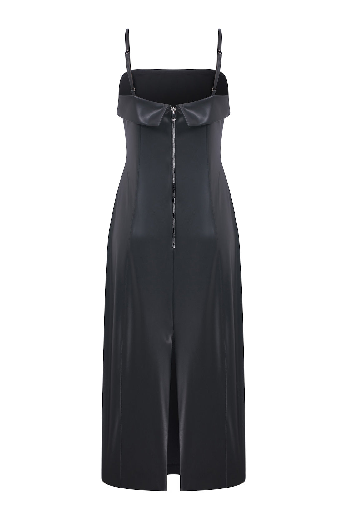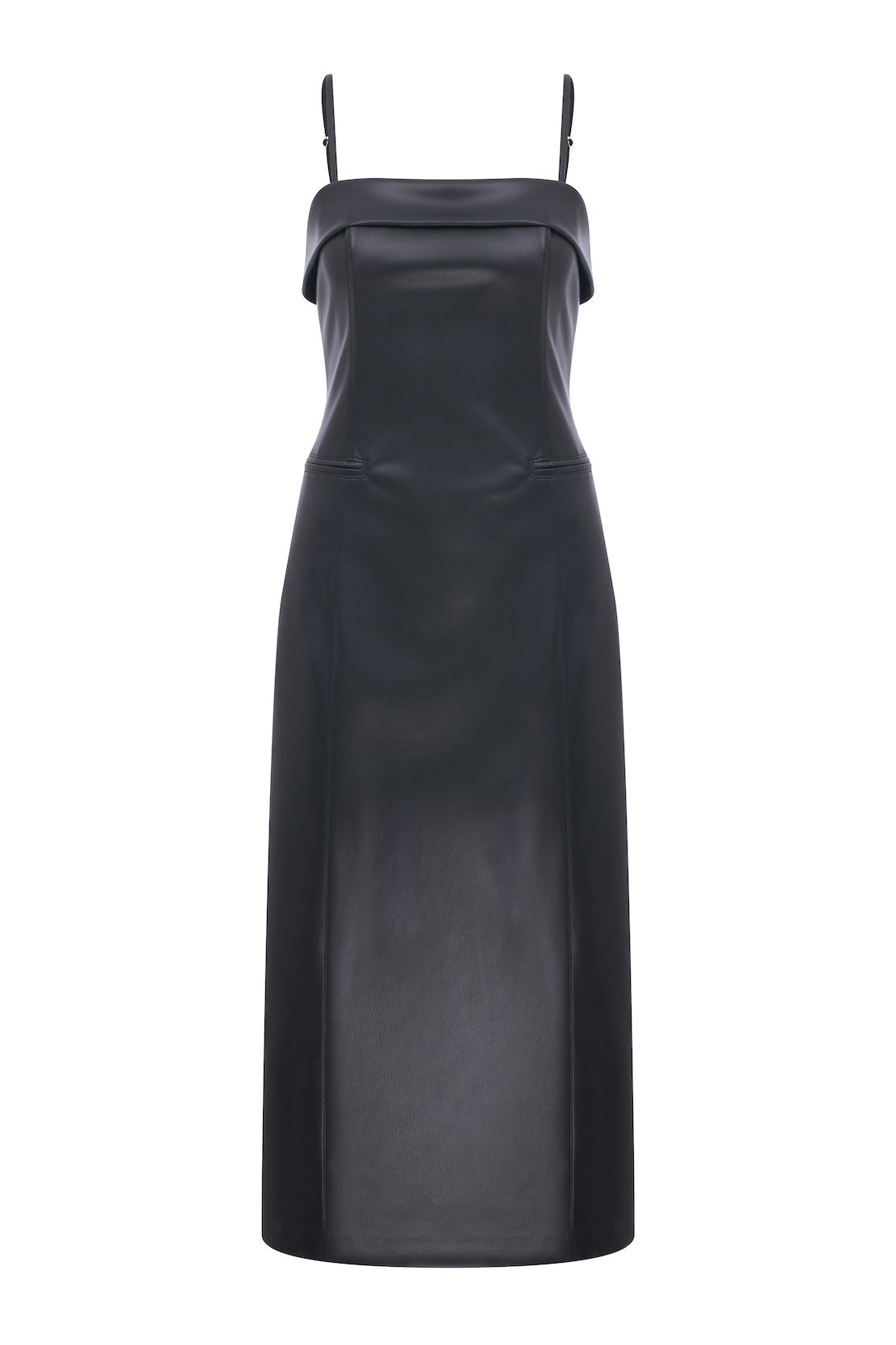 Yumuşak vegan deriden üretilen bu midi elbise, içi saten astarlı ve arkada sağlamlık için metal fermuara sahip. Şık ve zarif yapısıyla özel günler için ideal bir alternatif sunar. Boxy cropped ceket ile kombinlendiğinde modern bir görünüm sağlar.