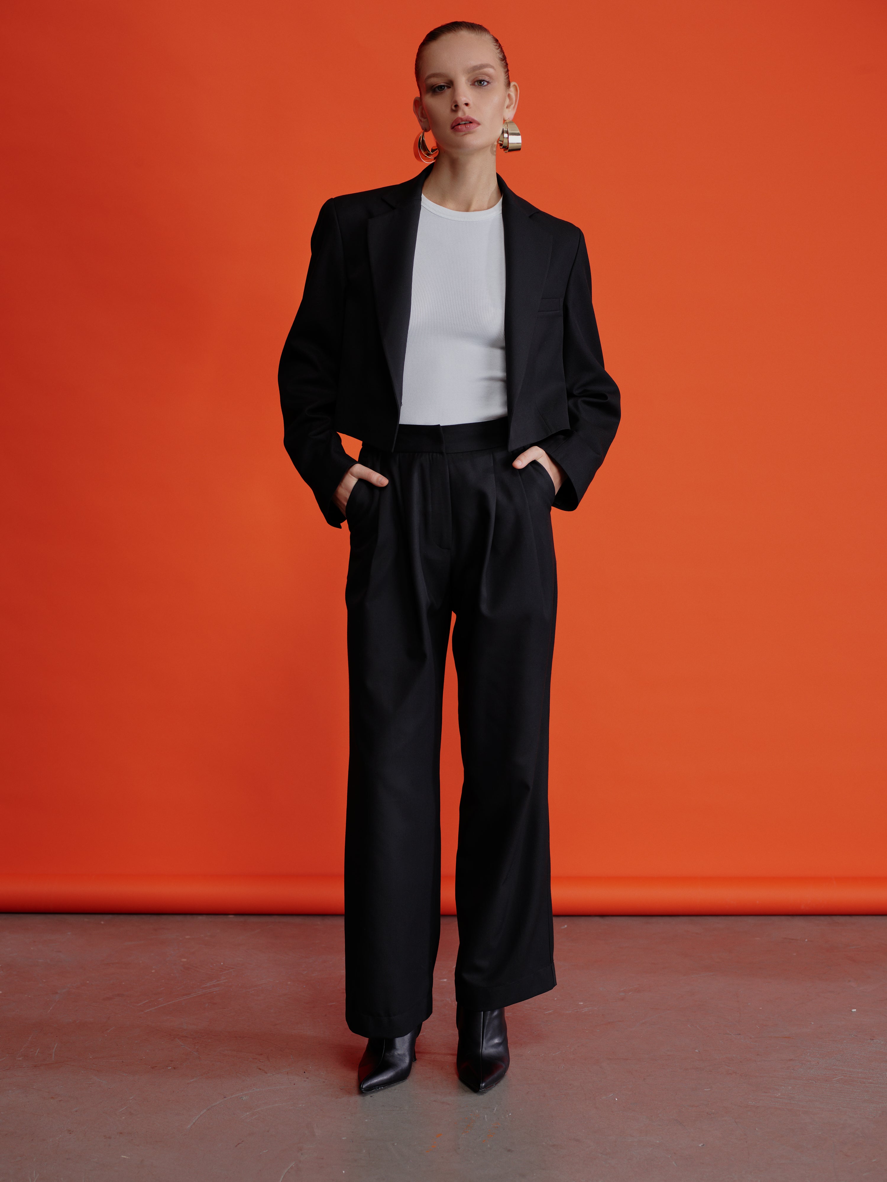 Tina pantolon, yüksek bellidir. Cepleri mevcuttur. Önde ikili pensleri vardır.