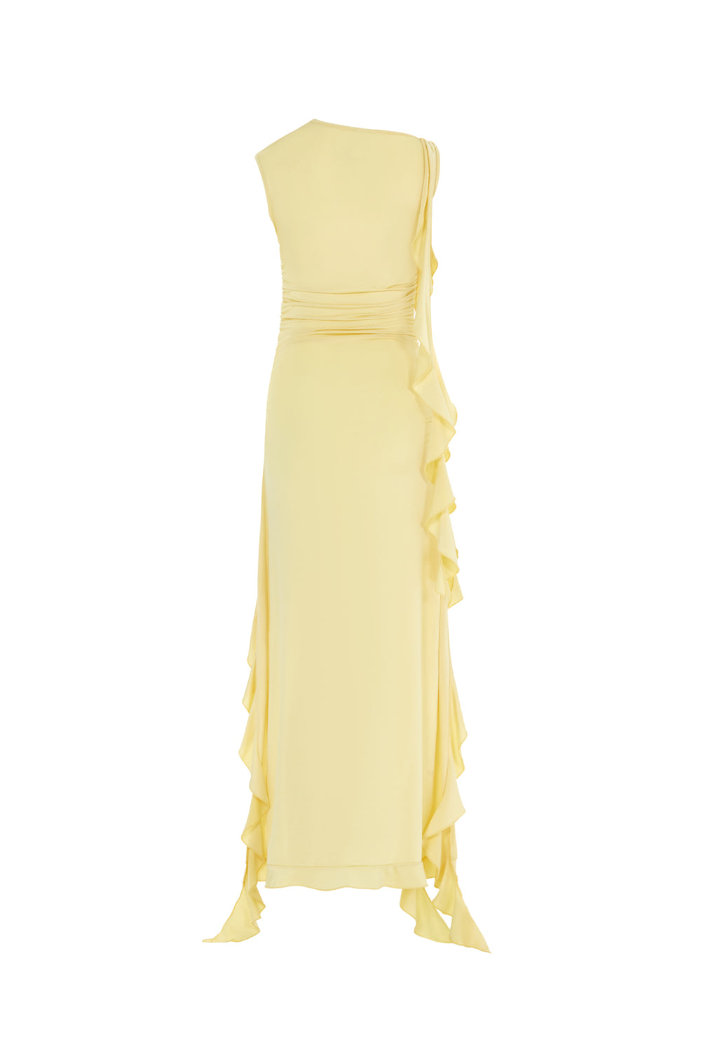 Yanlardan aşağı inen volan detaylarıyla hareket kazanan bu midi elbise, şıklığınızı zarif bir şekilde vurgular. Vücuda oturan kalıbı sayesinde silüetinizi ön plana çıkarır ve yırtmaç detayı ile feminen bir dokunuş sunar. Astarsız tasarımı hafiflik katarken, rahat bir kullanım sağlar.