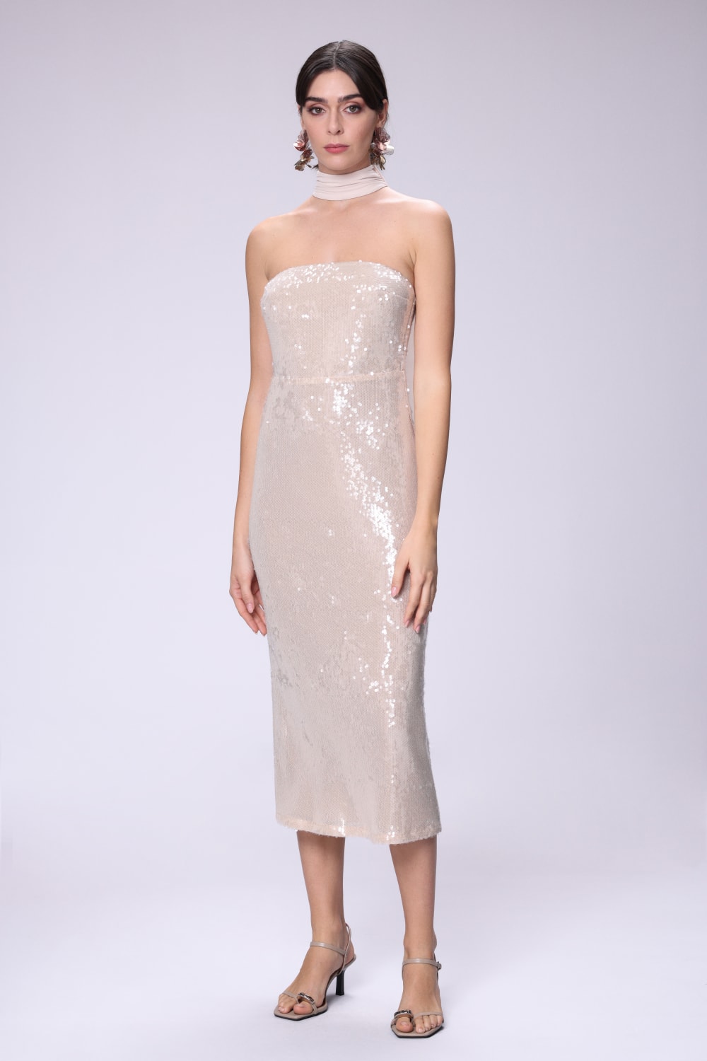 Esneyen %100 polyester kumaştan üretilmiş bu elbise, dar kesimi ve arka yırtmaç detayıyla modern ve şık bir siluet sunar. Boyundan düğmeli tasarımı ve arkadan fermuar kapaması, hem zarif hem de kolay kullanım sağlar. Gerçek bedene uygun kalıbı sayesinde rahat bir giyim deneyimi sunar. Model 176 cm boyunda ve Small beden giymektedir.