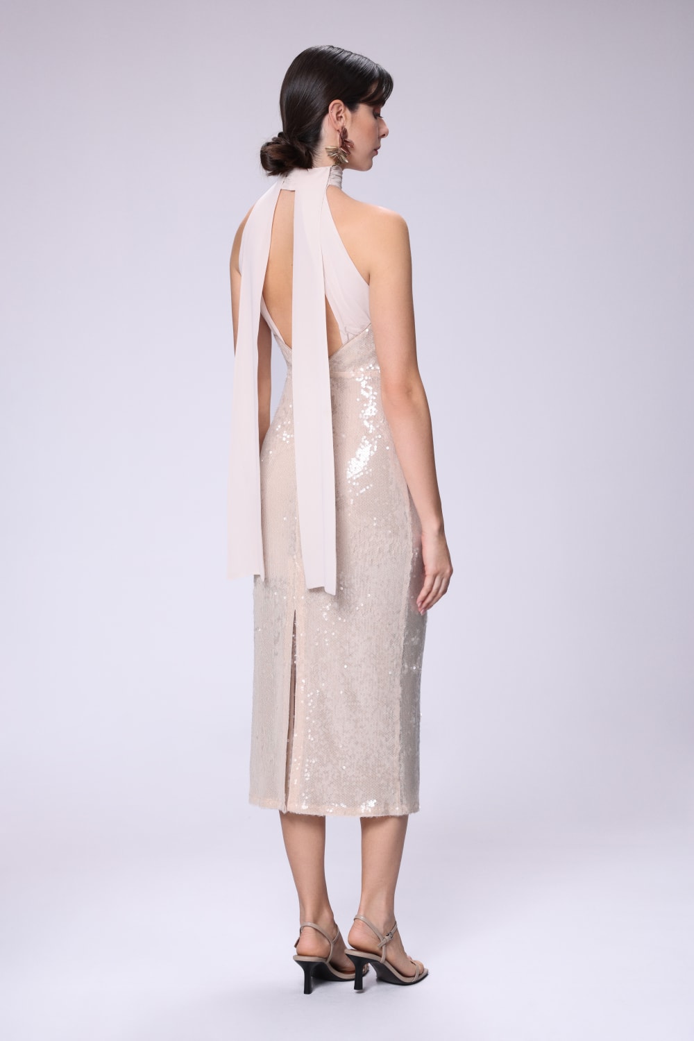 Boyundan Düğmeli Arka Yırtmaçlı Elbise