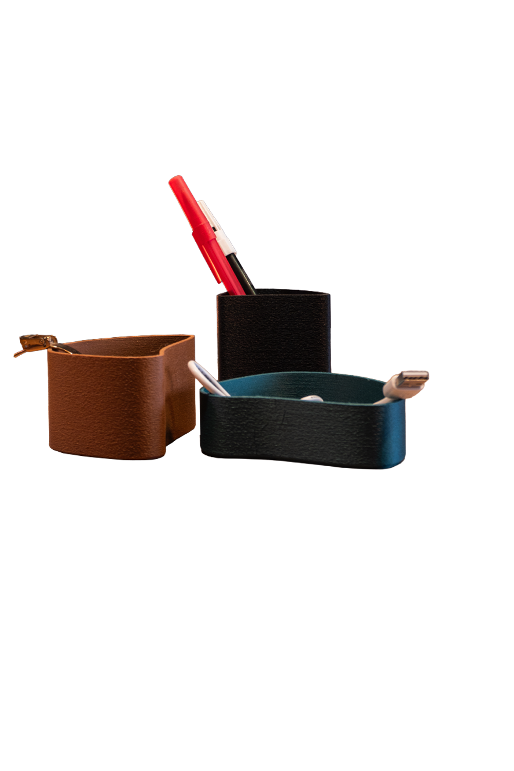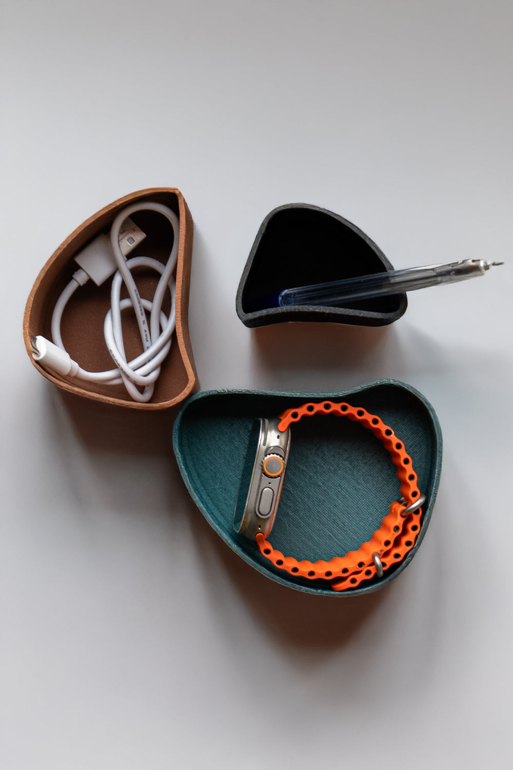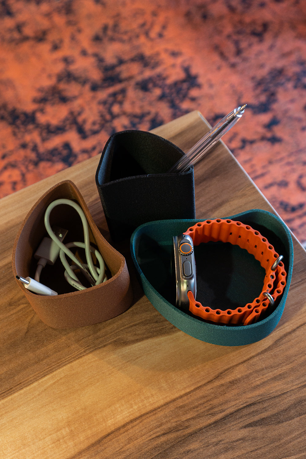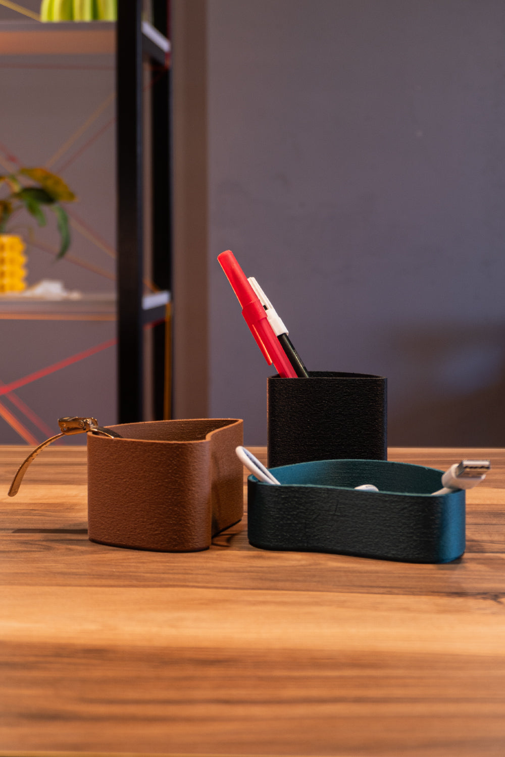 Küçük (10x8,5x3 cm), orta (8,5x6,5x5 cm) ve büyük (5x6x7 cm) ebatlarıyla farklı ihtiyaçlara uyum sağlar. Kalemler, takılar, anahtarlar, kartvizitler ya da masaüstündeki ufak eşyalar için pratik bir çözüm sunar.