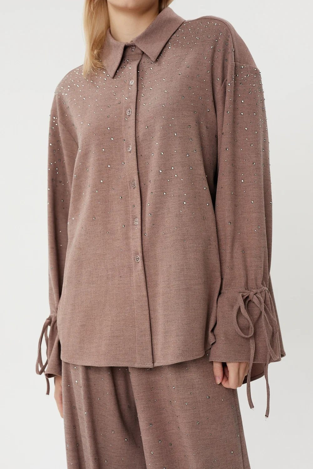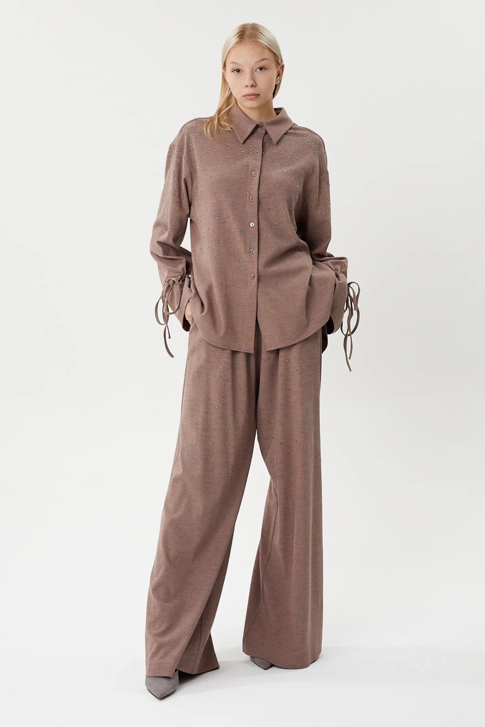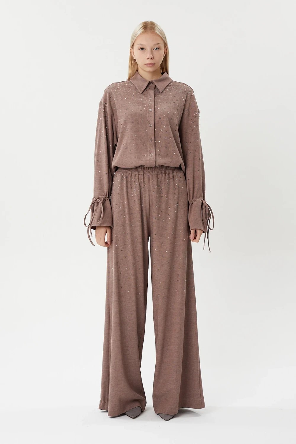 Kristal Taşlı Beli Lastikli Rahat Kalıp Pamuklu Kumaştan Pantolon