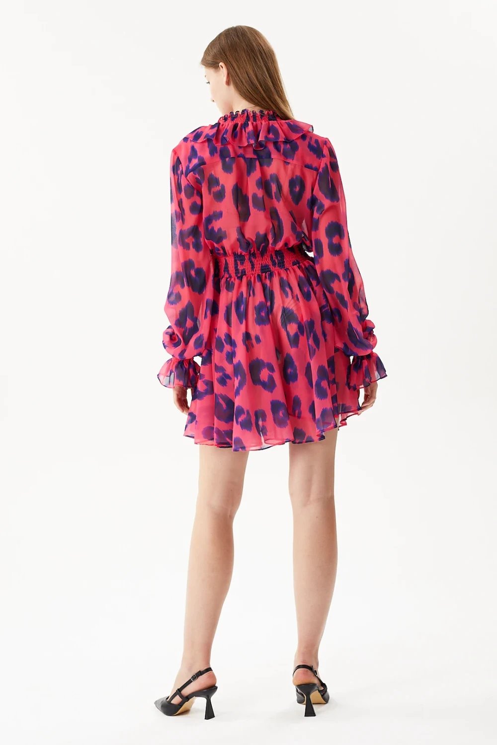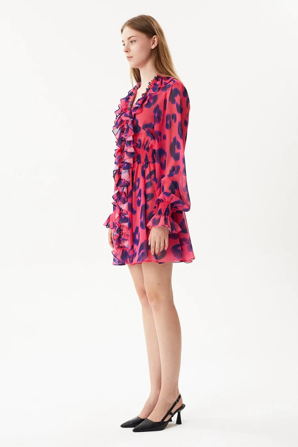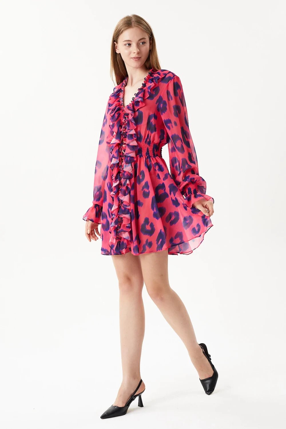 Leopar baskılı, beli ve manşeti lastikli, fırfırlı bayan mini elbise .