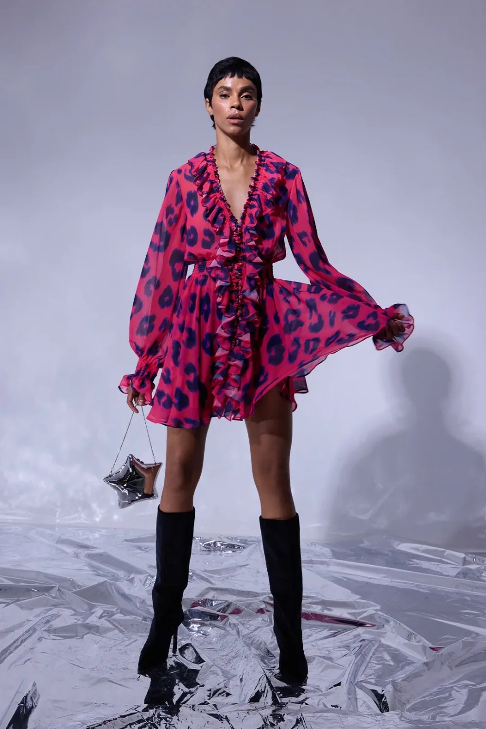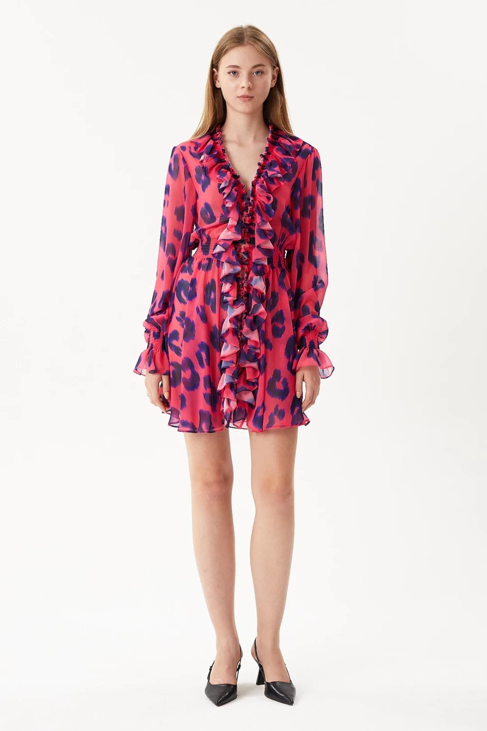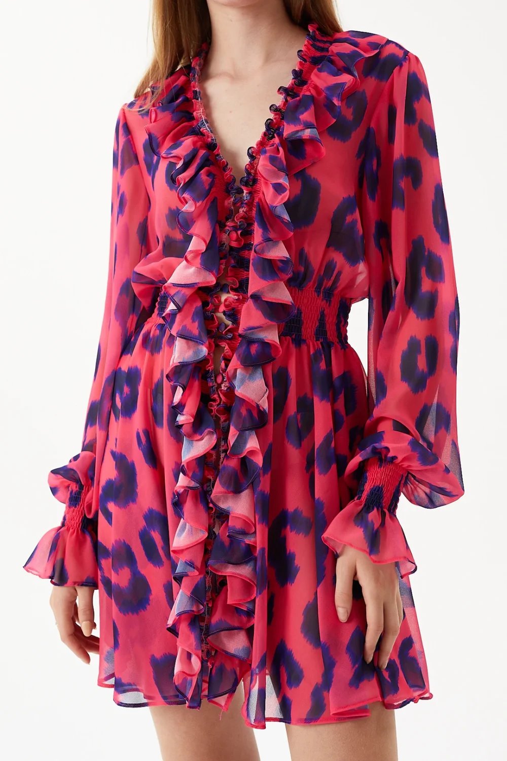 Leopar baskılı, beli ve manşeti lastikli, fırfırlı bayan mini elbise .