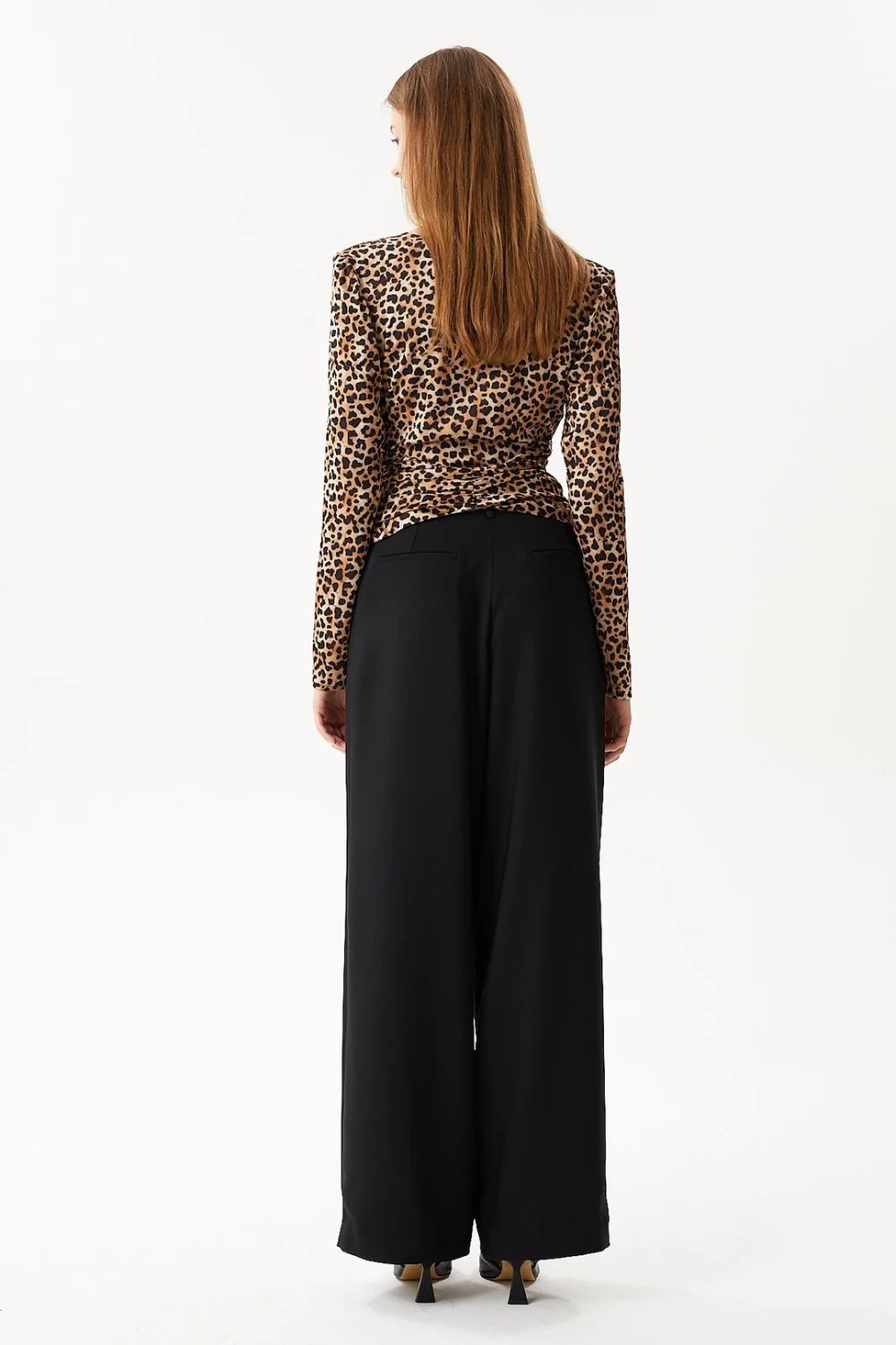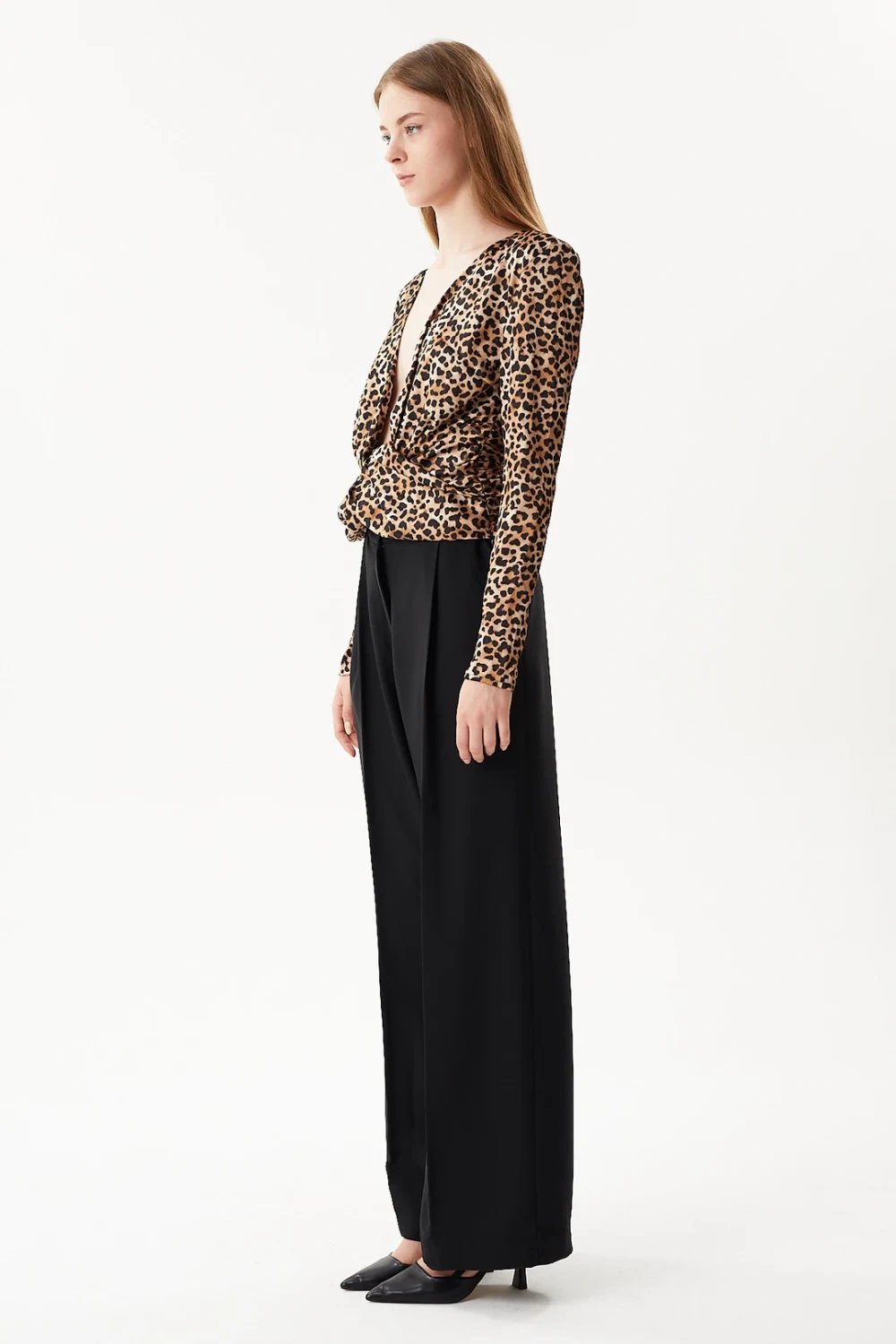 Viskon kumaş saten dokulu , önden düğümlü , leopar baskılı astarsız bluz .