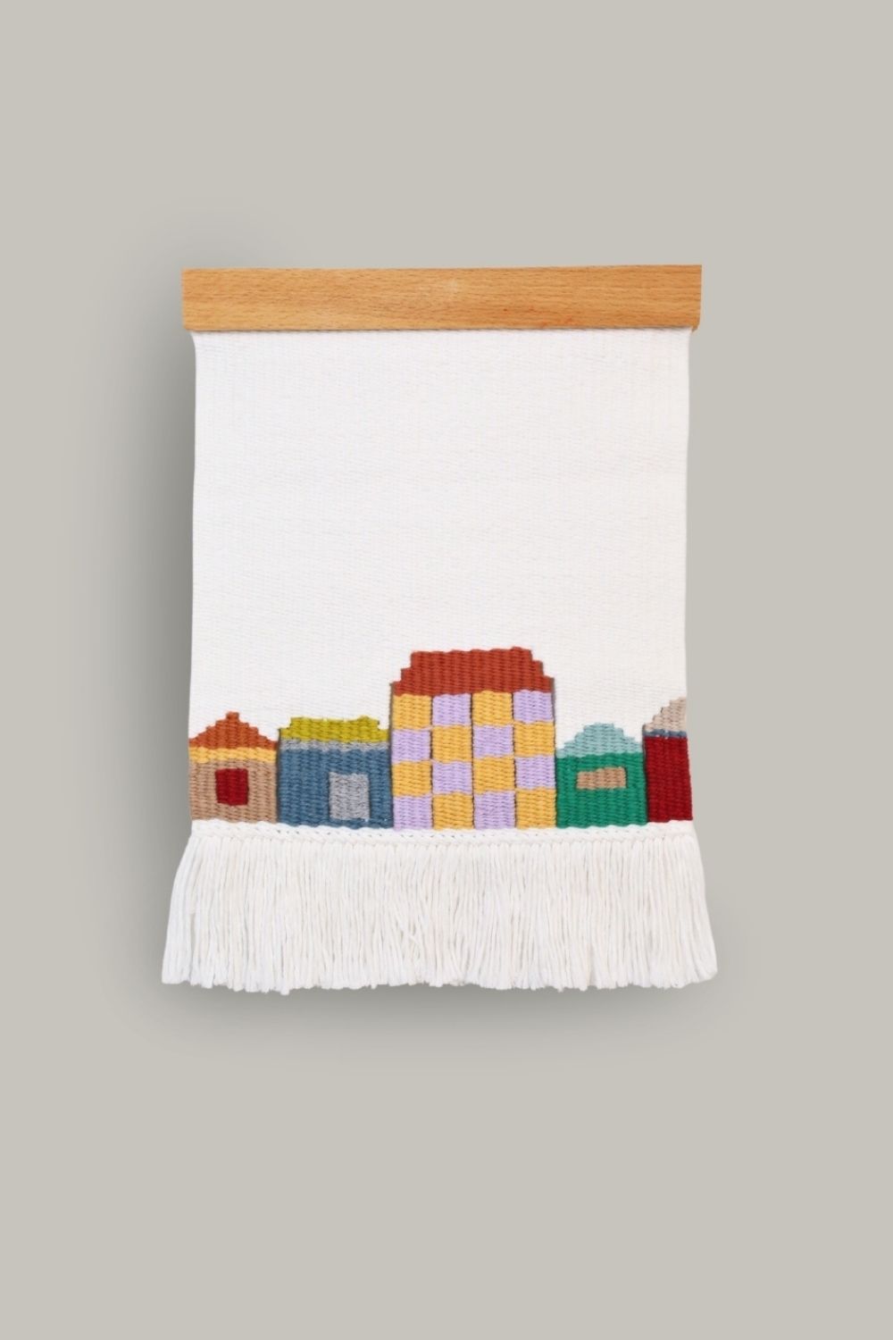 Ev temalı duvar kilimi dokuma tezgahında elde dokunarak üretilmiştir.