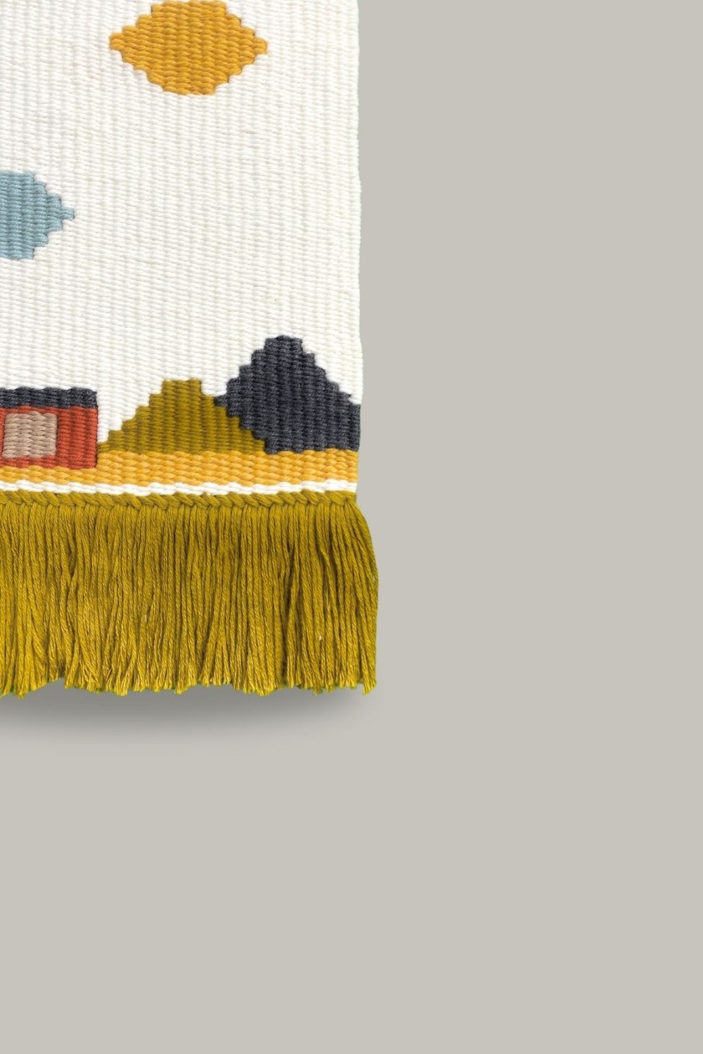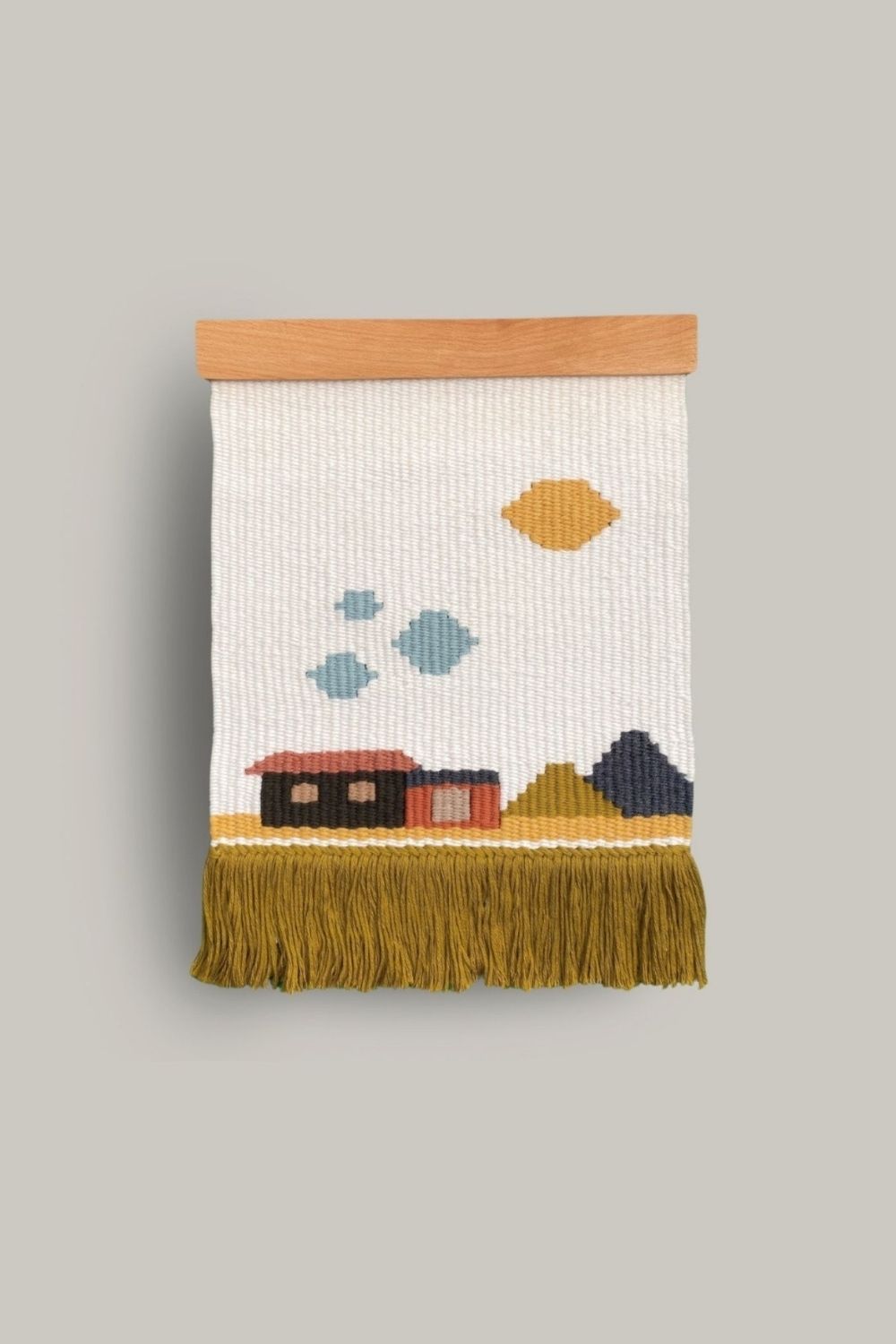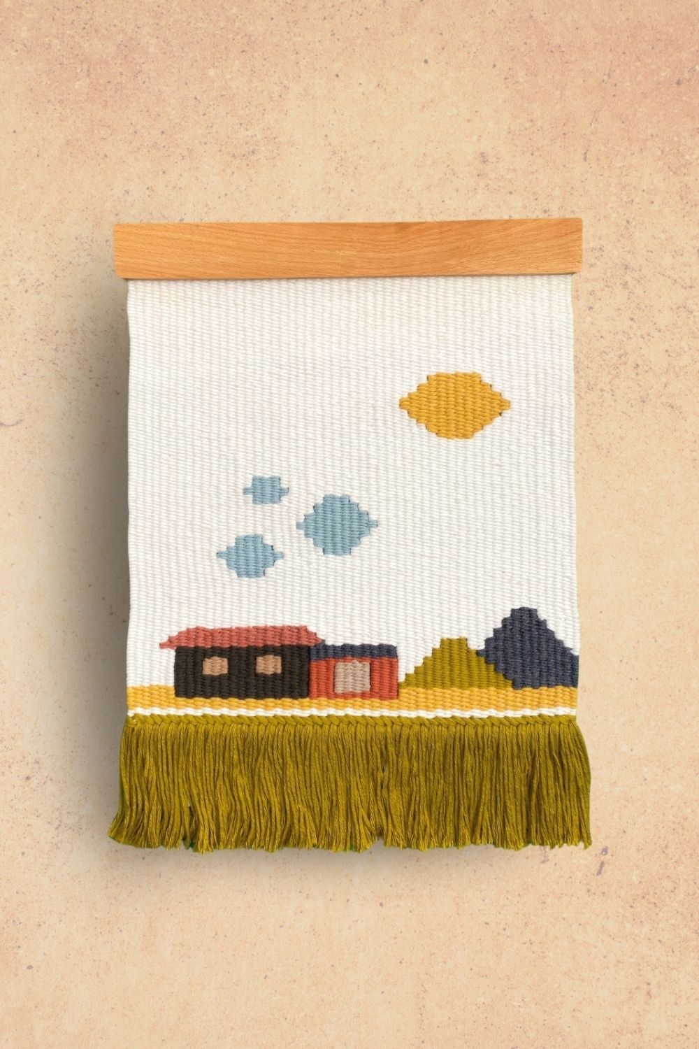 Ev temalı duvar kilimi dokuma tezgahında elde dokunarak üretilmiştir.