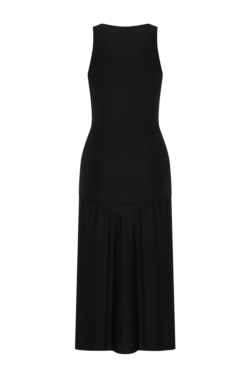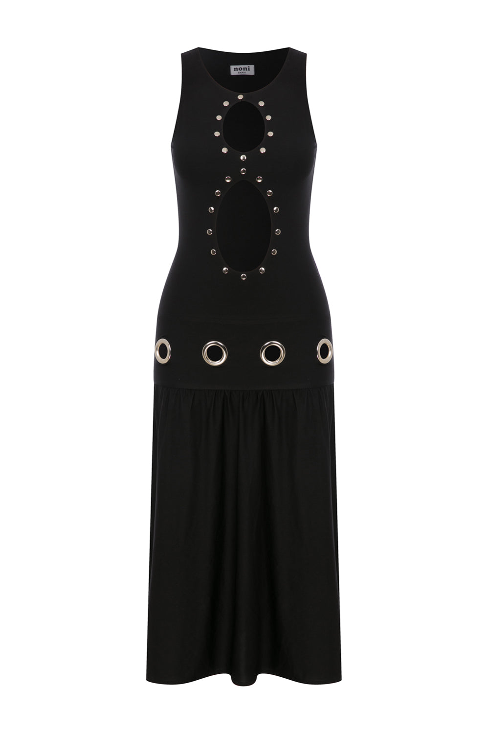 Siyah Kedi Gözü Detaylı Midi Elbise