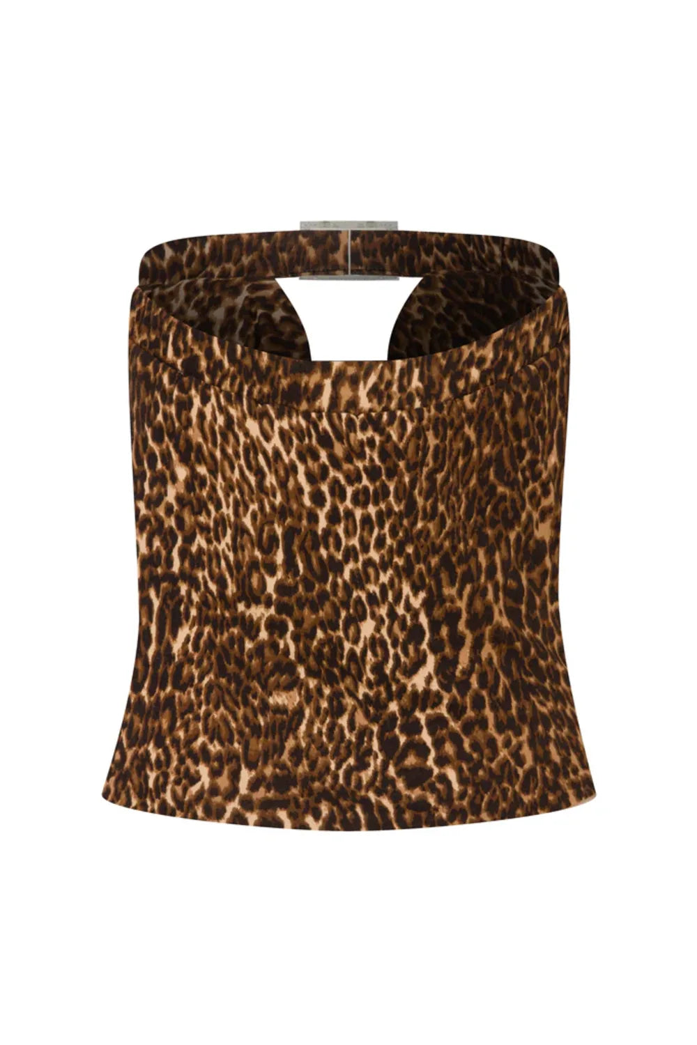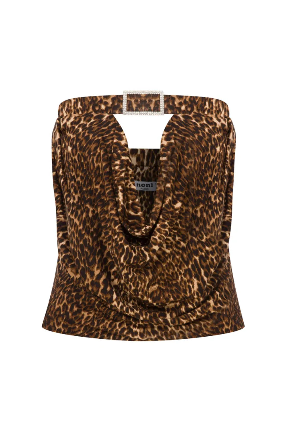 Taş toka detaylı dekolteli leopar straplez bluz.