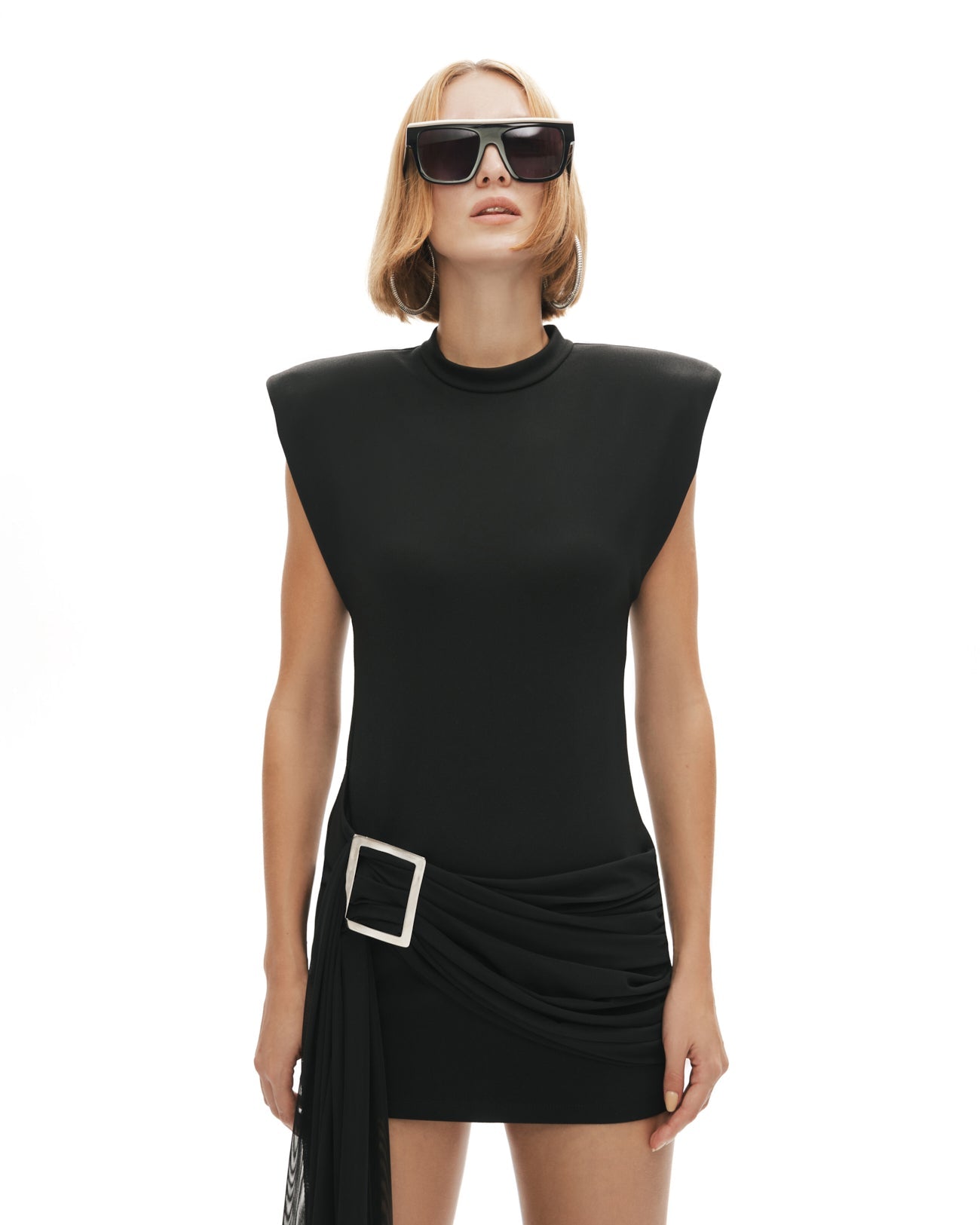 Kolsuz siyah vatkalı elbise güçlü siluetiyle öne çıkar. Yan kısmındaki büyük toka detayı ve tül aller, elbiseye drapeler ve hareket kazandırır. Mini boy tasarımıyla modern ve iddialı bir görünüm sunar. Özel davetler ve gece stilleri için şık bir seçenektir.
