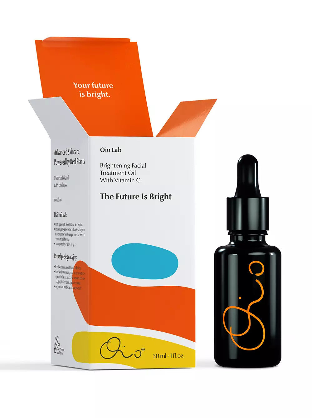 Oio Lab The Future is Bright Brightening Facial Treatment Oil With Vitamin C; organik, soğuk sıkım, %15 gibi yüksek bir yoğunlukta C Vitamini içeren, cildi aydınlatan güçlü bir botanik karışımdır. Çok yüksek stabilitede olan C Vitamini, güçlü bir antioksidandır ve kollajen uyarımını artıran, cildi canlandıran, cilt tonu eşitsizliğini azaltan özelliktedir. Yağ-Serum iksiri, cildin taze ve doğal renginin geri gelmesine, esnek ve nemli bir yapıya kavuşmasına yardımcı olur.  Deve dikeni, hodan, kızılcık ve yabani gül tohumu yağları (milk thistle, borage, cranberry ve wild rosehip seed oil) ile ultra güçlendirilmiş C Vitamini bileşimi sayesinde elde edilen bu benzersiz iksir, cilt yenileme süreçlerini başarı ile destekler.