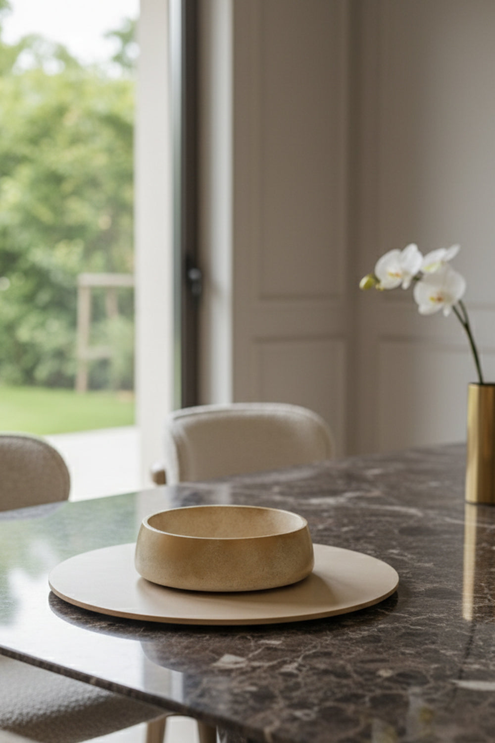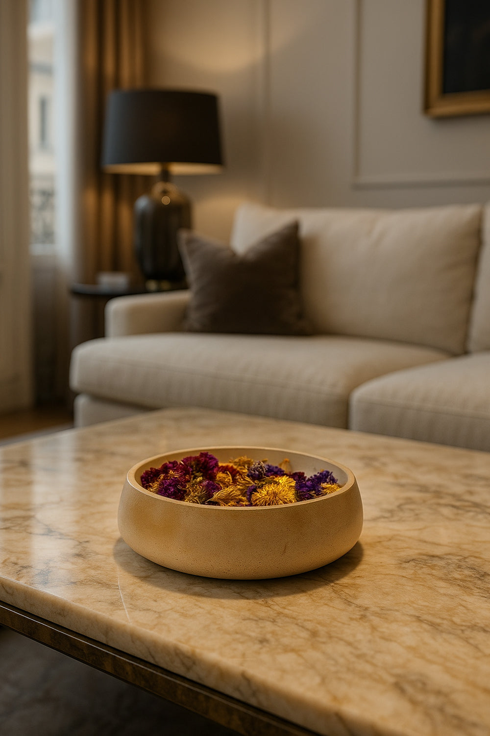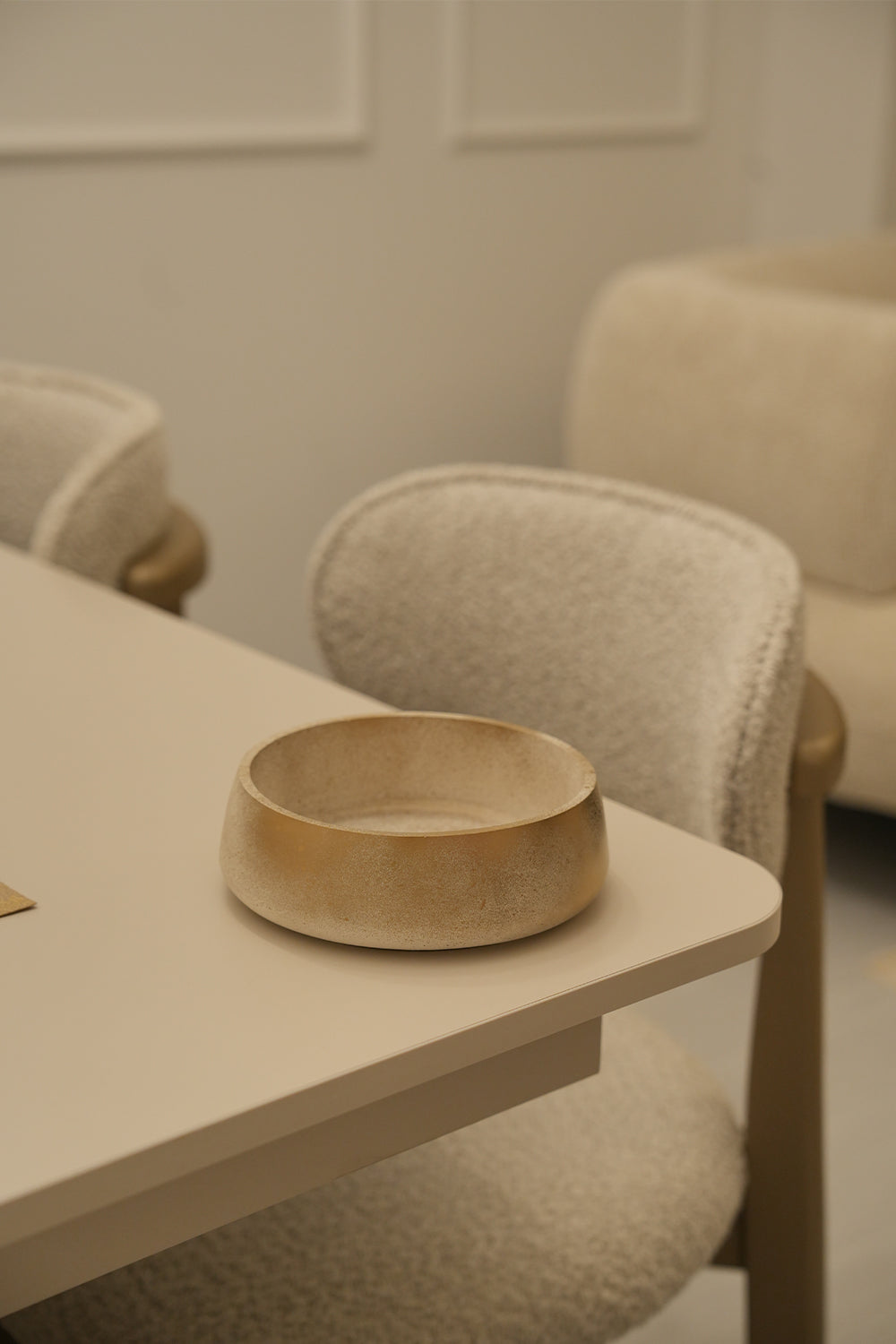 Derin Form Kase, yalın çizgileri ve dengeli formuyla mekâna güçlü bir varlık katar. Minimal ve zamansız tasarımı, doğanın sadeliğini hatırlatan saf bir estetik sunar. Dayanıklı malzemesiyle özenle üretilen bu kase, hem işlevsel hem de sanatsal bir obje olarak yaşam alanlarınıza eşlik eder.