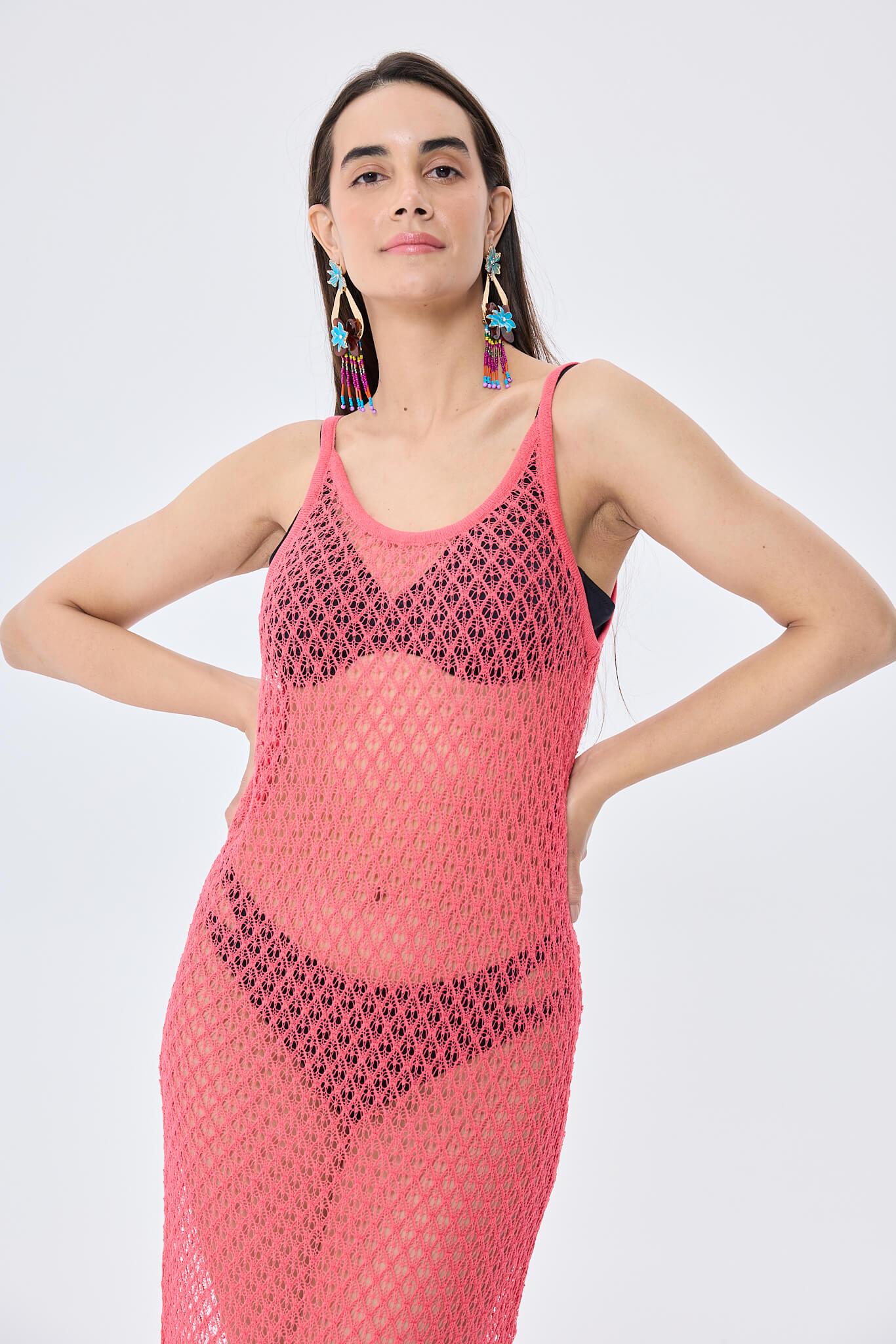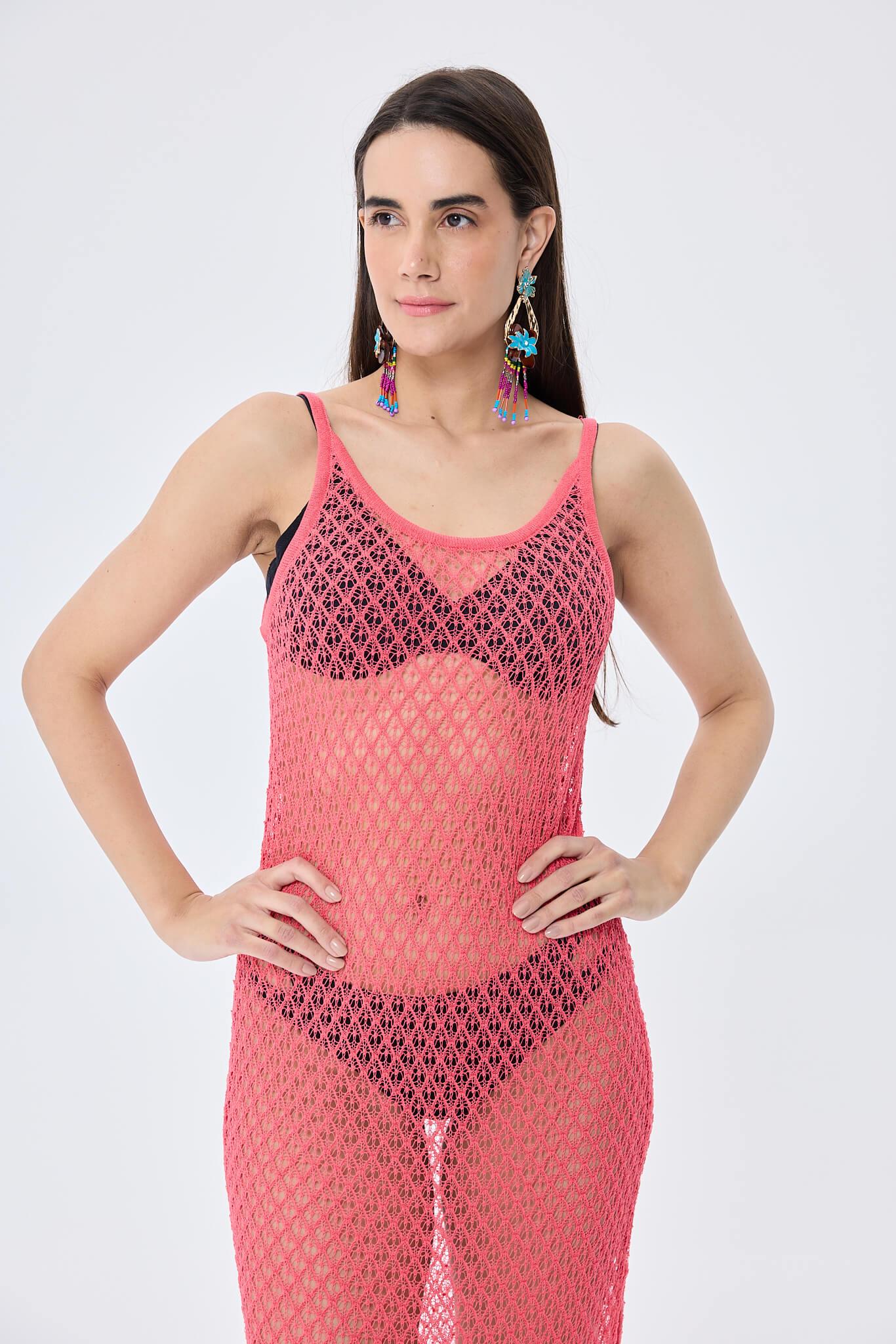 Ajur örgü detaylarına sahip, fit kesimli ve ayarlanabilir askılı kadın uzun triko plaj elbisesi ile plajın şıklığını keşfedin. Stilinizi tamamlayacak mükemmel bir parça.