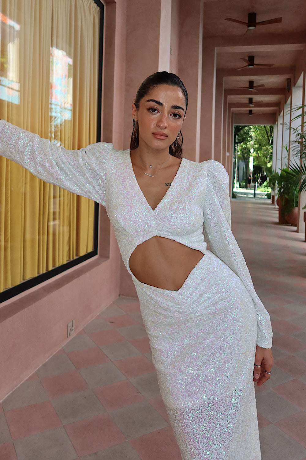 En şık davetlerin ve kokteyl gecelerinin göz alıcı parçası.; Cut-out detayı ve özel formu ile zarif, slim-fit bir siluet yaratır.; Işıltılı dokusu, Pulpayet kalitesi ve vatka omuzlarıyla güçlü ve cool bir görünüm sağlar.; ✨Model XS beden giymektedir.