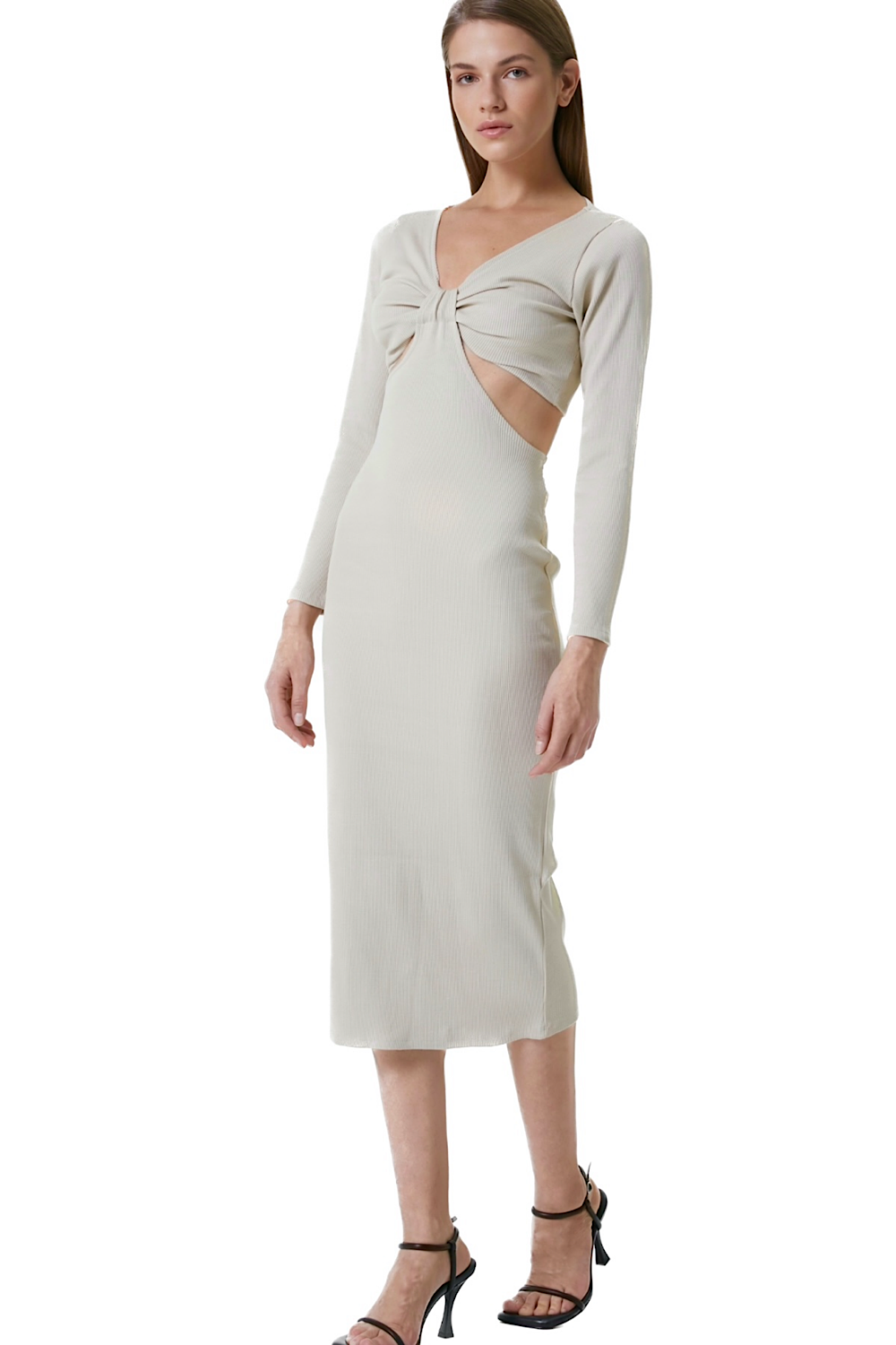 Likralı casual kumaştır.Boyun ve bel kısmında cut-out detaylı midi elbisedir.