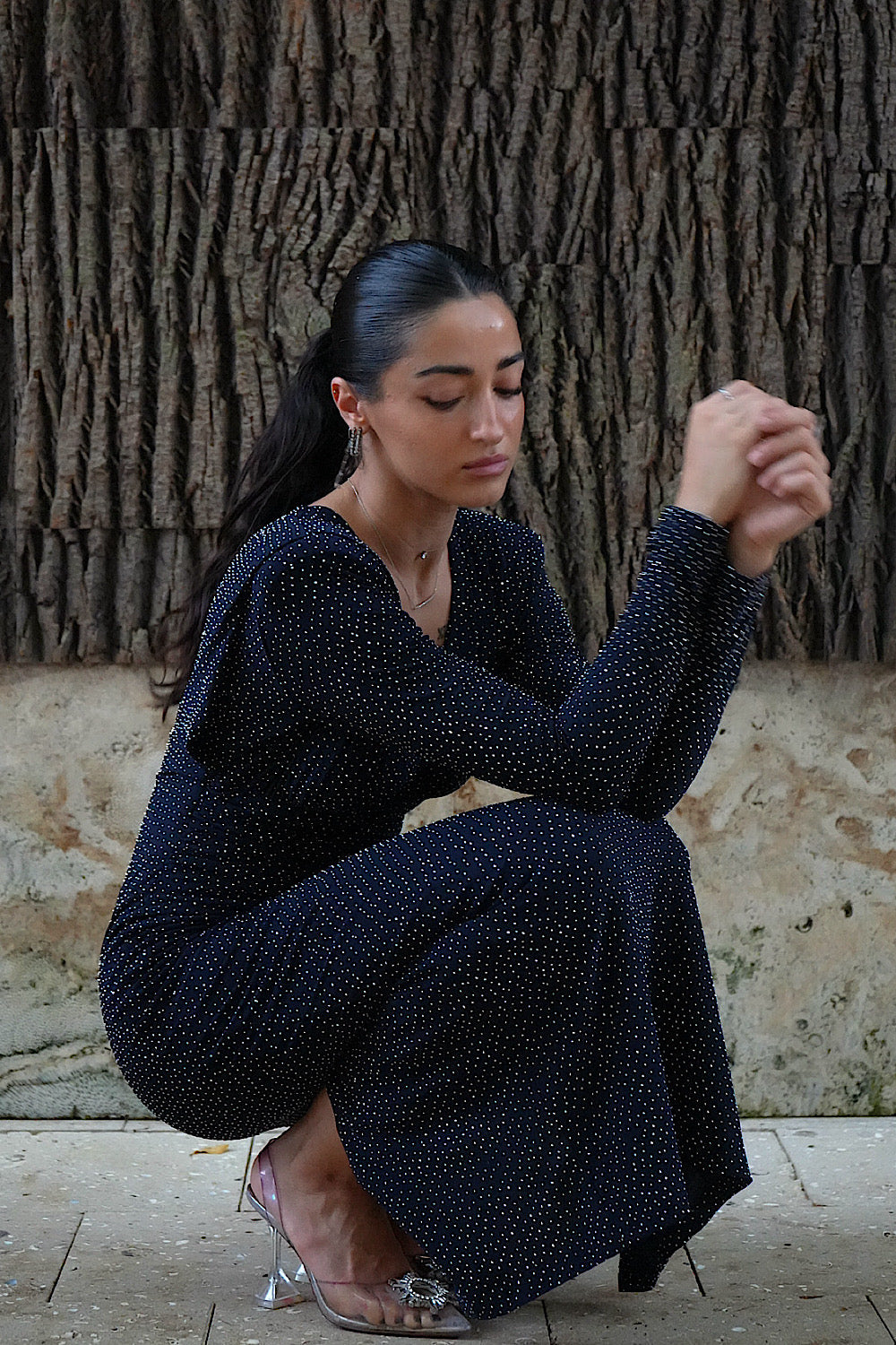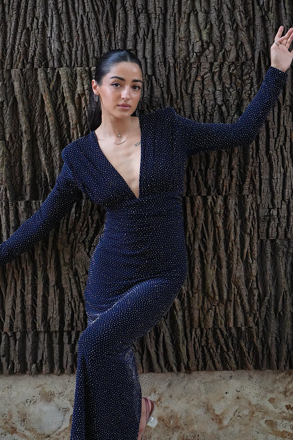 Kadın Lacivert Taşlı Dik Yaka Vatkalı Midi Elbise Abiye