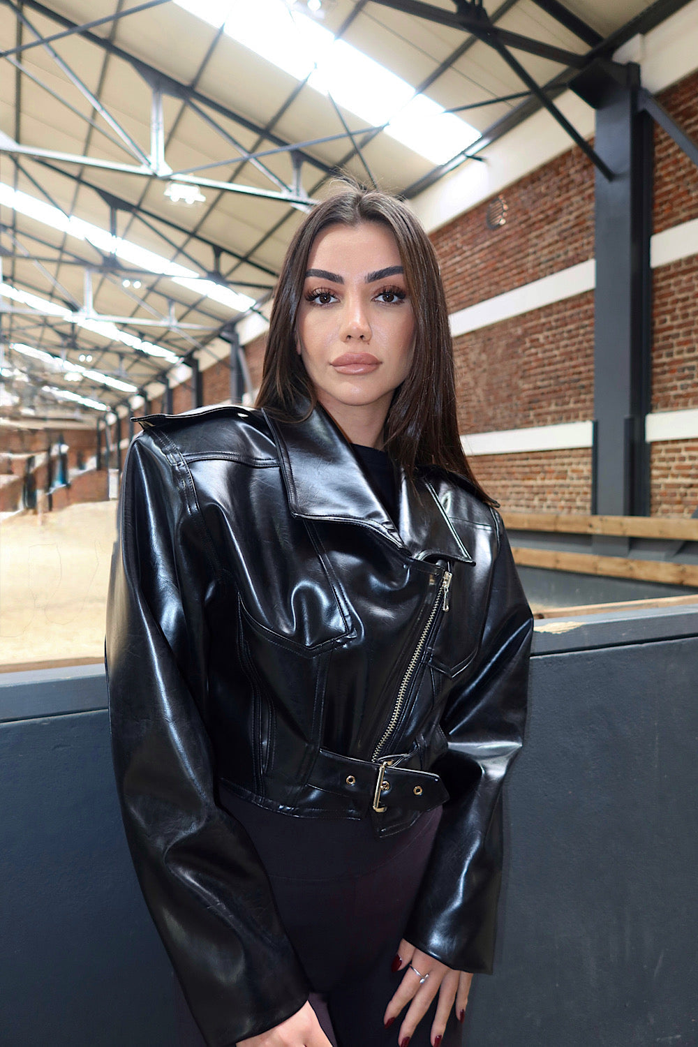 Kadın Siyah Kalın Vatkalı Belden Kemerli Suni Deri Kısa Ceket Der01
