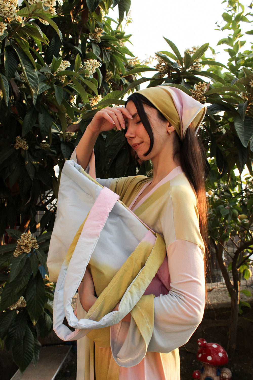 AURI deseni, Daydreamer Koleksiyonu’nun içsel akış fikrinden ilham alan yeşil, açık mavi ve yumuşak pembe tonlarının kumaş yüzeyinde organik biçimde birbirine karışmasıyla oluşur. Renklerin yönsüz hareketi, hayal hâlinin hafif bulanık ama rahatlatıcı hissini taşır.