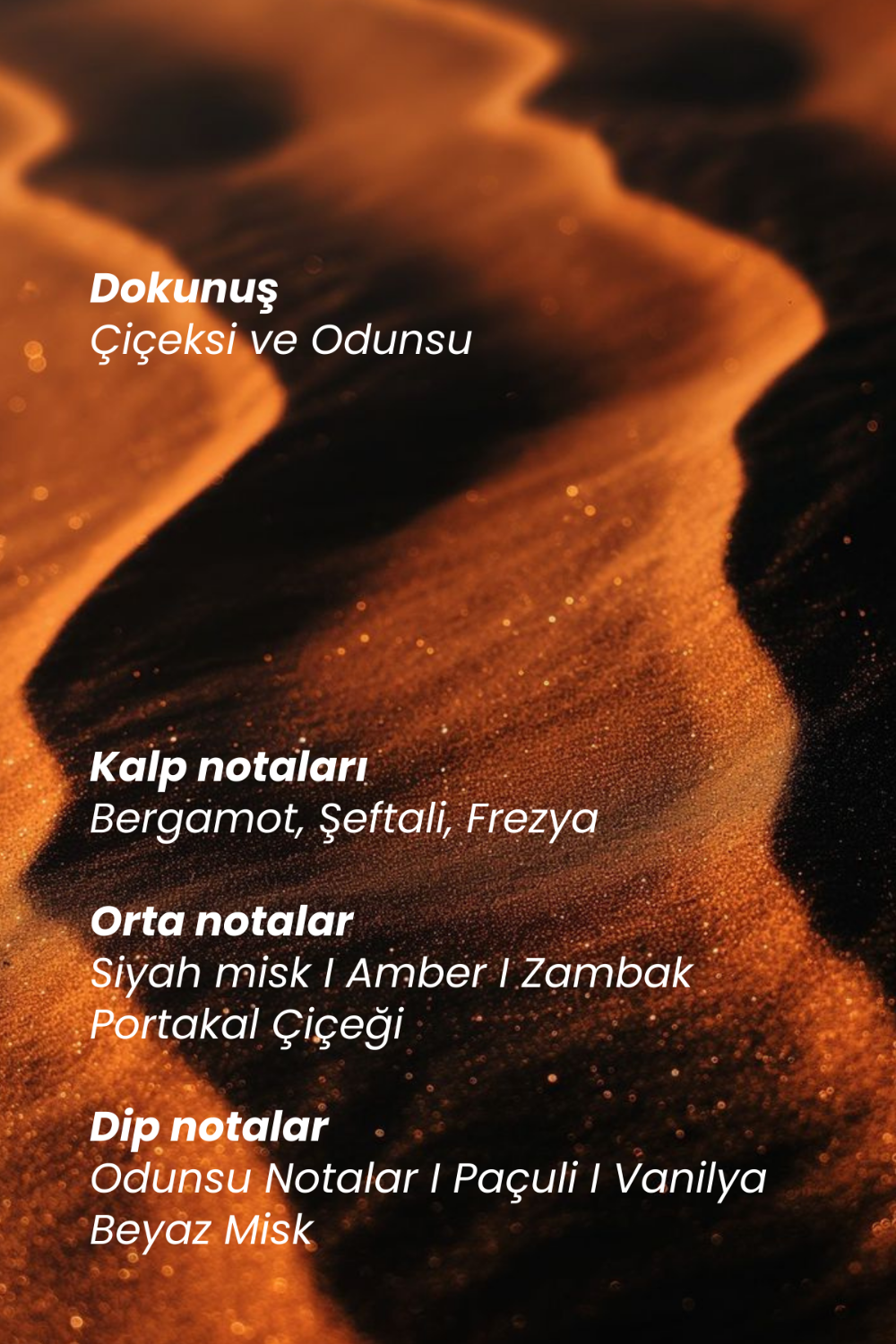 Saç parfümümüz, kalp notalarında bergamot, şeftali ve frezya ile ferahlık sunarken; orta notalarda siyah misk, amber, zambak ve portakal çiçeği ile zarif bir denge sağlar. Dip notalarda ise odunsu notalar, Paçuli, Vanilya ve Beyaz Misk ile derinlik ve kalıcılık kazandırır.