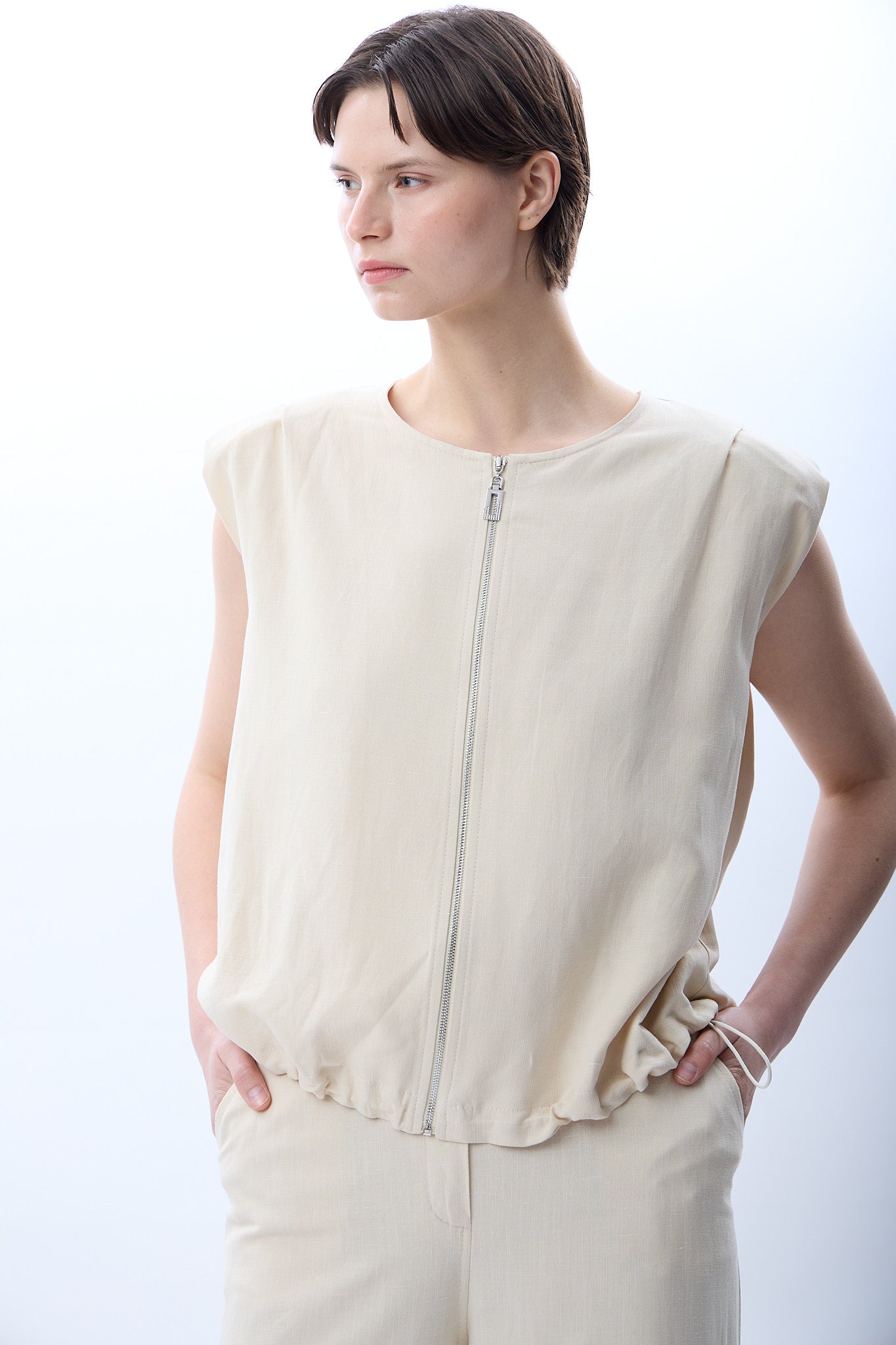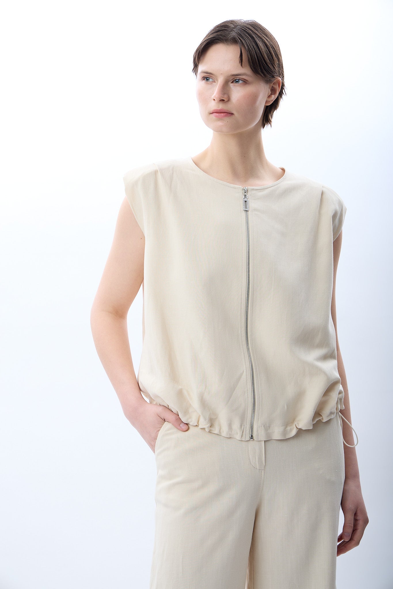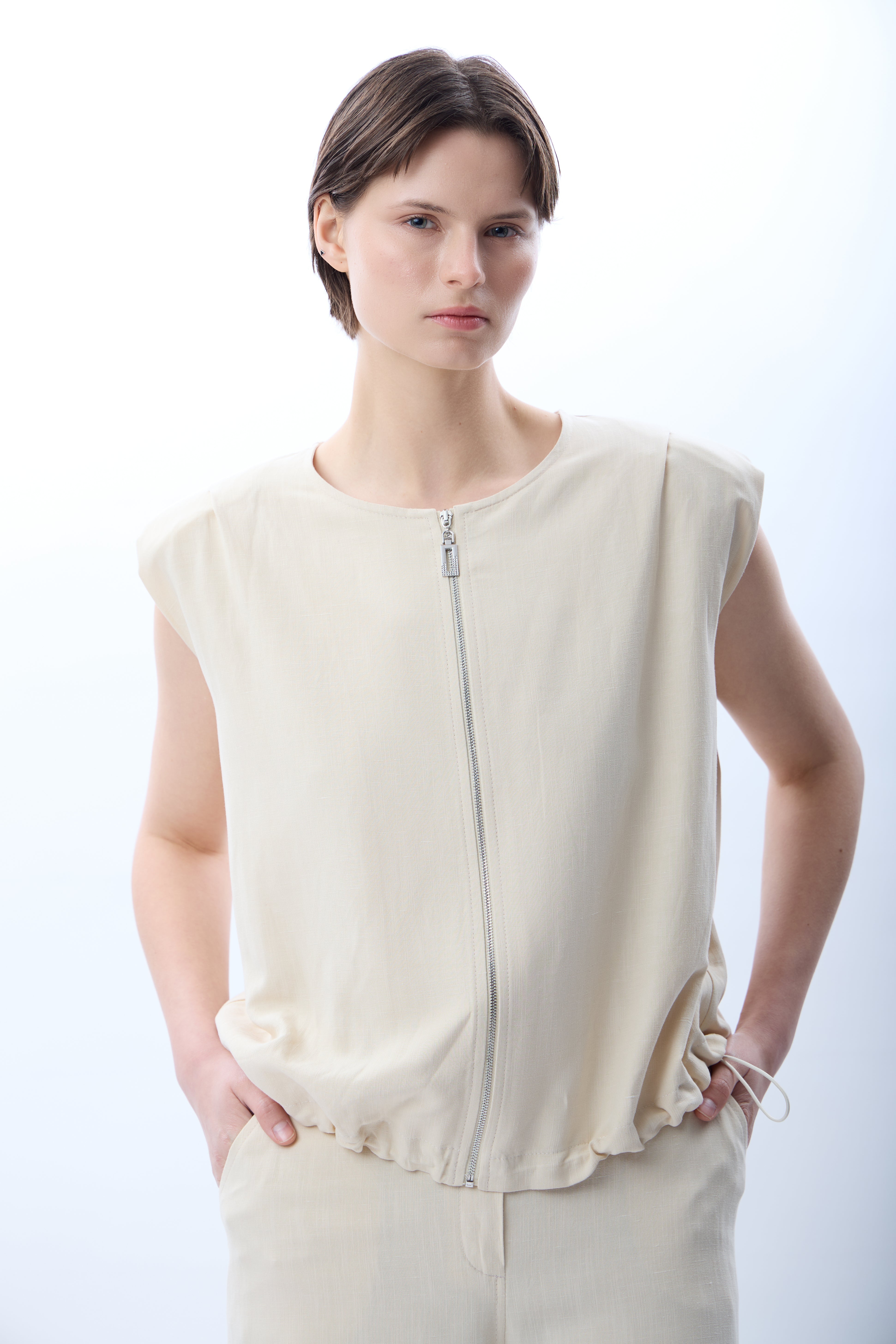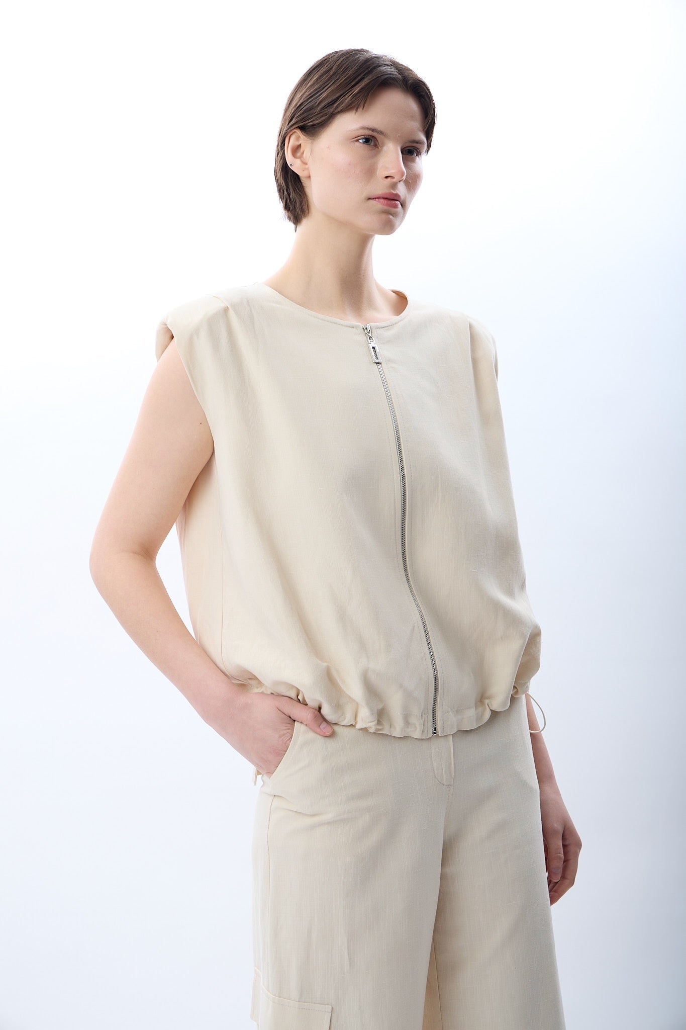 Fermuarlı Cepli Keten Karışımlı Yelek – %71 Viskon, %29 Keten